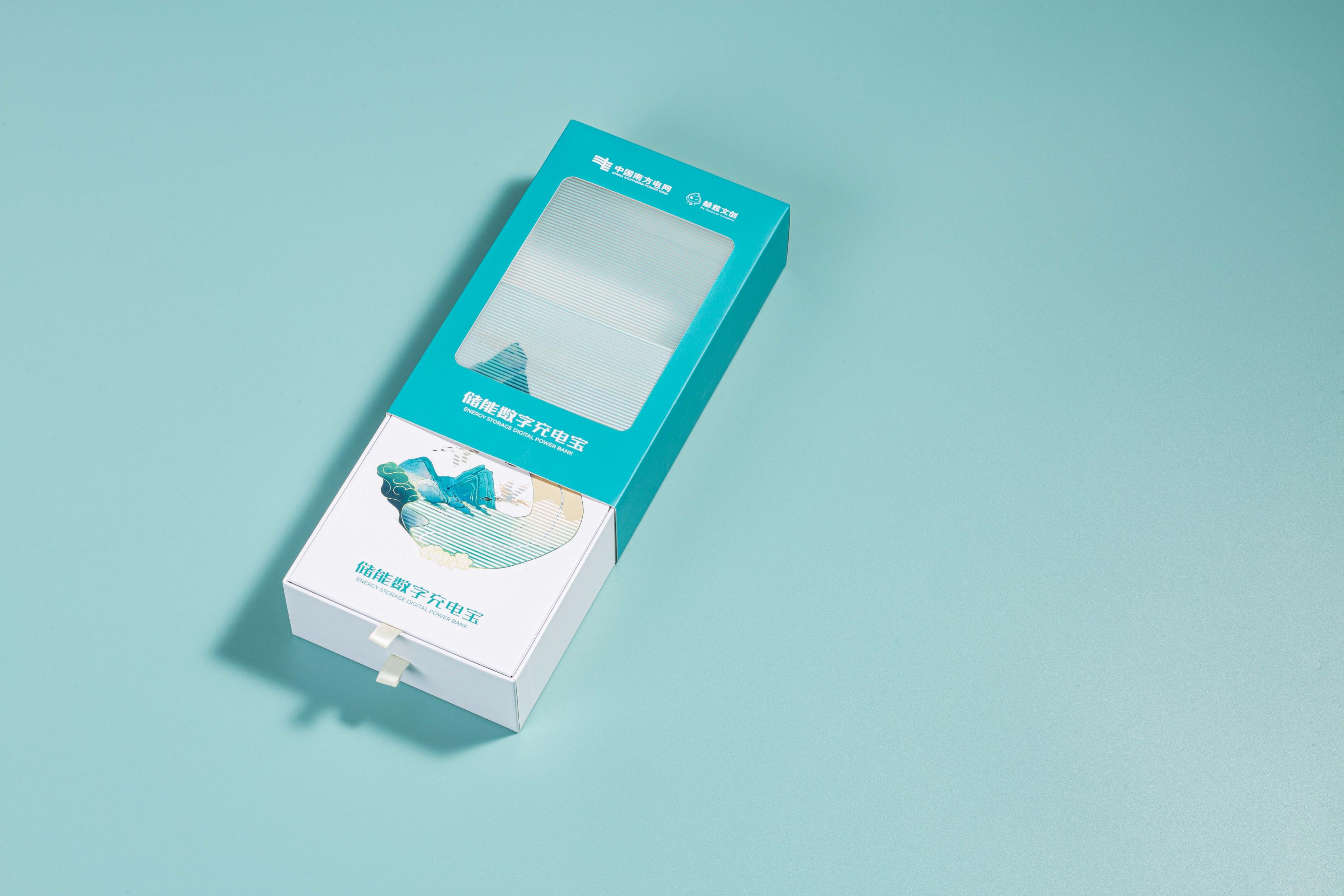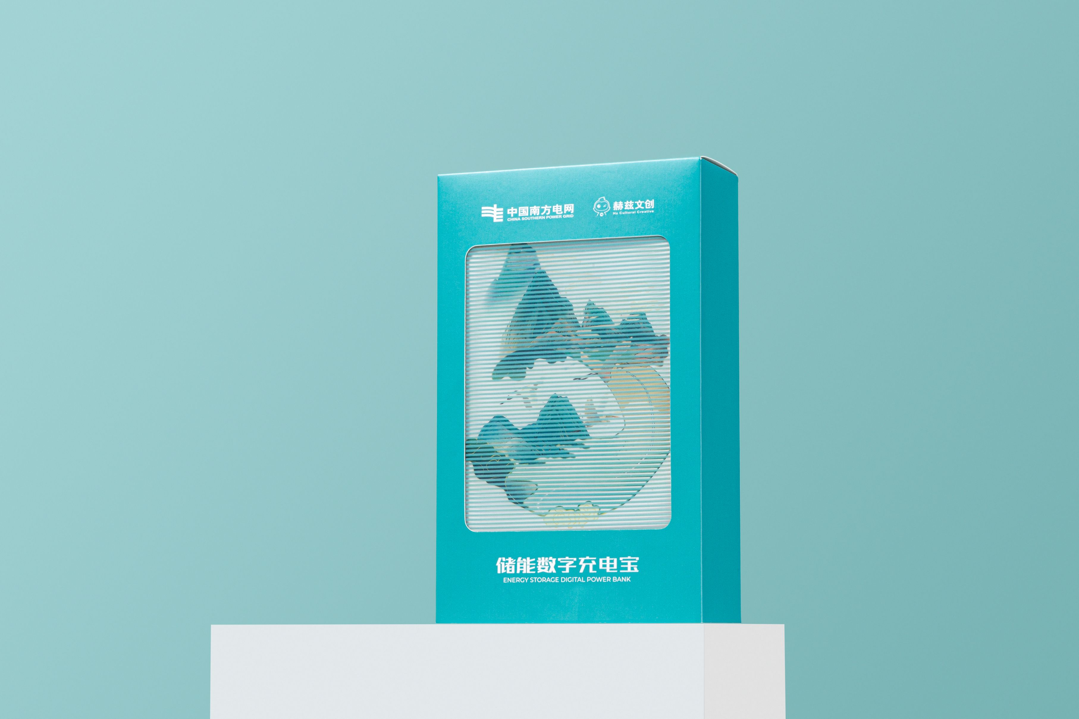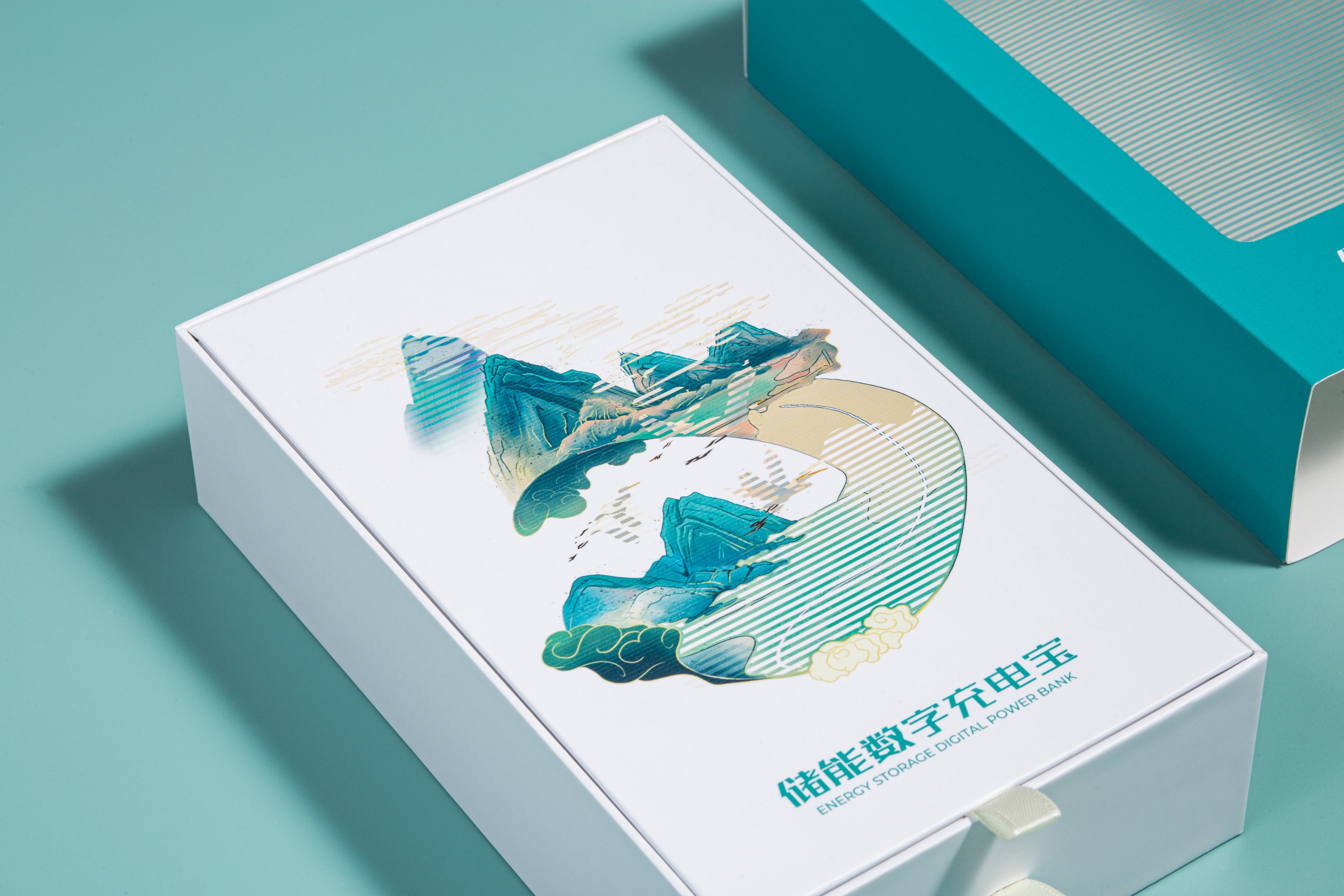 The power bank packaging, designed for China Southern Power Grid, represents a harmonious blend of a creative structure and China-chic paintings. Its drawer-style box incorporates a sophisticated Moiré pattern, providing easy access to the power bank inside while subtly mirroring the operational mechanics of a pumped storage power station. Additionally, the flip cover on the inner box further enhances the overall interactive experience.
