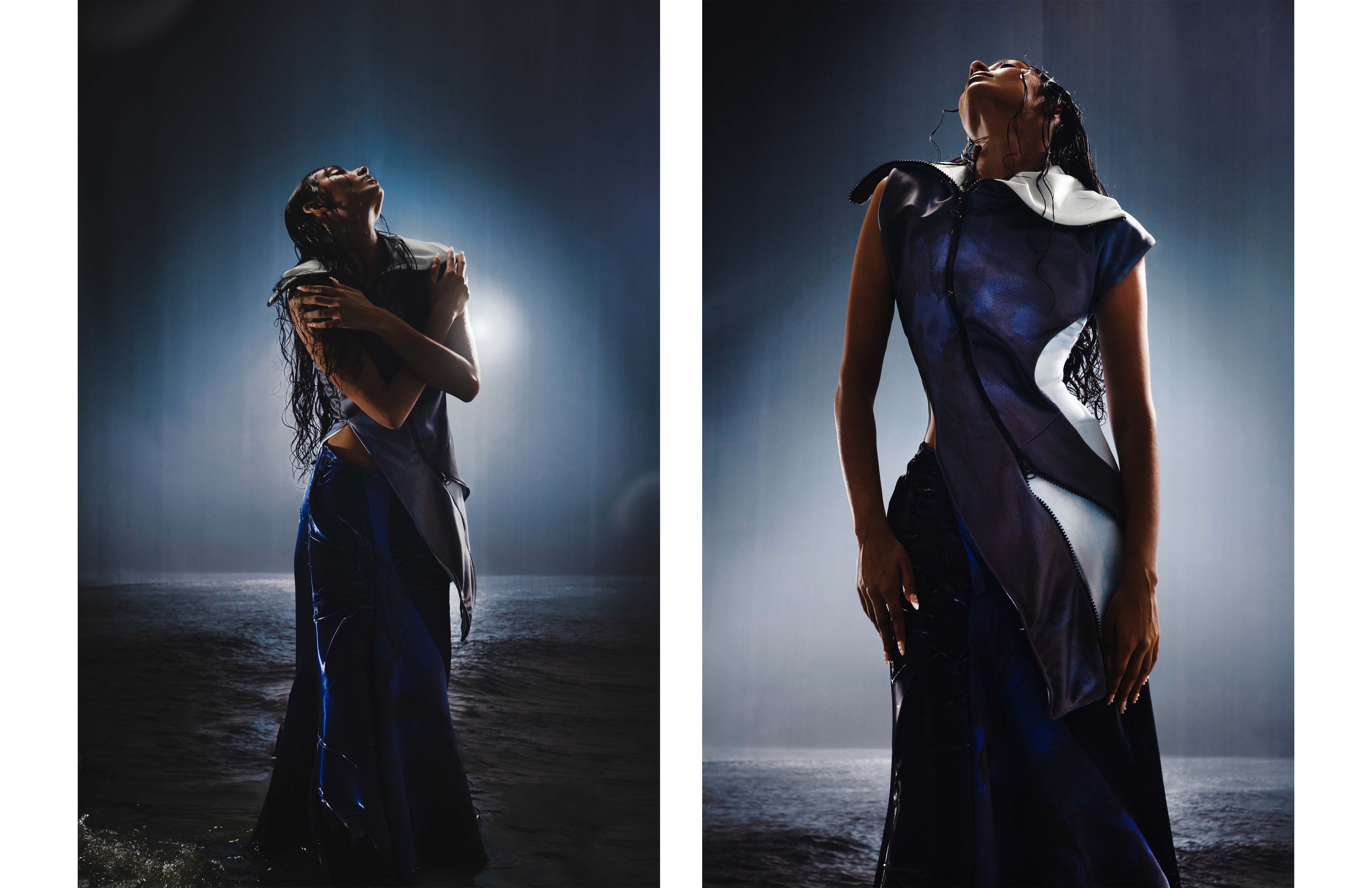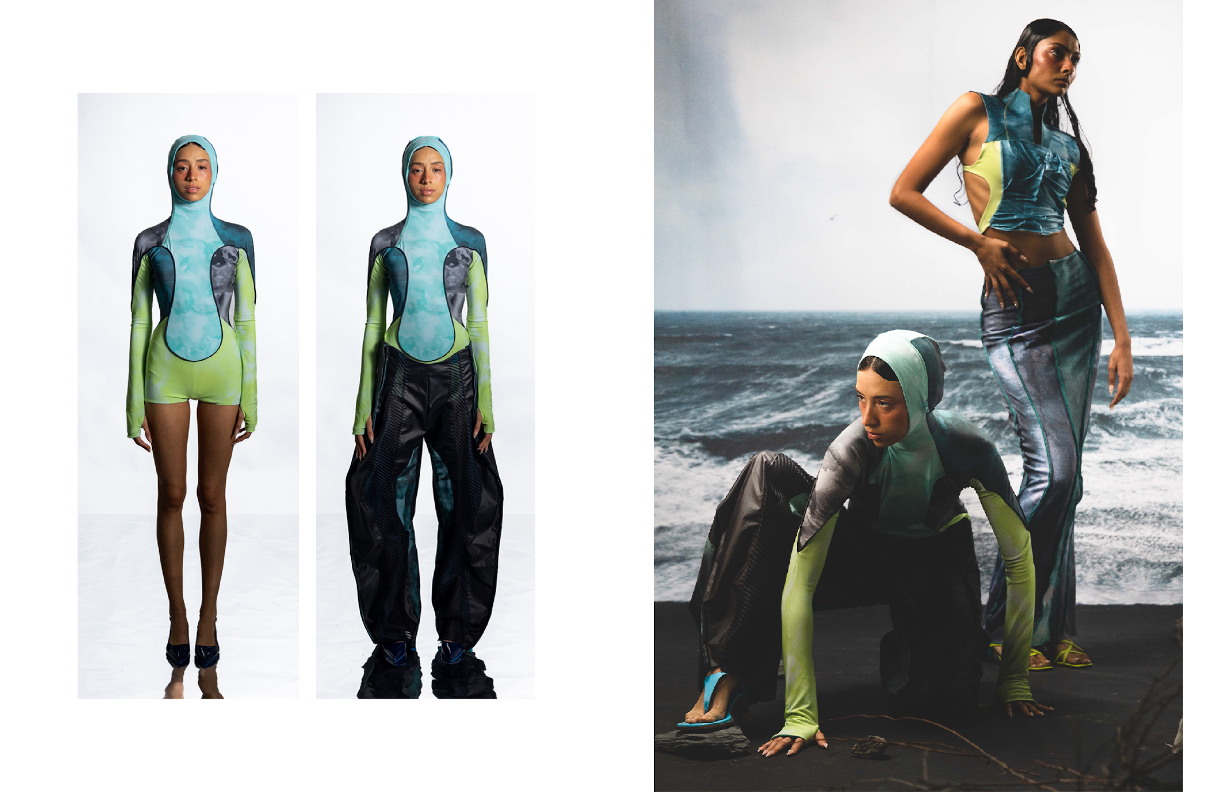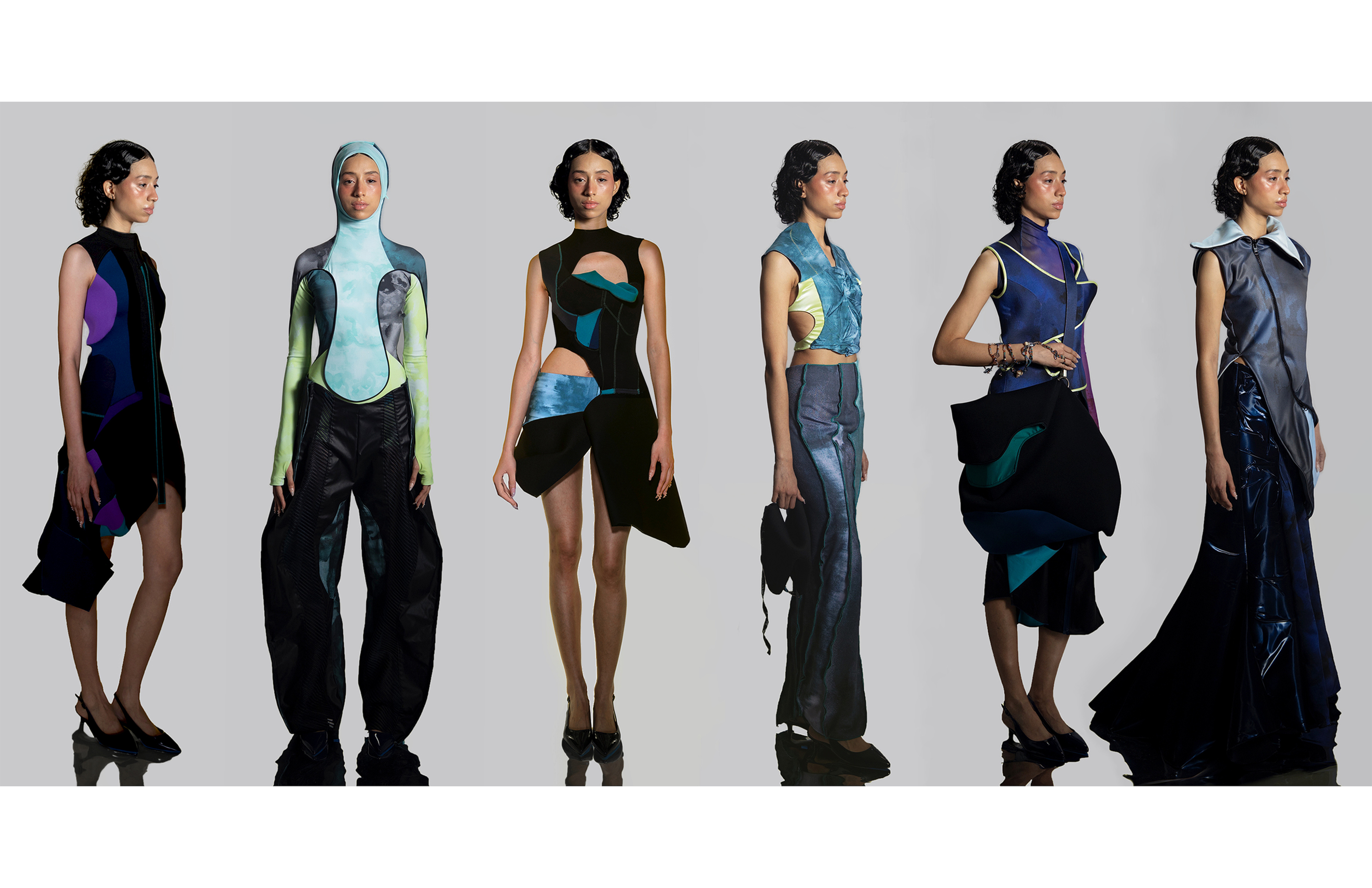 Avantika's innovative approach shines through, particularly in Looks 1 and 3, which are entirely fashioned from second-hand damaged scuba wetsuits sourced locally from New York City dive shops. Through this resourceful transformation of damaged materials into captivating garments, she subtly advocates for sustainability and eco-consciousness.