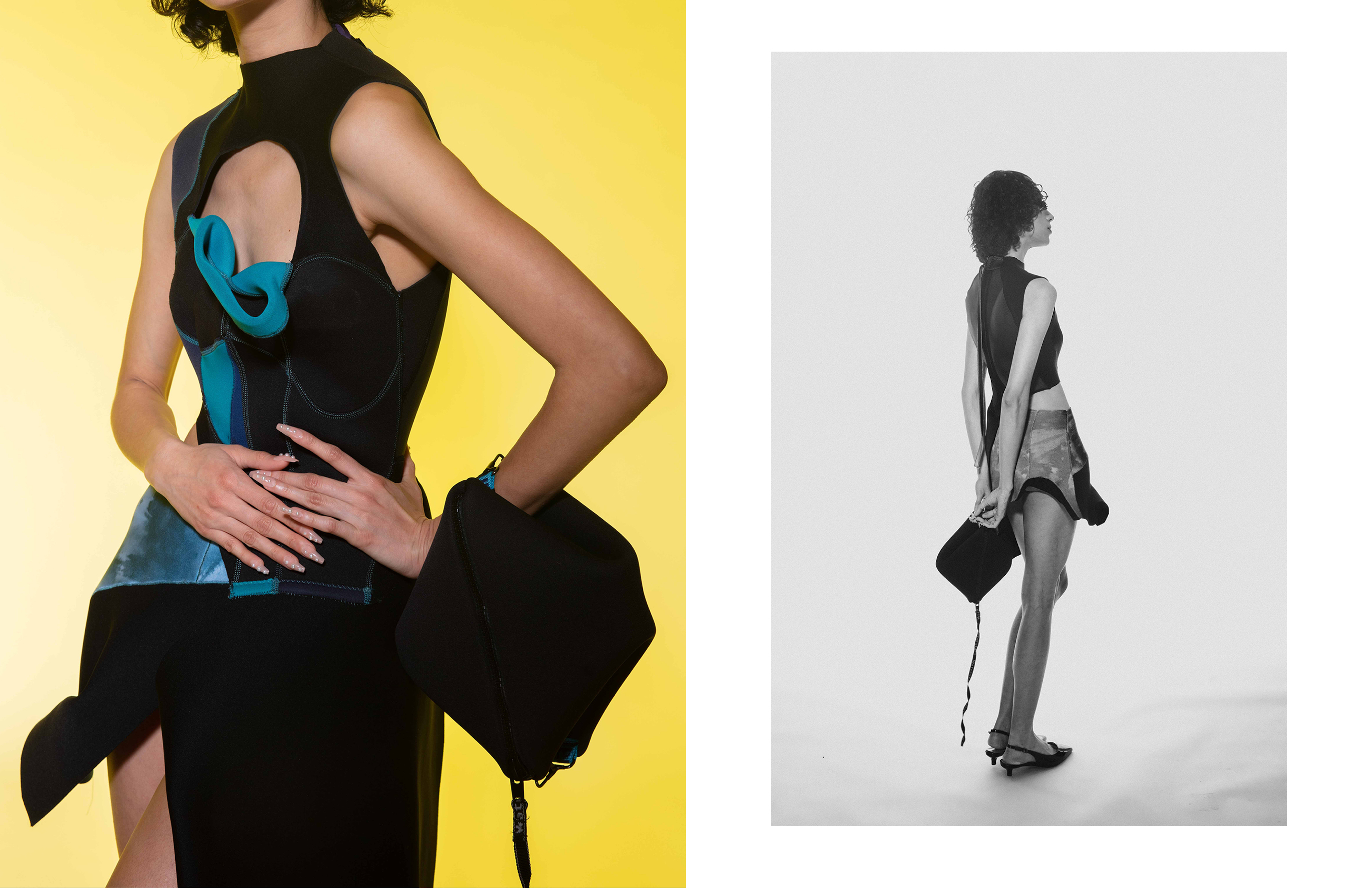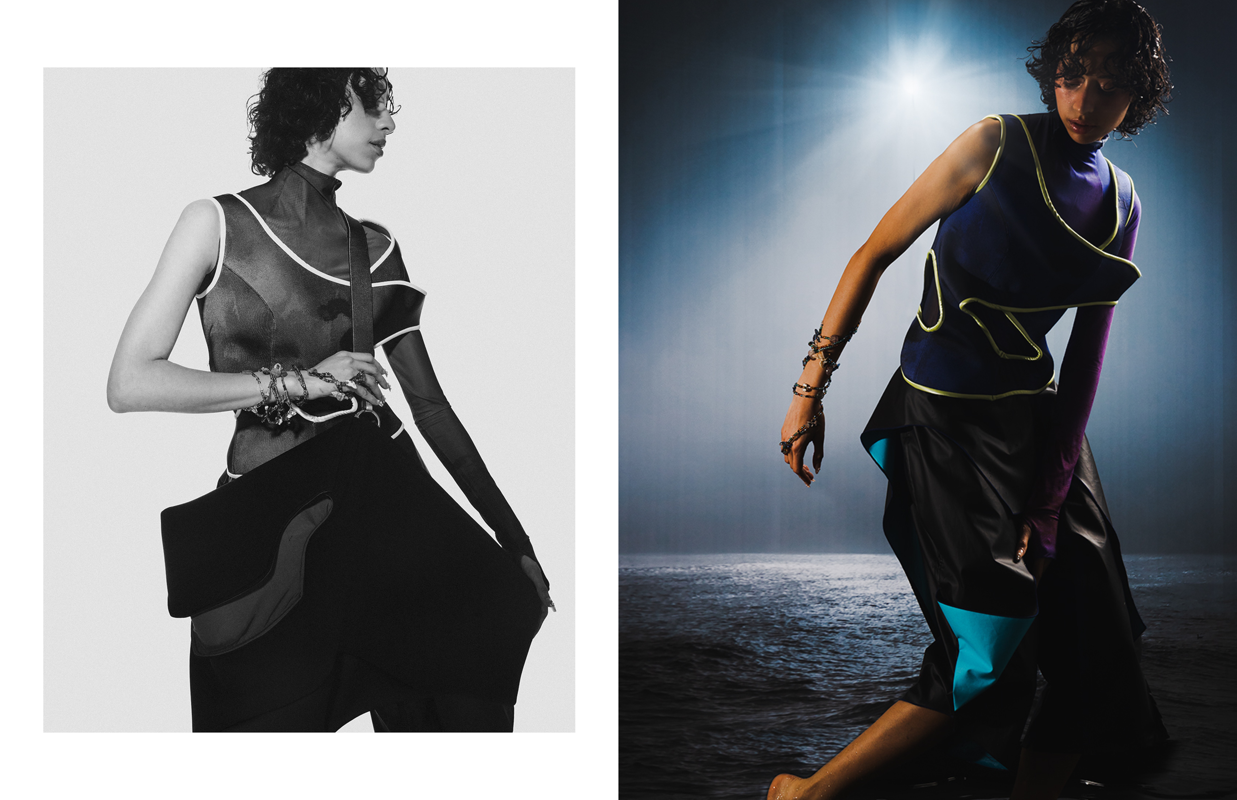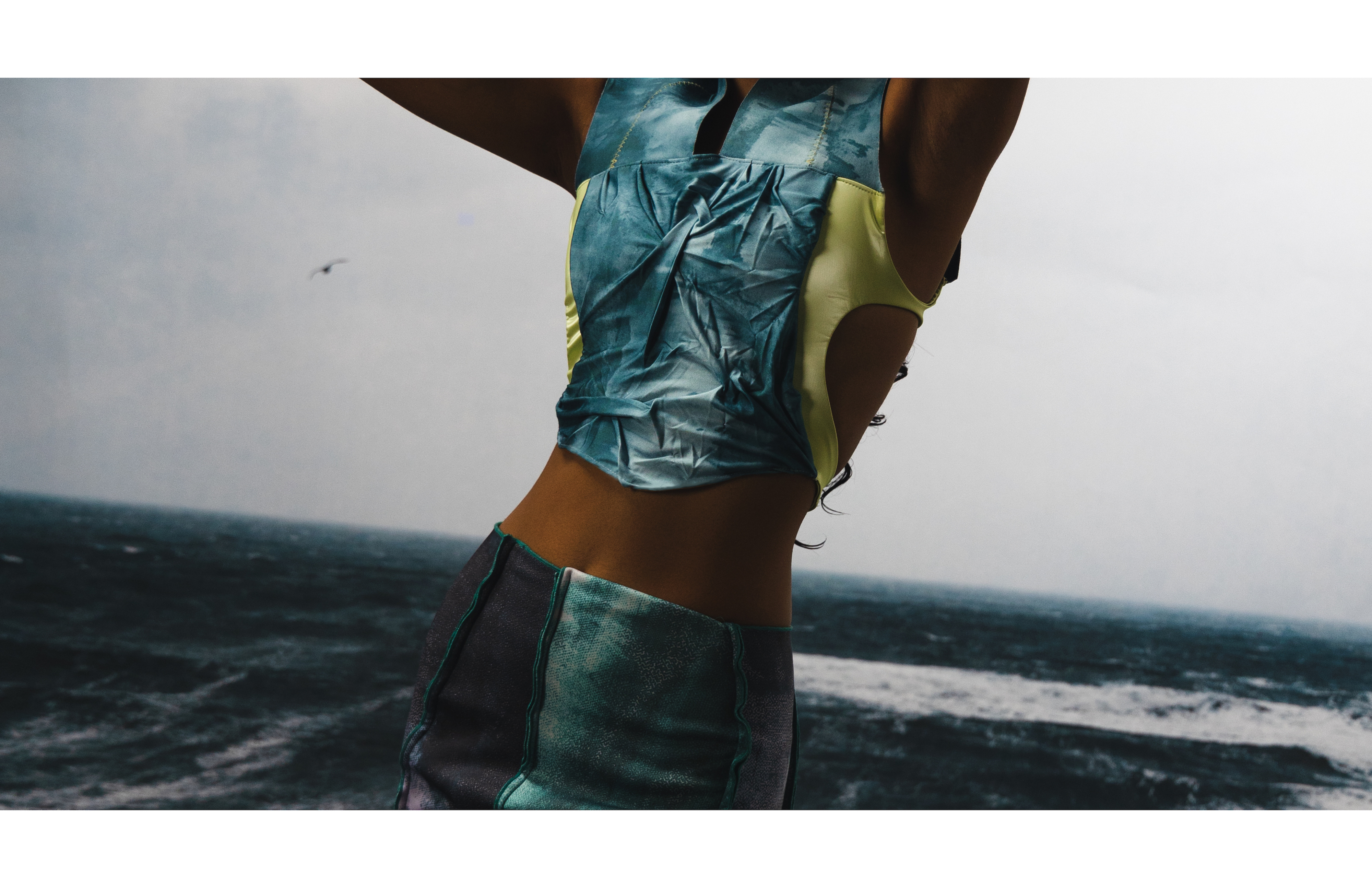 "Whispers in the Current" presents a versatile 6-look collection comprising interchangeable separates, bags, and jewellery. Bags were designed and produced in collaboration with Christian Olarte. The pieces are meticulously crafted to prioritise wearer comfort and reflect the fluidity and freedom experienced underwater. Blending elements from the world of scuba diving, the collection seamlessly integrates sportswear influences, promoting movement and flexibility, perfectly mirroring the dynamism of an active lifestyle.