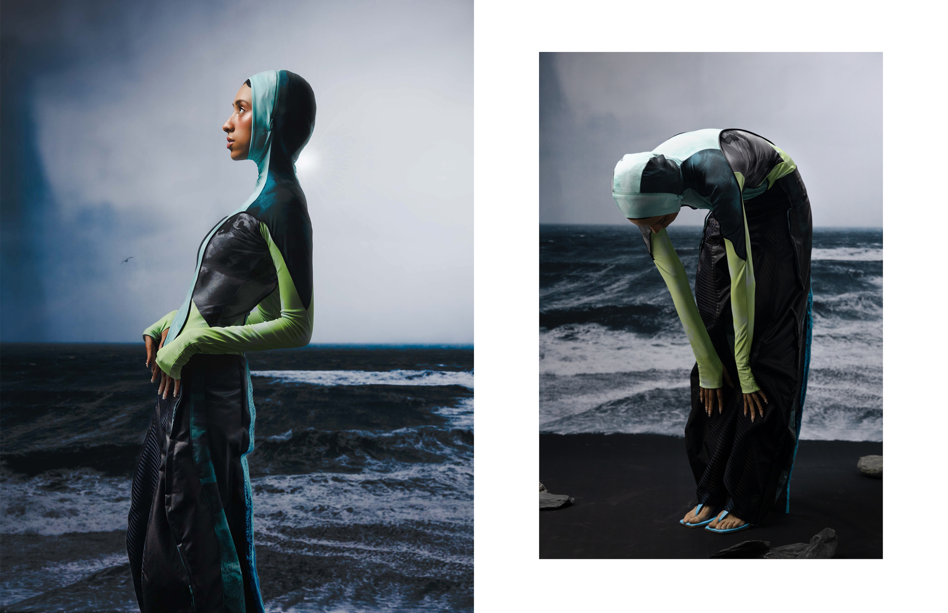 "Whispers in the Current" presents a versatile 6-look collection comprising interchangeable separates, bags, and jewellery. Bags were designed and produced in collaboration with Christian Olarte. The pieces are meticulously crafted to prioritise wearer comfort and reflect the fluidity and freedom experienced underwater. Blending elements from the world of scuba diving, the collection seamlessly integrates sportswear influences, promoting movement and flexibility, perfectly mirroring the dynamism of an active lifestyle.