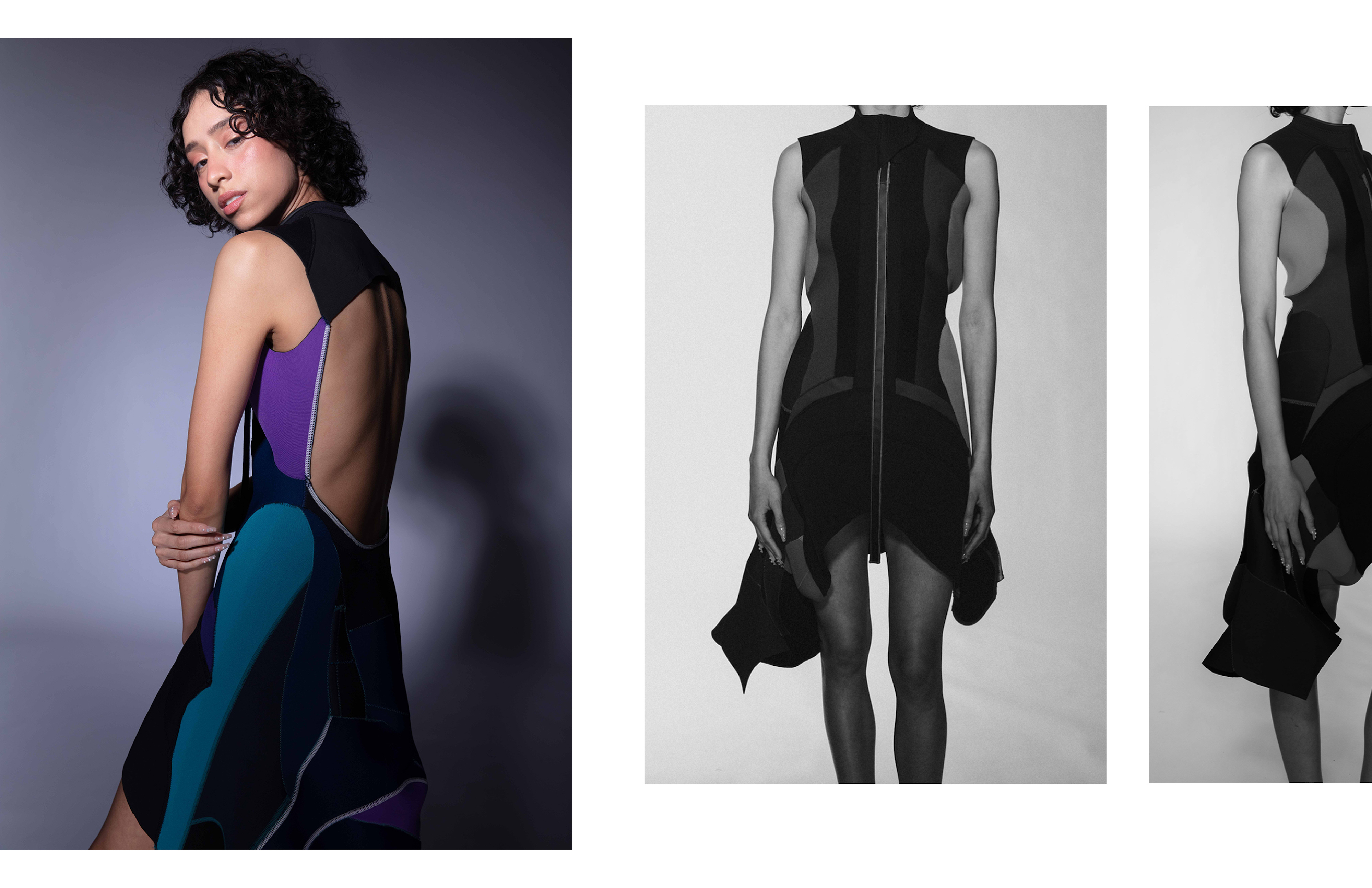 Avantika's innovative approach shines through, particularly in Looks 1 and 3, which are entirely fashioned from second-hand damaged scuba wetsuits sourced locally from New York City dive shops. Through this resourceful transformation of damaged materials into captivating garments, she subtly advocates for sustainability and eco-consciousness.
