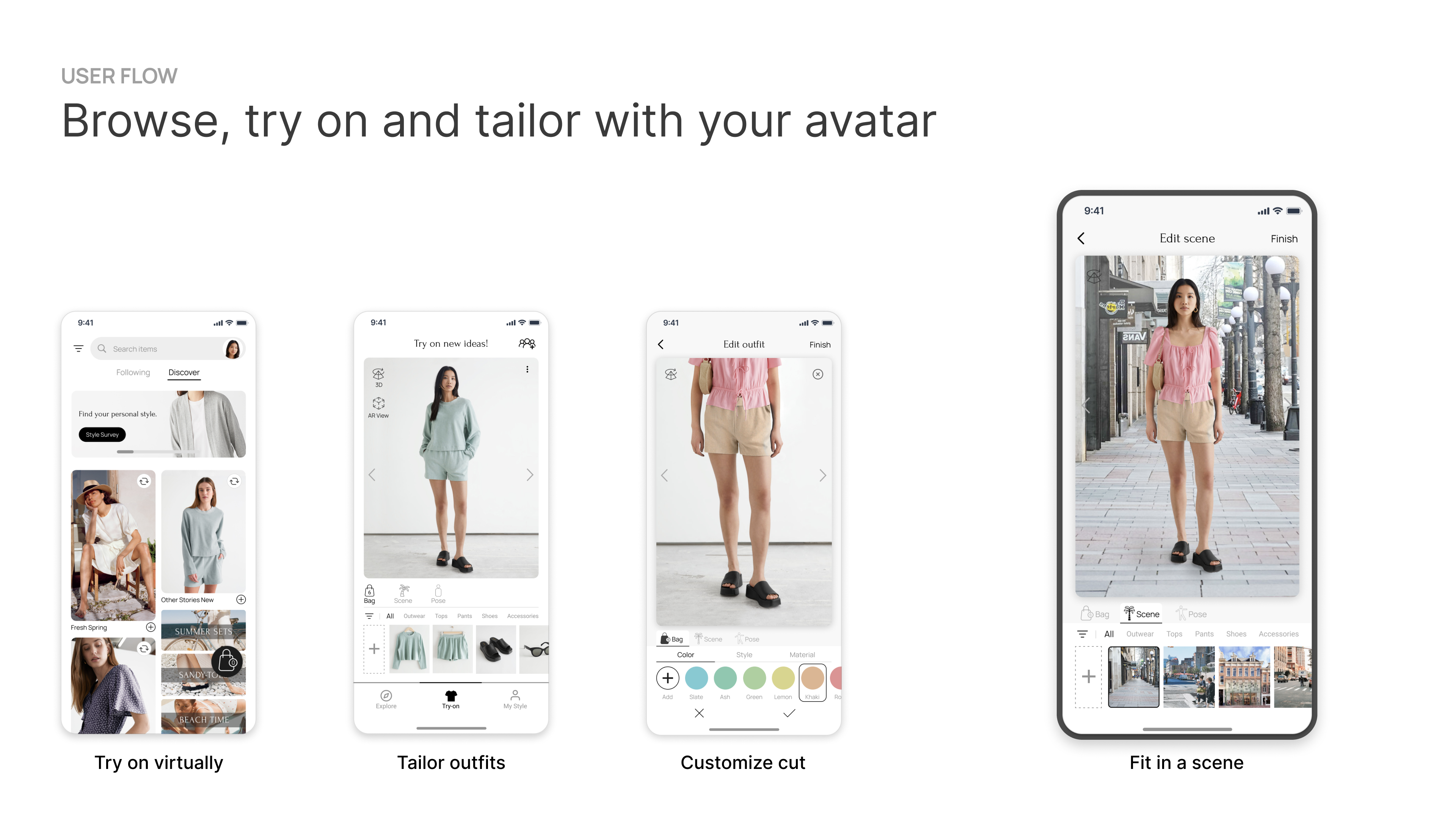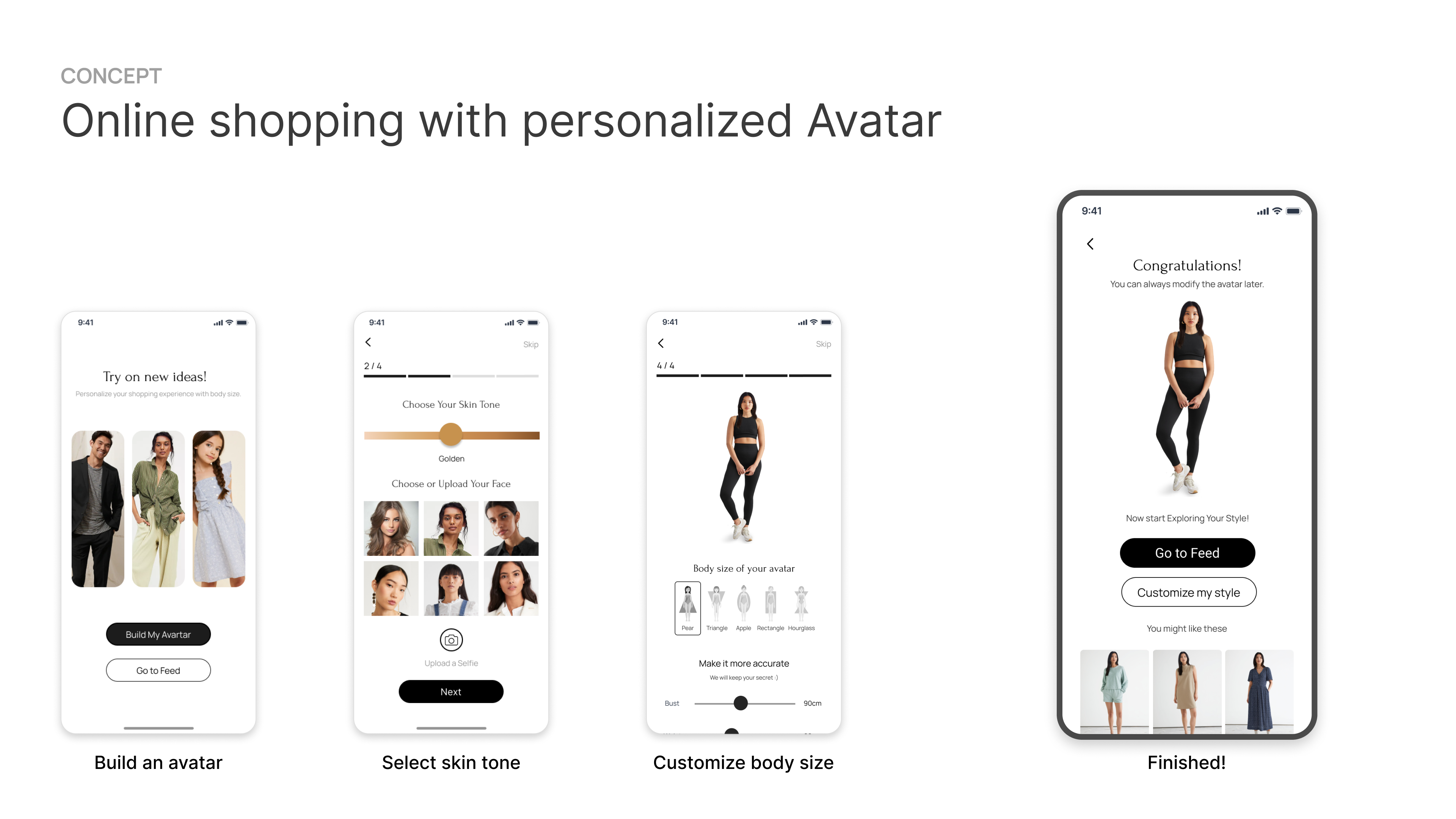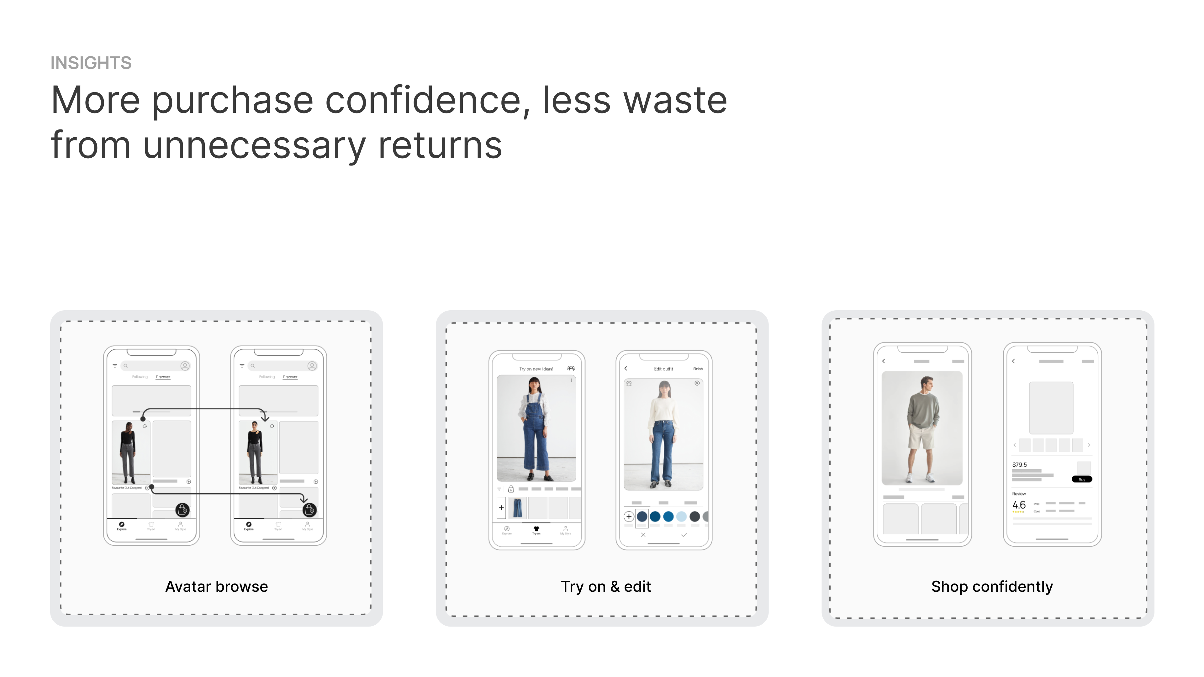Our solution centers on a personalized avatar-based virtual try-on platform that tailors to individual preferences and body shapes. By combining matured 3D avatar modeling and well-considered user experience design, we're reshaping the online shopping journey from one of uncertainty to empowerment.