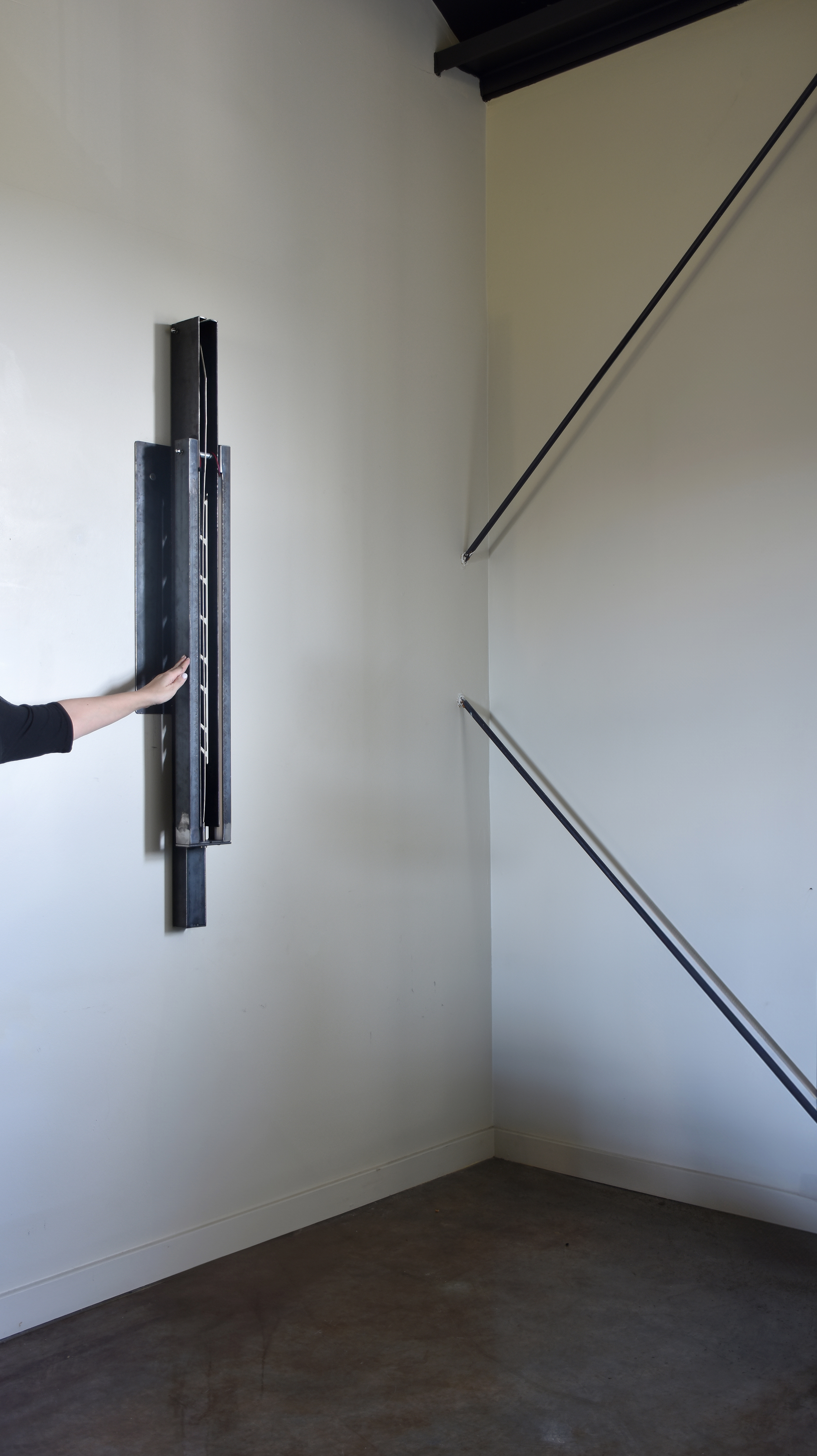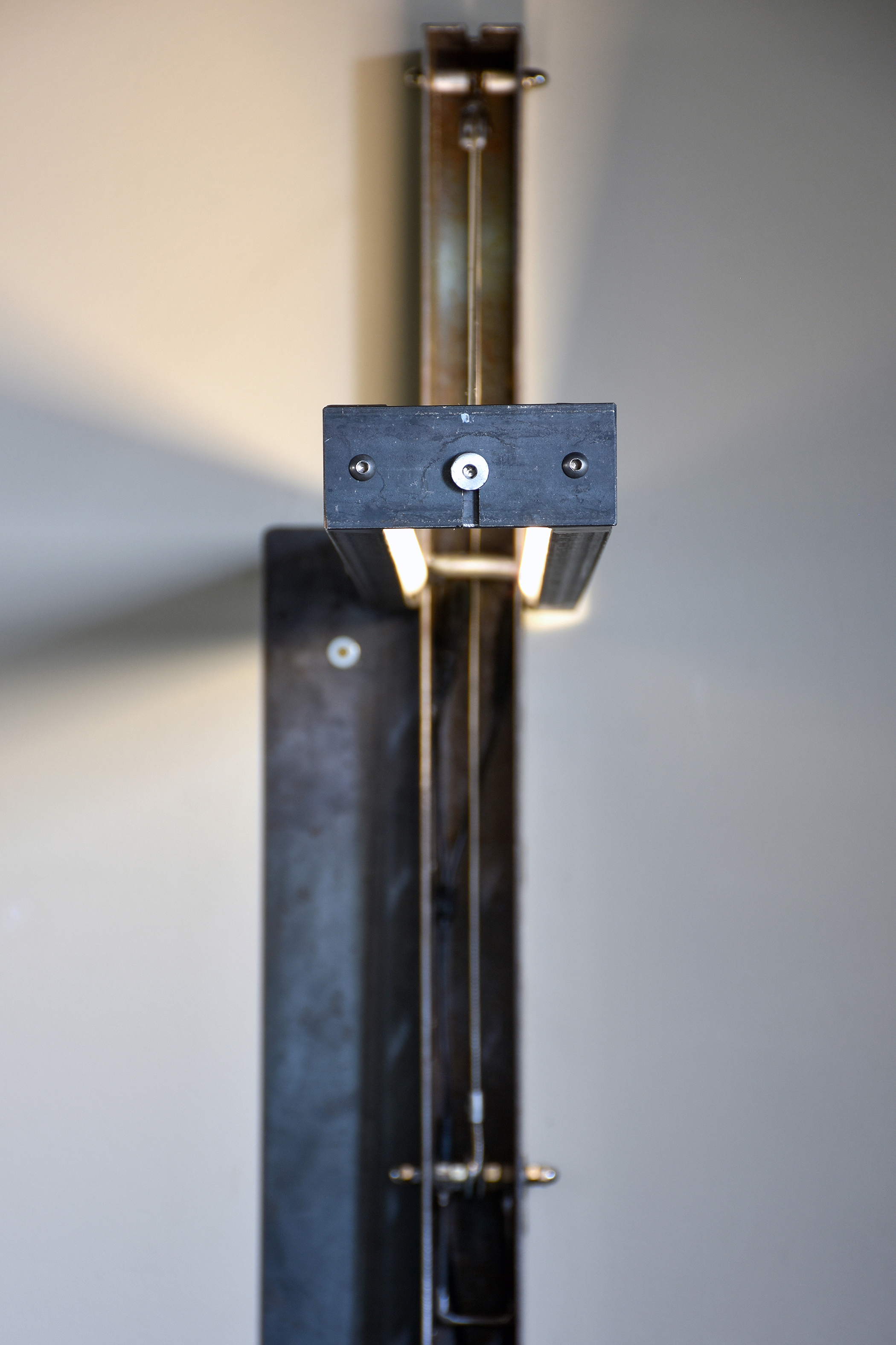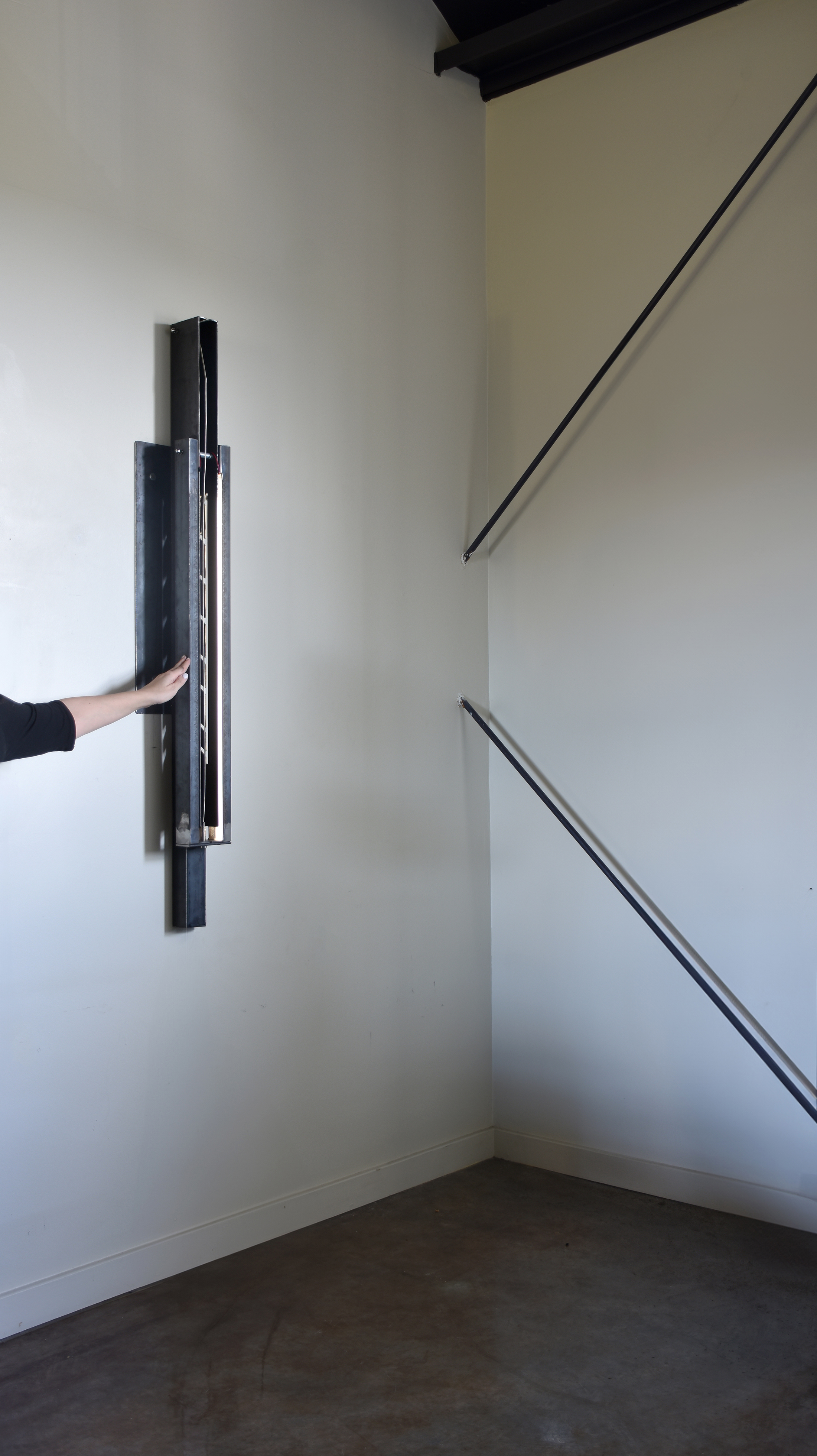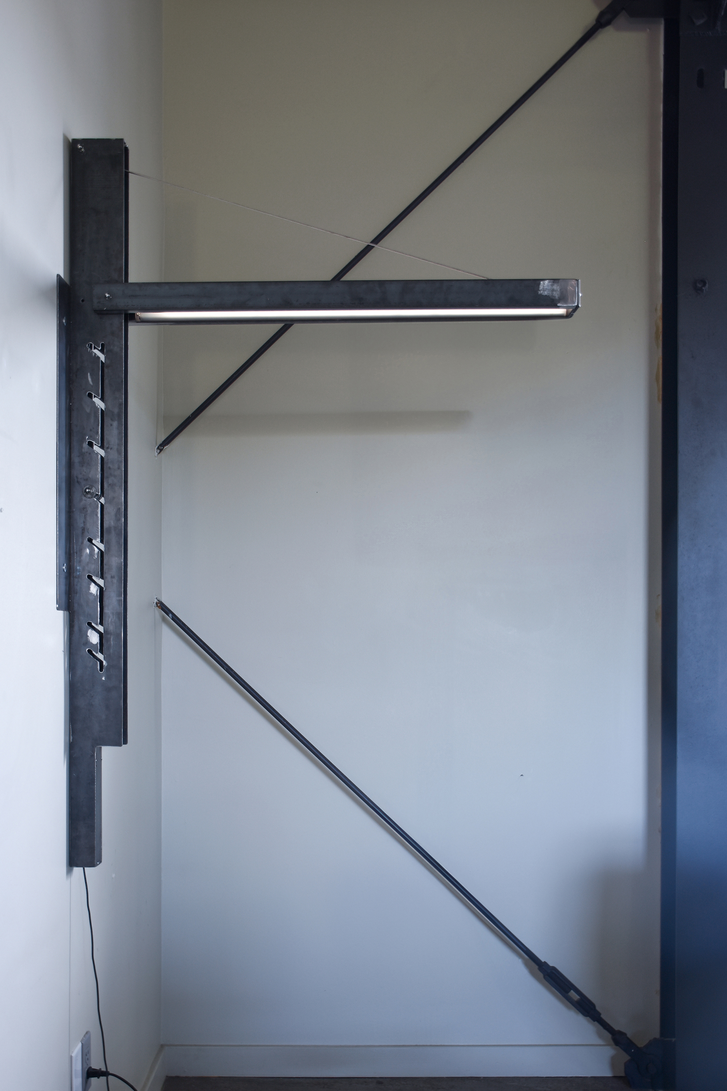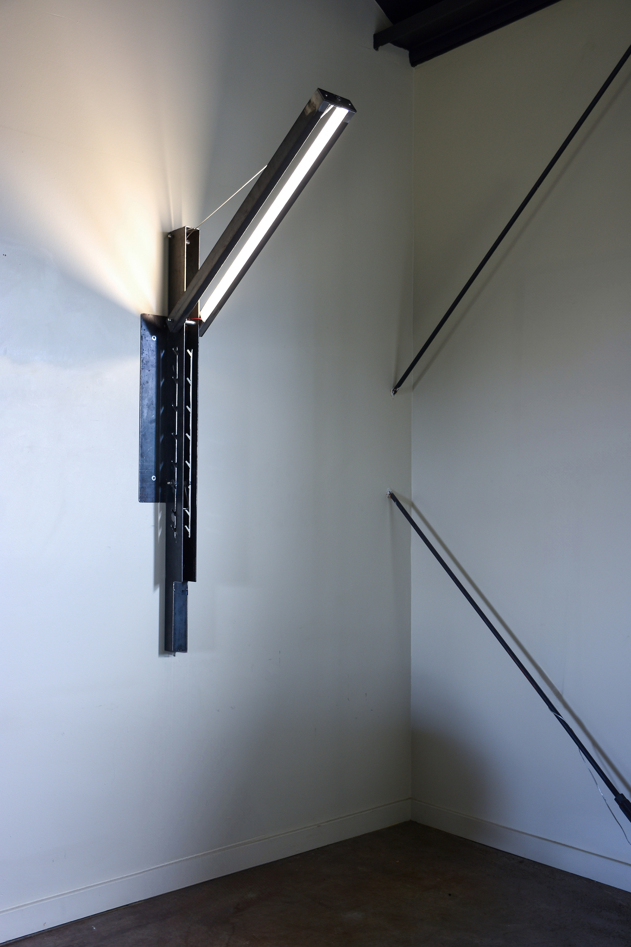 Folded closed, the fixture is 4’-6” tall, 4” deep and 6” wide. The fixture frame is made of steel plate, steel channels, an aircraft cable, and a pulley. The light is an LED dimmable tape light that is inserted into a 1” diameter frosted tube. The tape light is connected to a dimmer switch which is located in the base of the fixture and touches the metal.