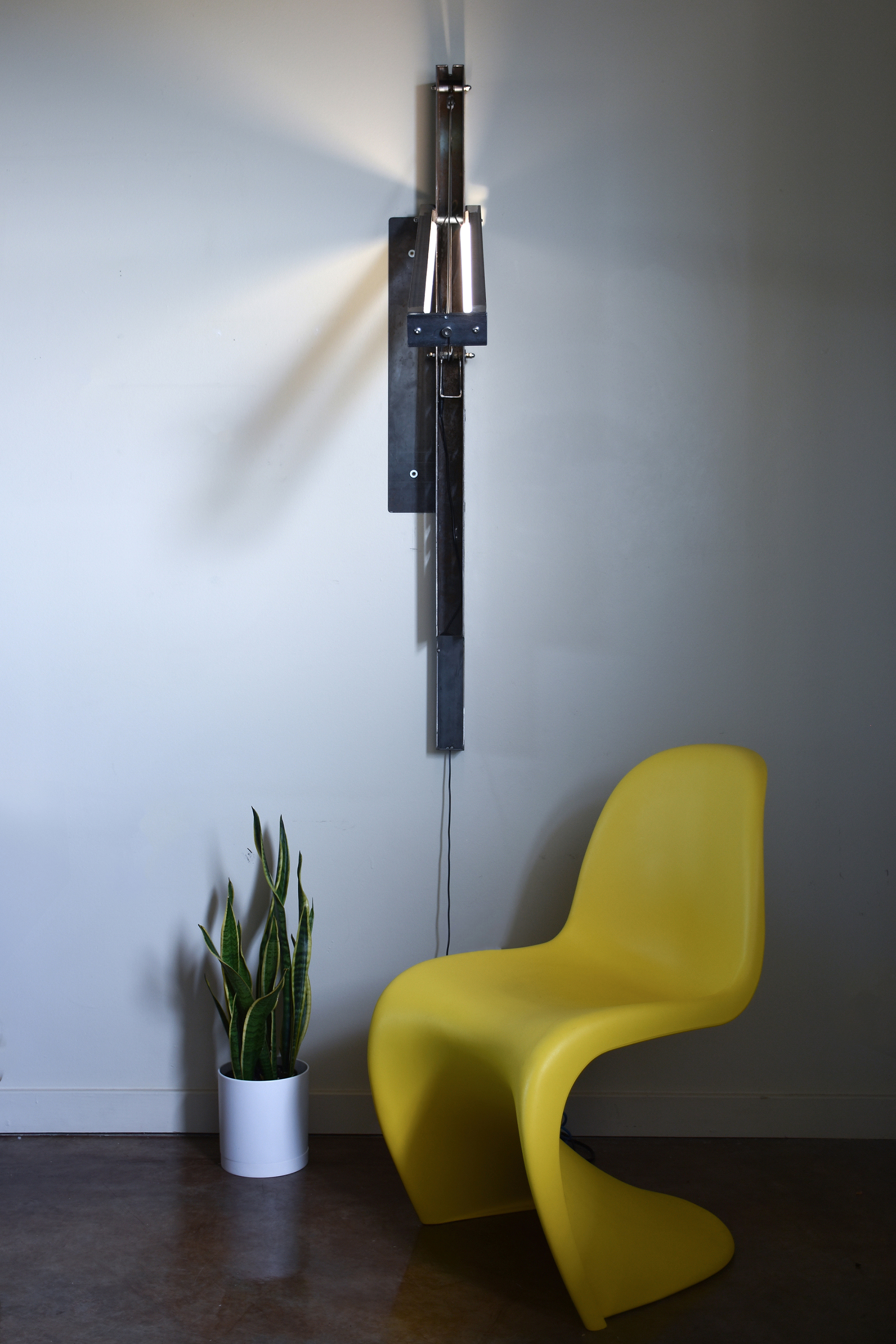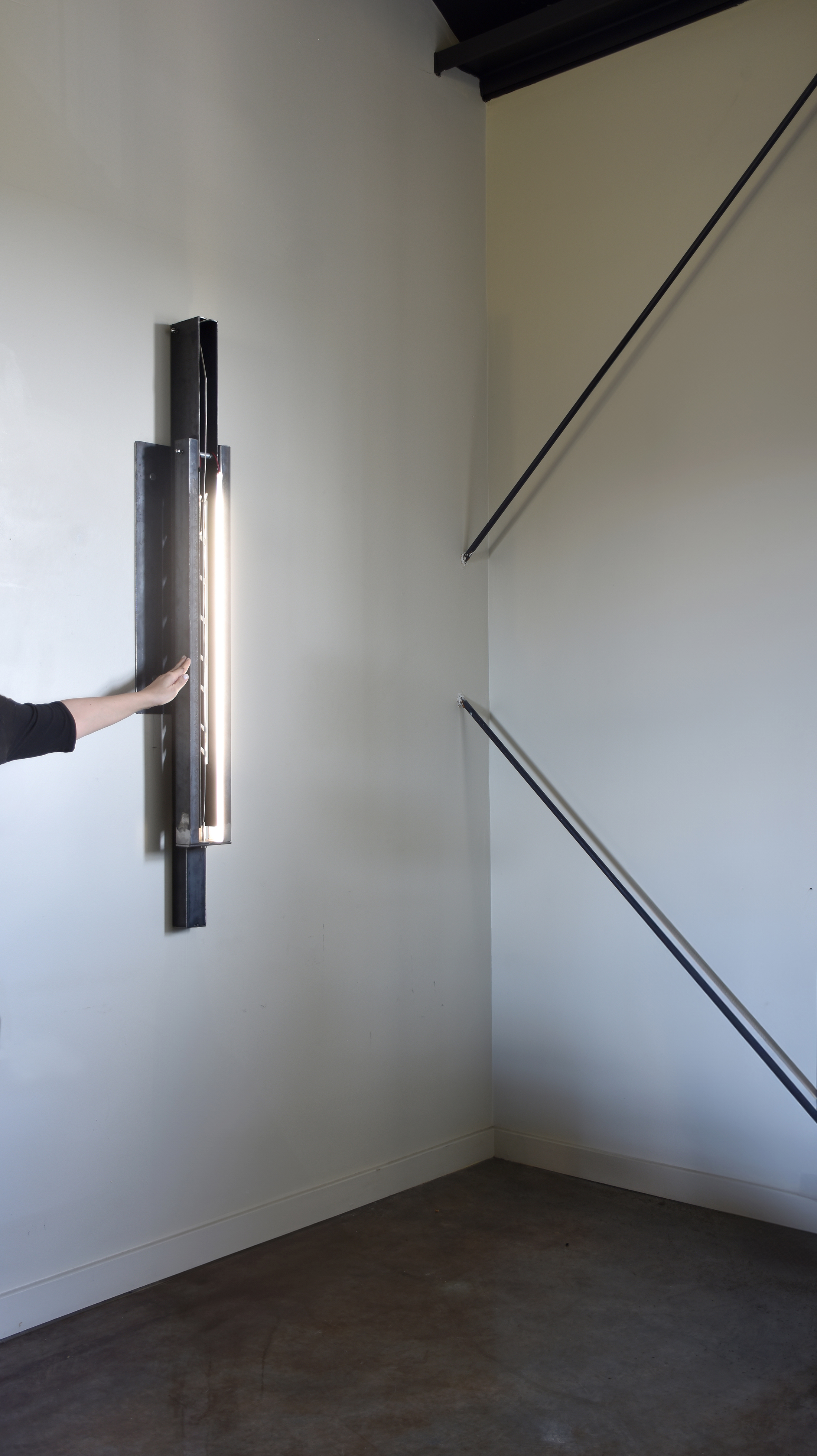 It began 13 years ago when I found a discarded wood project next to the University of Florida Fine Arts building dumpster. I removed some things, and added a few other things (light bulbs) and salvaged it as my light that would hang on every apartment wall, and travel with me from Miami to Arkansas. Using this wood light as a prototype, I worked closely with a fabricator to have a steel fixture made while I added wiring for the new LED tape dimmer lights.