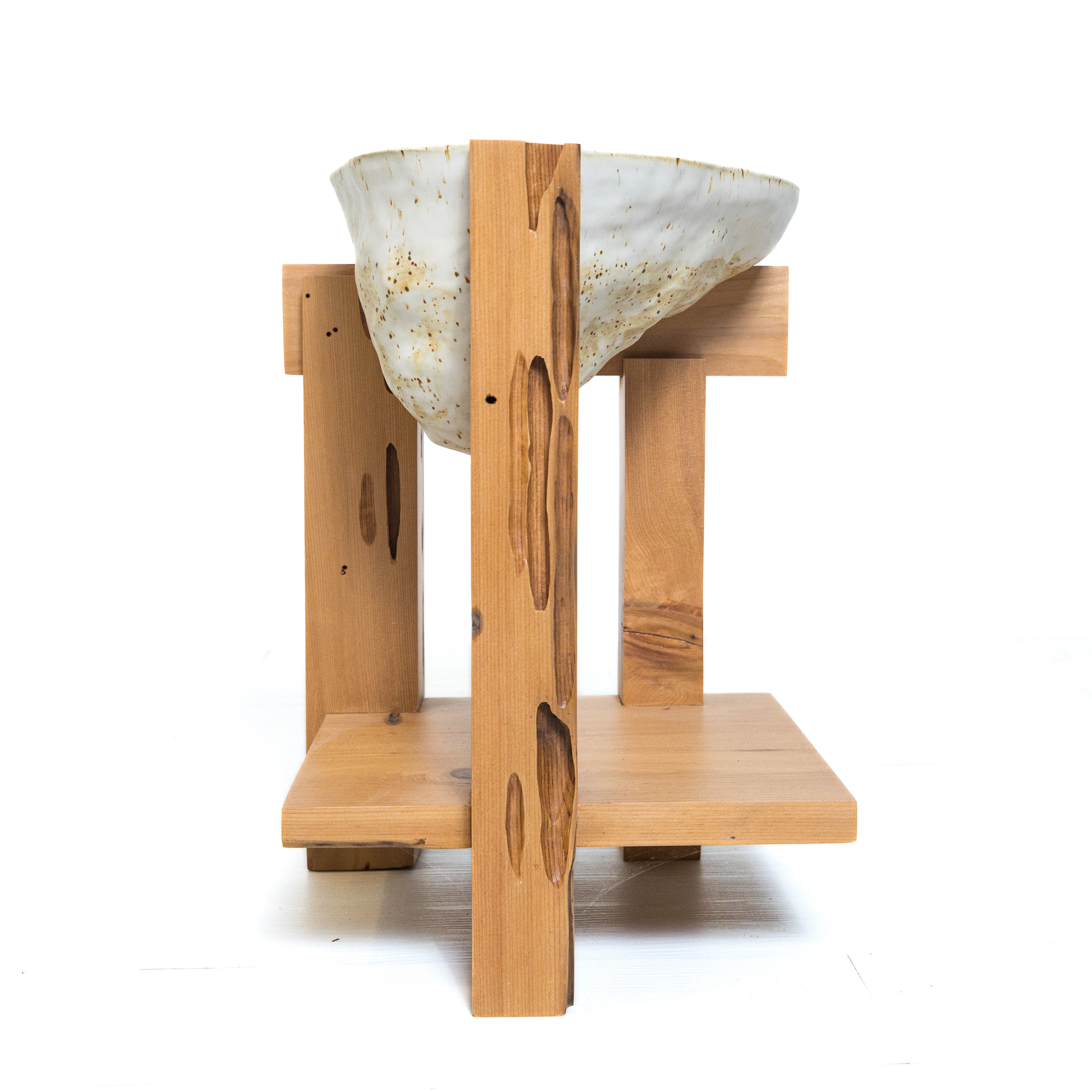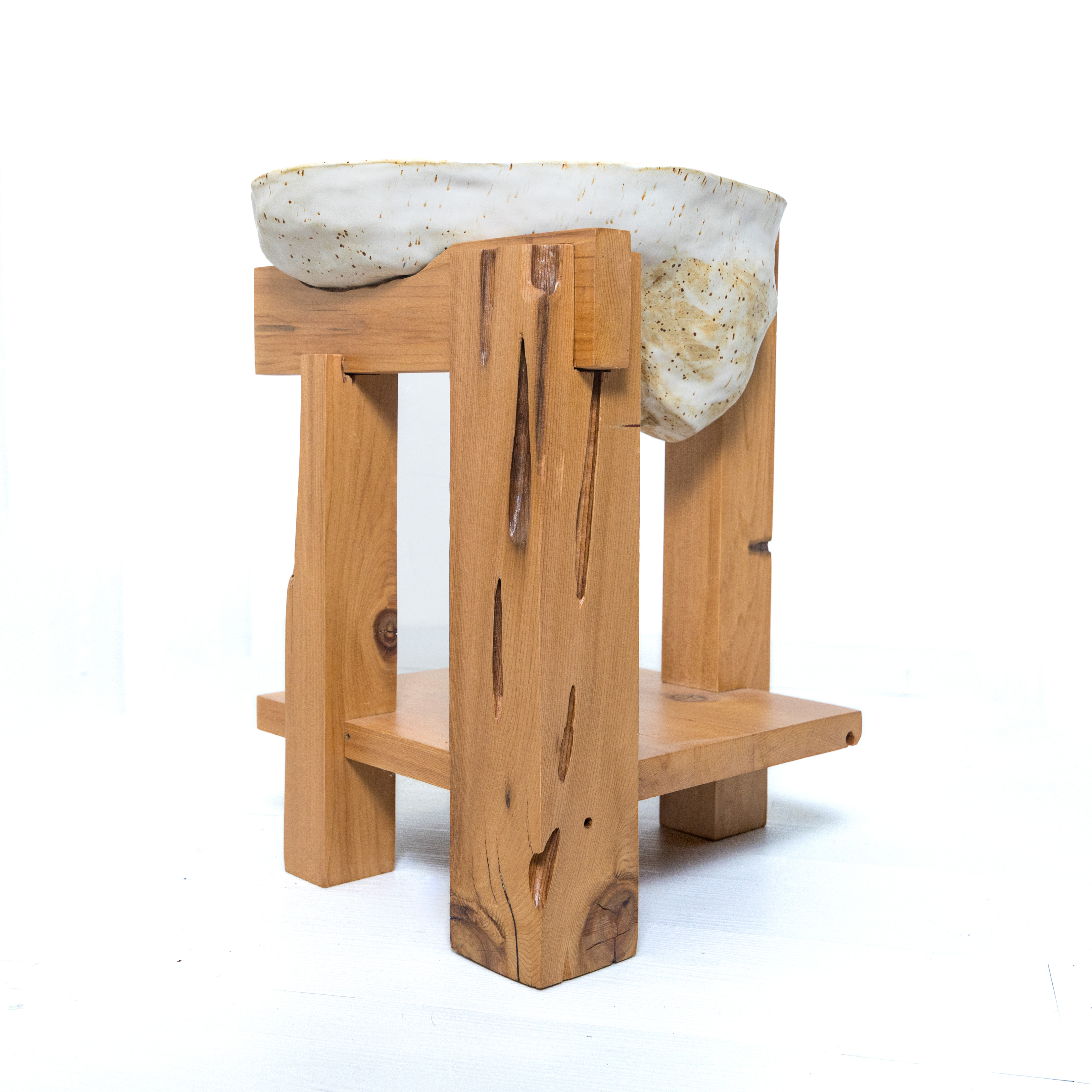 The clay is then sculpted with integrated joinery to link with the Pecky Cypress. Once fired, the wood is hand-carved to perfectly match the contours of the clay and slot into the provided joinery.