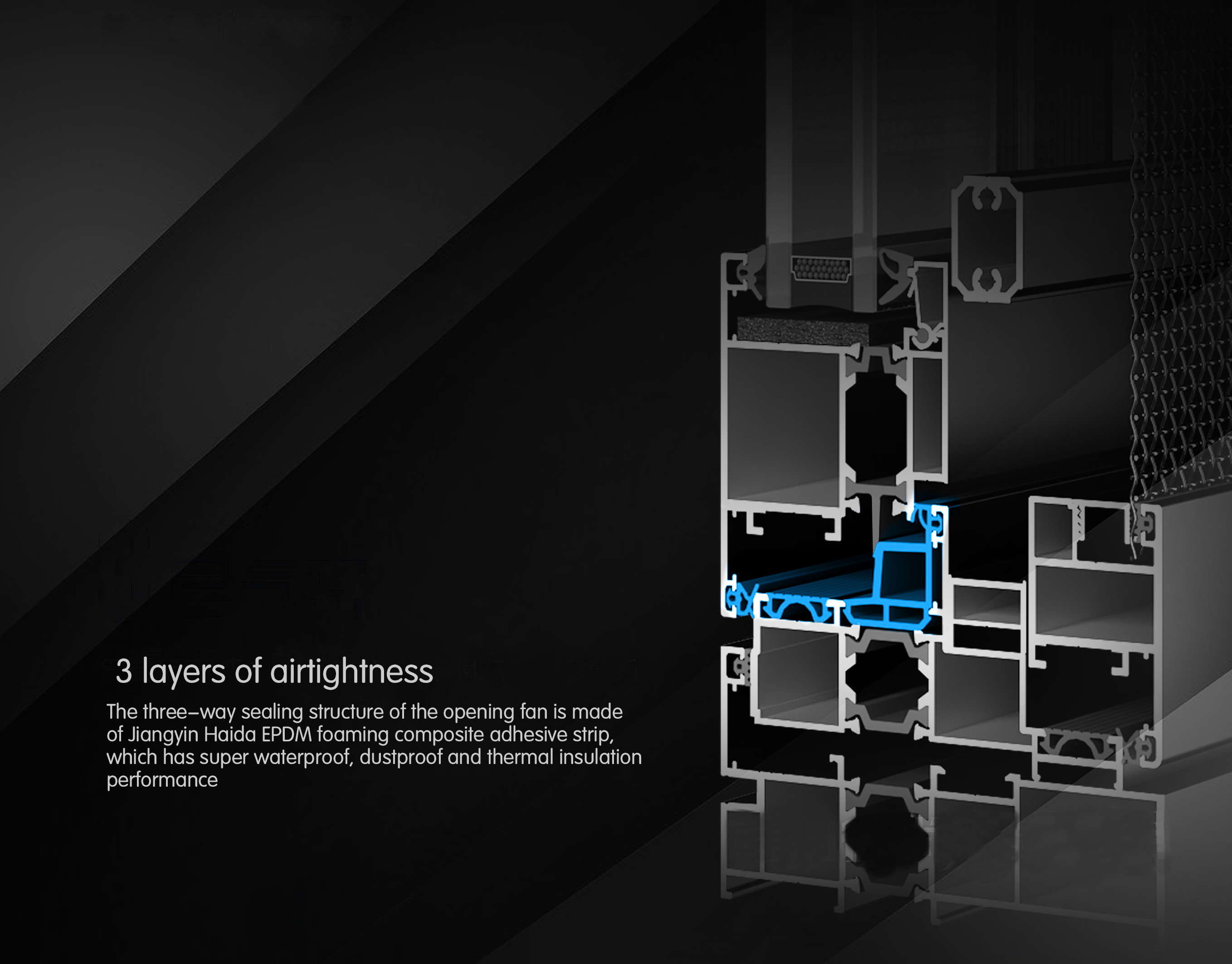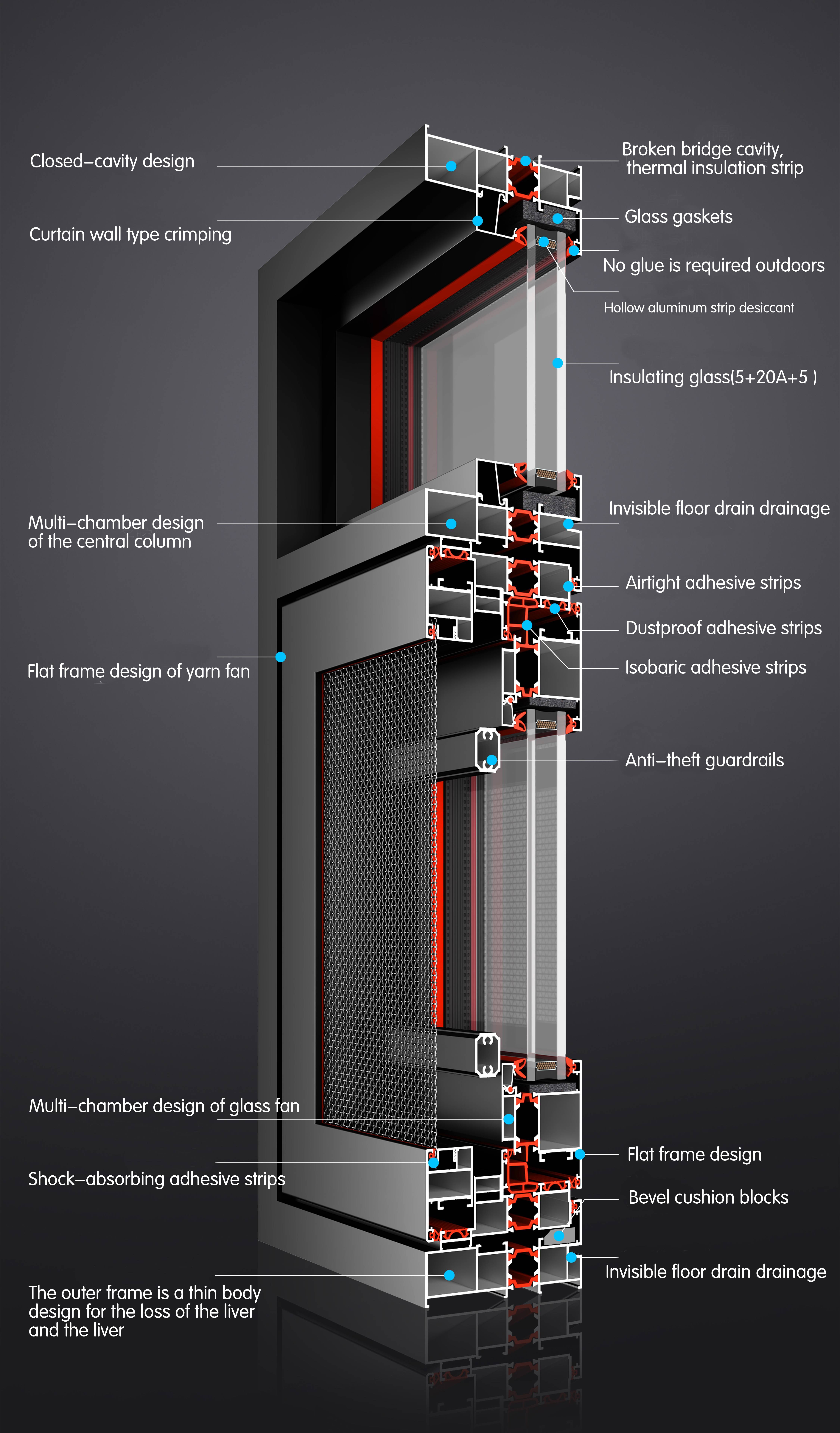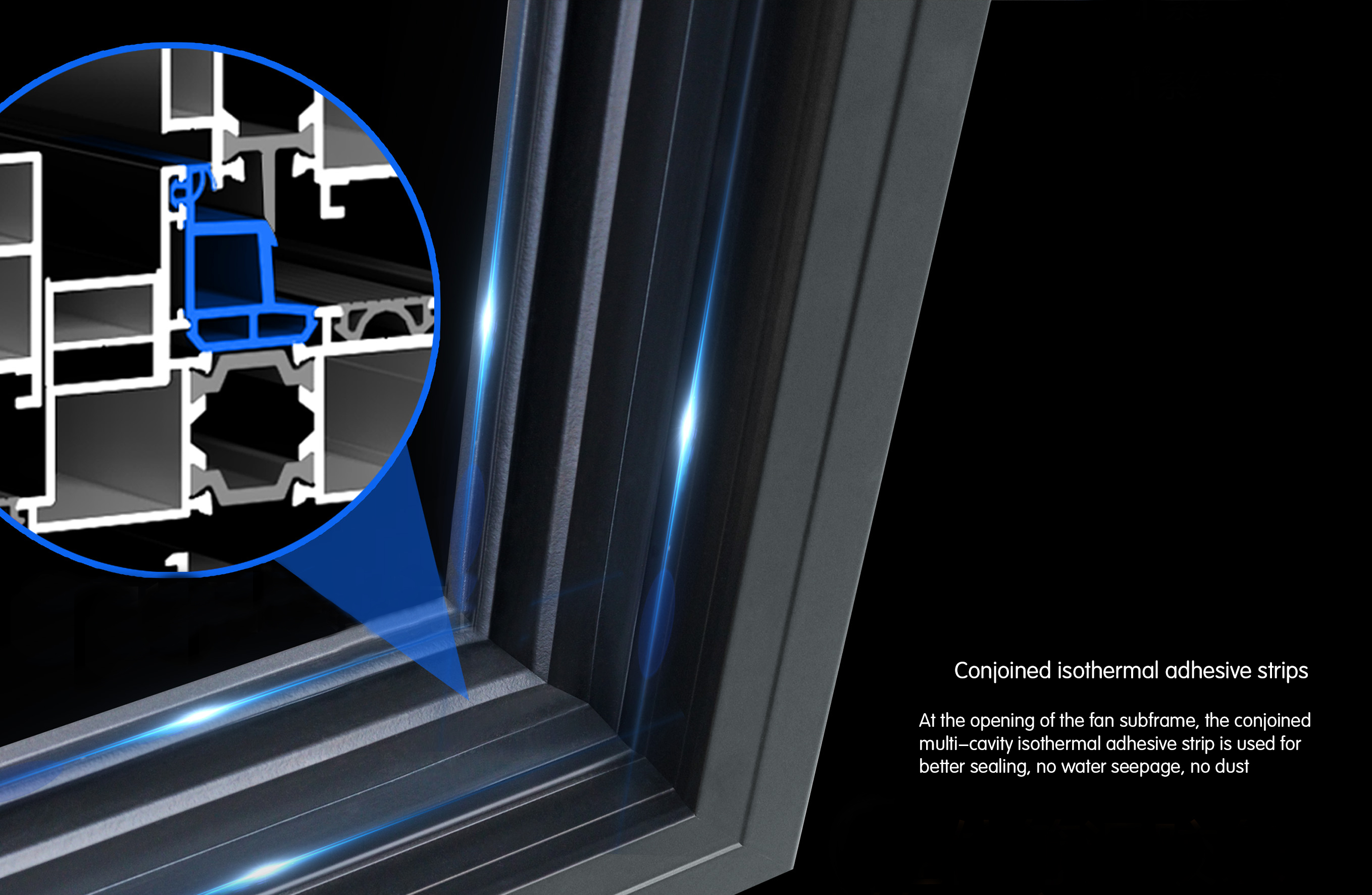 M05 is a window-screen casement window product fabricated from bridge-cutoff aluminum. The modified window structure and a one-piece molding sealing strip added in M05 frame are considered the points differentiating it from other similar products. This innovative design not only drastically improves the airtightness, watertightness, heat and sound insulation of the casement window, but also serves as a good cushion when user opens or closes window. As a result, the force absorption curve smoothens and the noticeable impact from opening or closing a traditional casement window can be avoided, meaning an enhanced user experience. The seamless welded sealing rubber strip protects the window body and handle in some degree, which prevents the frame and handle from undesired damage due to strong force applied and in turn, extends the service life of the product. M05 features the flush design of indoor and outdoor frames and sashes, so that windows and doors look at the same level from inside out to the building facade, as the protruded part of traditional window may look bad. Above all, the flush design of frames and sashes is believed to protect human body against potential scratches or bumps from the protruded part. Thanks to the innovative design in structure and look, M05 is conferred excellent reliability and impressive experience in long-term use compared with similar products.