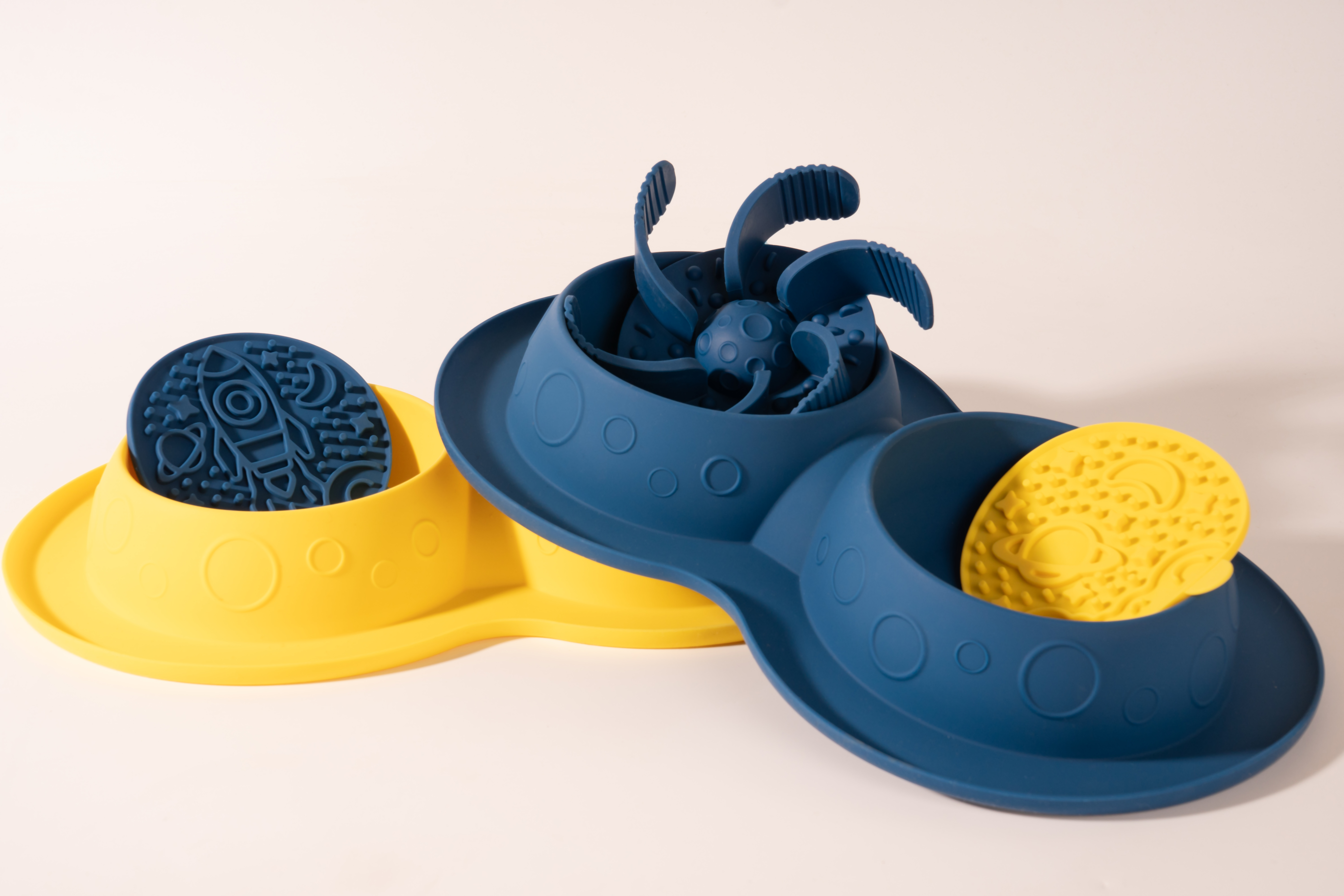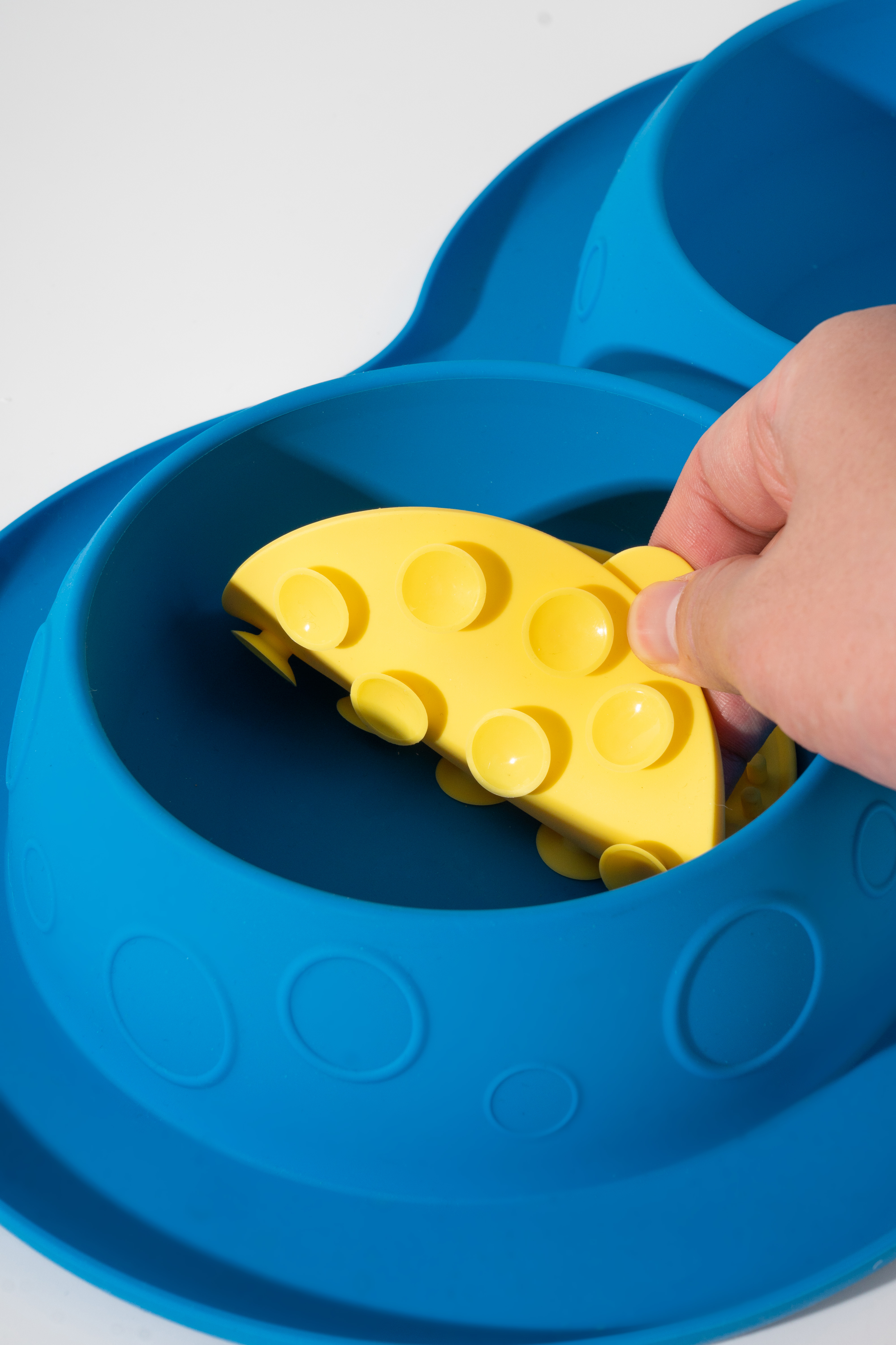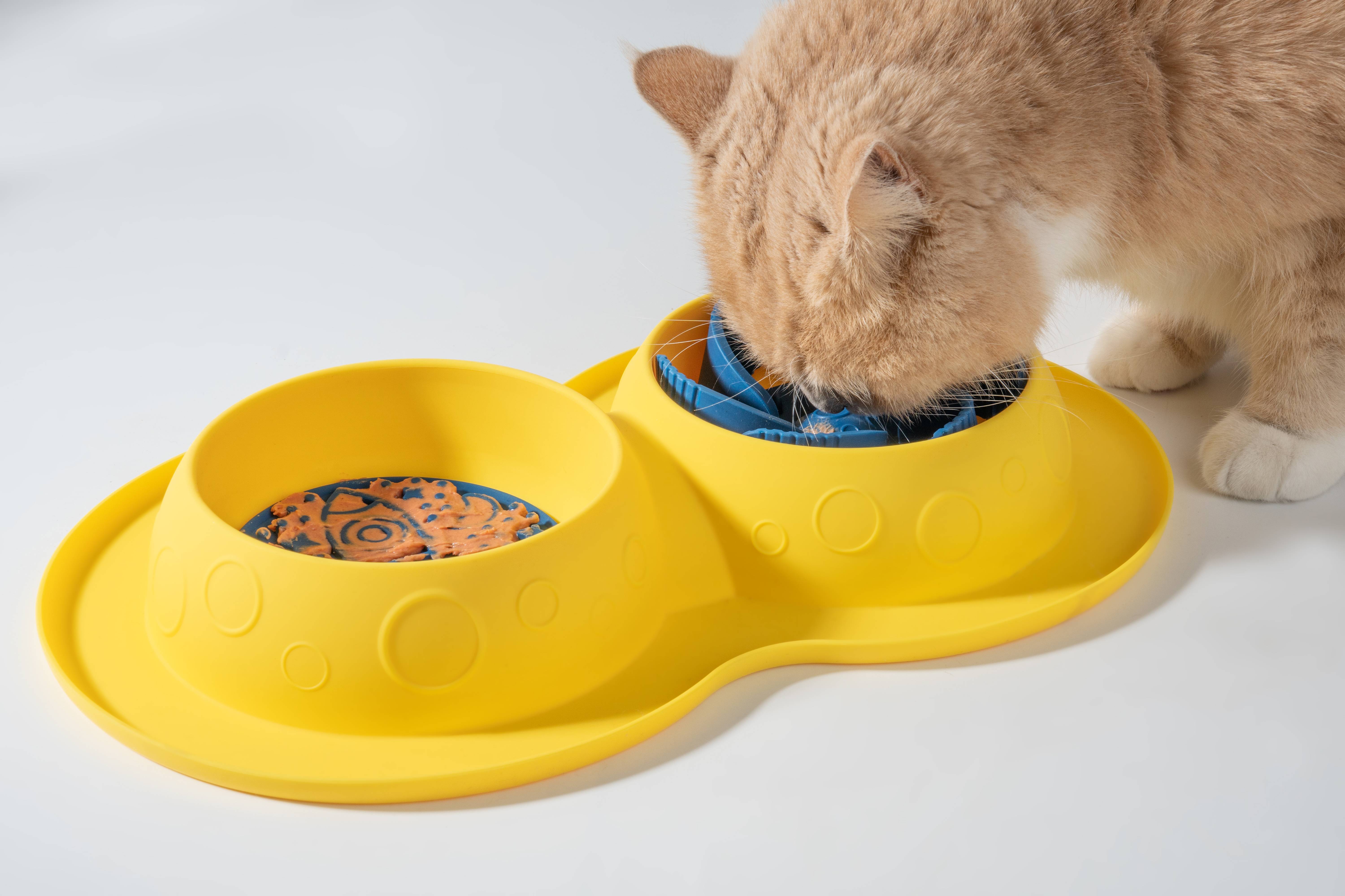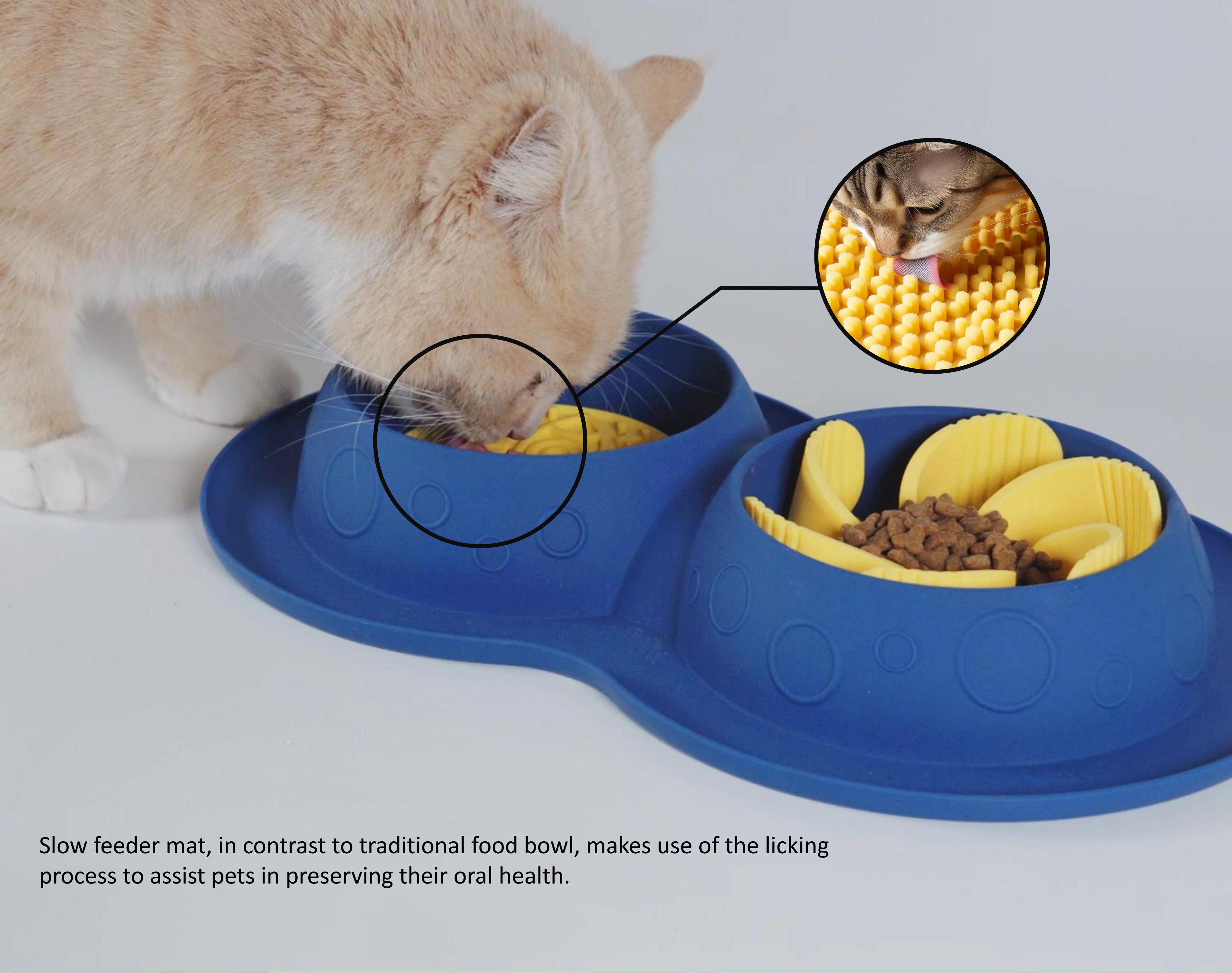 This pet food bowl set is tailored for cats, dogs and other pets, which comprises the figure “8” silicone bowl, a feed divider, and a slow-feeding mat for liquid feed. This set is designed to help pets control the eating speed, improve their wellness and correct poor eating habits. To make it differentiated from counterparts available on the market, all of its components are made of food-grade, non-hazardous silicone material. The fan shape and softness of the divider fit it to most of feeder bowl sizes available on the market. This feature gives it exceptional suitability and compatibility. The main function of the divider is to slow down the speed at which pets eat cat food, dog food and other granulated food, or to speed up the cooling rate of hotter food to avoid pets from getting burned. The slow-feeding mat is used to control the speed of feeding pet with complementary food (e.g.: meat paste). The softness of silicone can well protect a pet's tongue from injury when eating, and it also cleans the tongue. The splash-proof design of the figure “8” silicone bowl prevents food or water from spilling out of the bowl while a pet is eating, and helps user keep tidy. The silicone material makes no abnormal noise under strong shakes. The bottom portions of the divider and the slow-feeding mat are vacuum-absorbed to fit closely on the floor, prevent shifting or unexpected tumbling even if a pet sways when eating. This design really helps users train their pets to eat at fixed points. The bottom portions of the divider and the slow-feeding mat are also equipped with vacuum suction cups to provide better retention. Blue and yellow are intently used as the main color scheme in the course of product design, because cats and dogs have limited color vision and less cone cells in their retinas compared to humans. For this reason, this set is designed to provide pets with a comfortable and identifiable visual interface given the visual needs of pets.