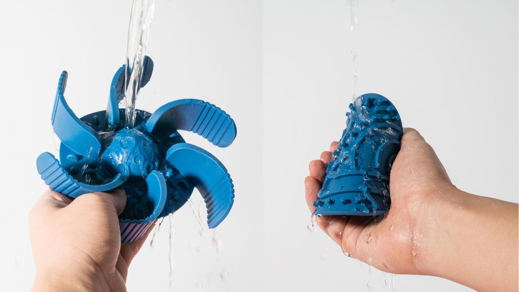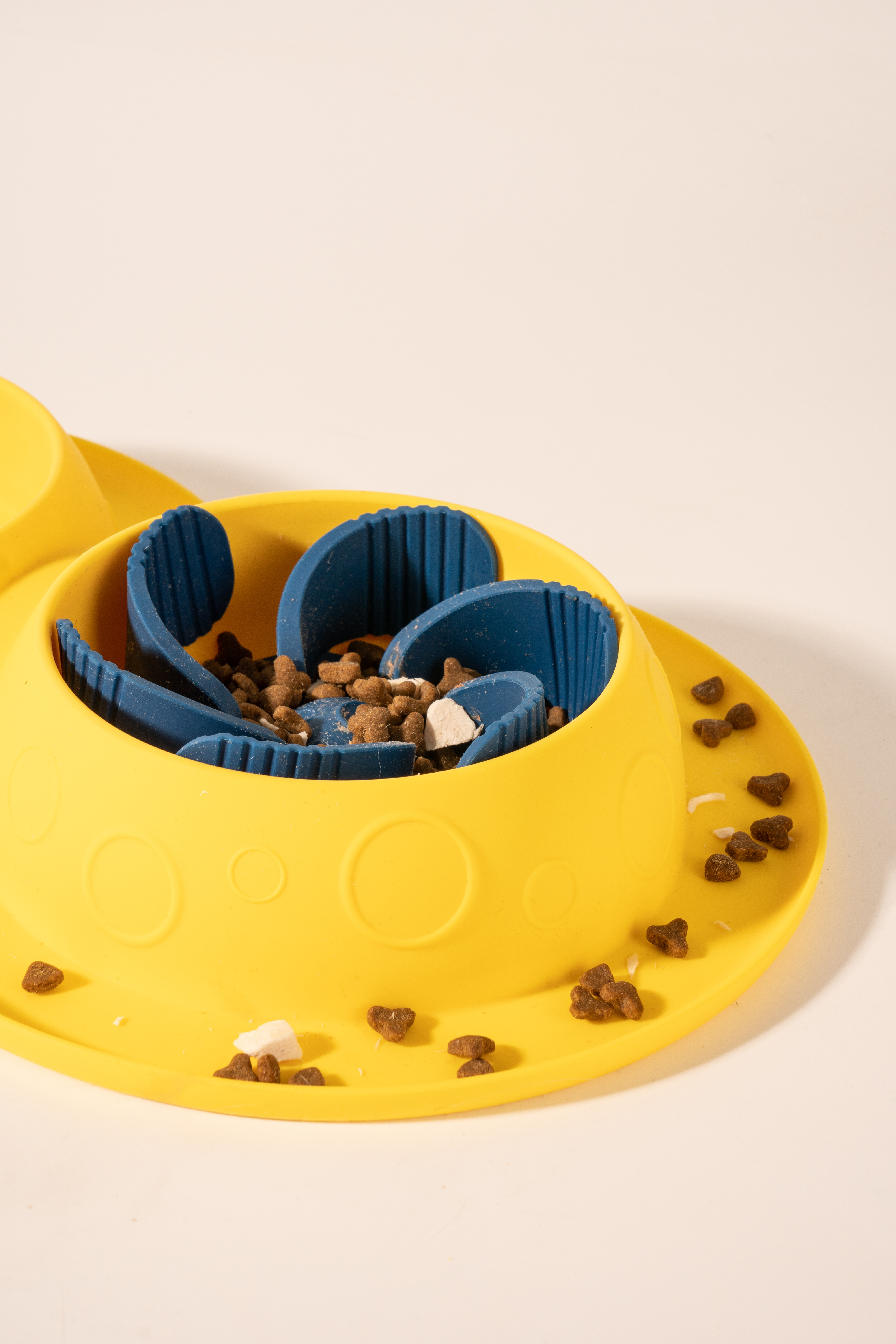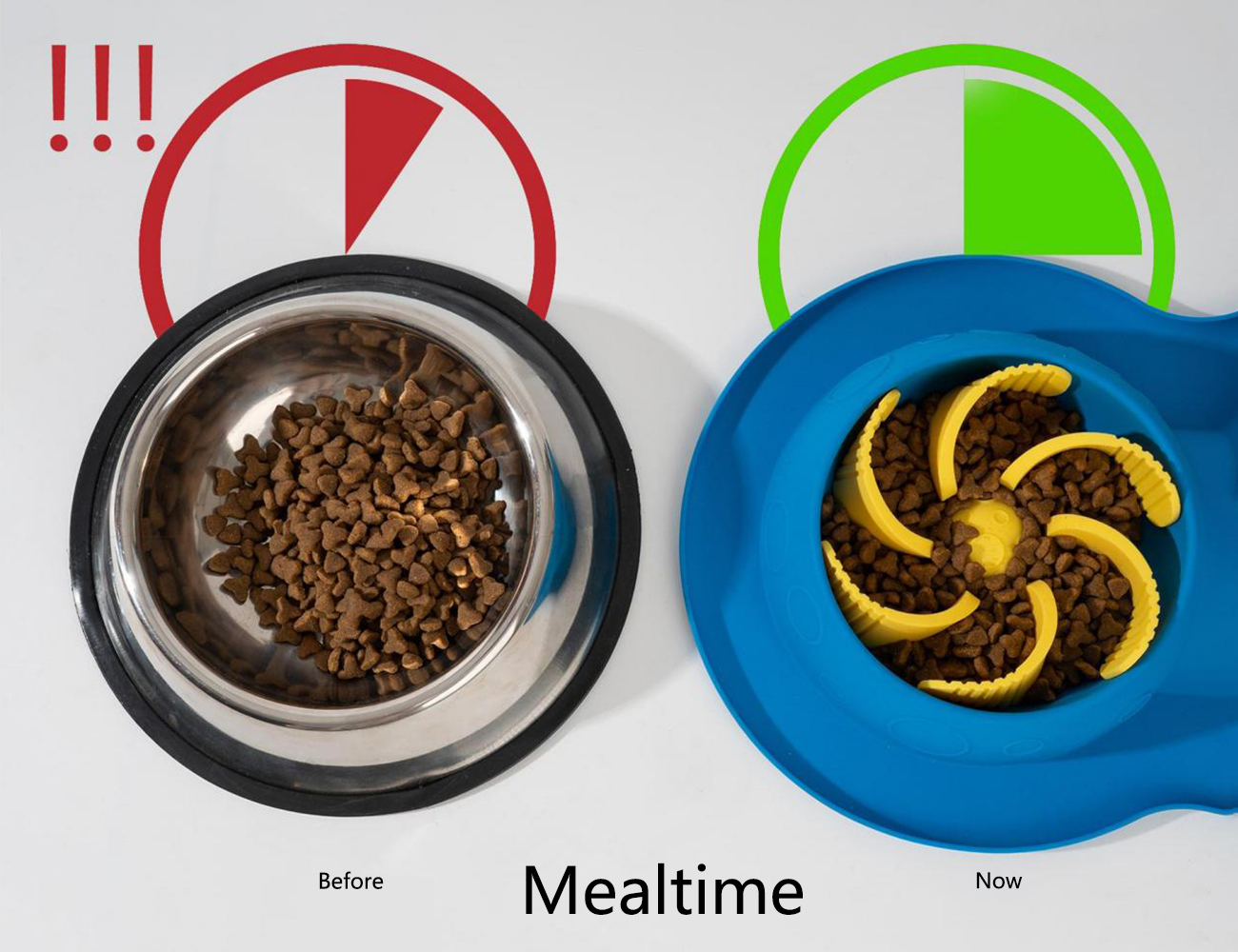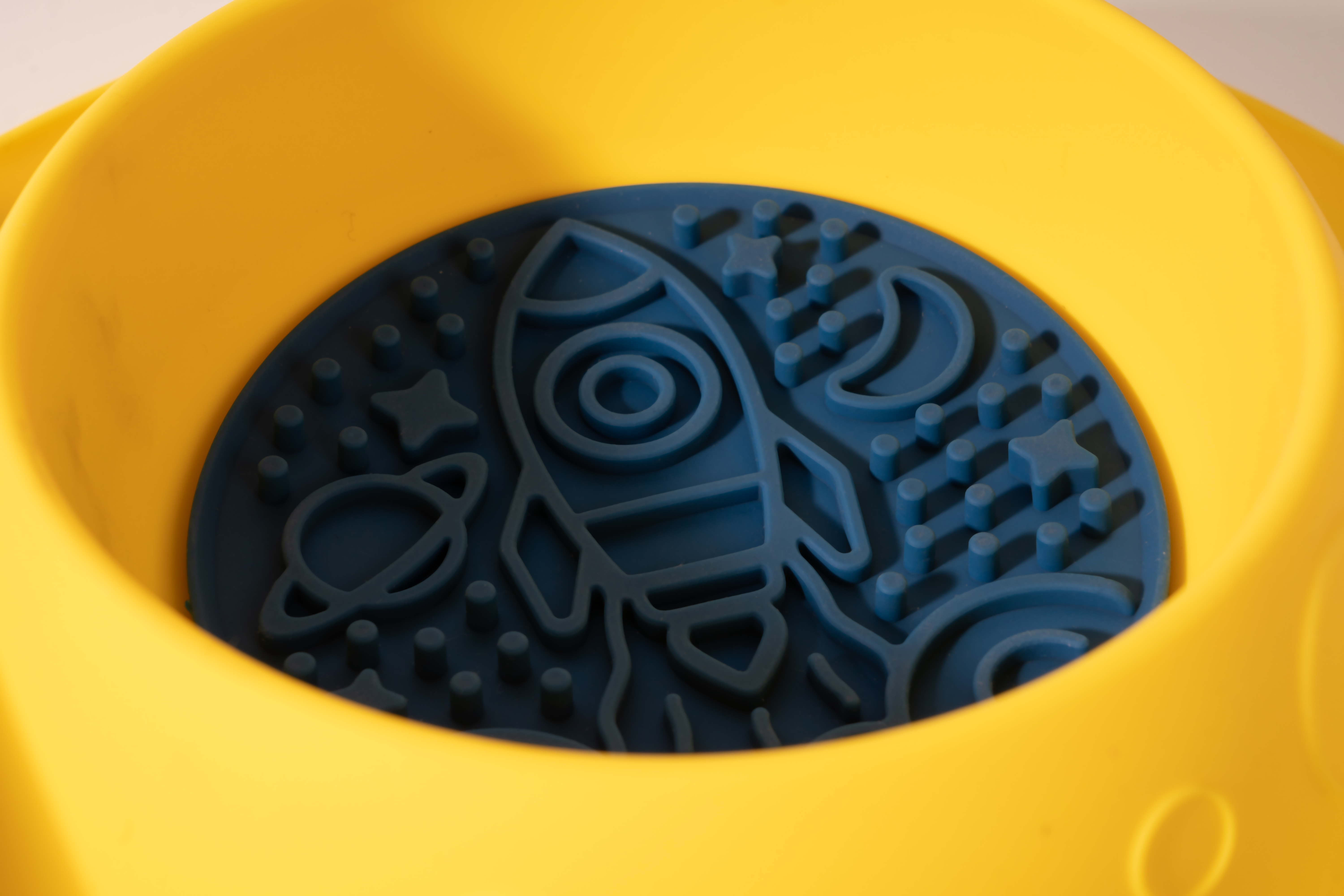 This pet food bowl set is tailored for cats, dogs and other pets, which comprises the figure “8” silicone bowl, a feed divider, and a slow-feeding mat for liquid feed. This set is designed to help pets control the eating speed, improve their wellness and correct poor eating habits. To make it differentiated from counterparts available on the market, all of its components are made of food-grade, non-hazardous silicone material. The fan shape and softness of the divider fit it to most of feeder bowl sizes available on the market. This feature gives it exceptional suitability and compatibility. The main function of the divider is to slow down the speed at which pets eat cat food, dog food and other granulated food, or to speed up the cooling rate of hotter food to avoid pets from getting burned. The slow-feeding mat is used to control the speed of feeding pet with complementary food (e.g.: meat paste). The softness of silicone can well protect a pet's tongue from injury when eating, and it also cleans the tongue. The splash-proof design of the figure “8” silicone bowl prevents food or water from spilling out of the bowl while a pet is eating, and helps user keep tidy. The silicone material makes no abnormal noise under strong shakes. The bottom portions of the divider and the slow-feeding mat are vacuum-absorbed to fit closely on the floor, prevent shifting or unexpected tumbling even if a pet sways when eating. This design really helps users train their pets to eat at fixed points. The bottom portions of the divider and the slow-feeding mat are also equipped with vacuum suction cups to provide better retention. Blue and yellow are intently used as the main color scheme in the course of product design, because cats and dogs have limited color vision and less cone cells in their retinas compared to humans. For this reason, this set is designed to provide pets with a comfortable and identifiable visual interface given the visual needs of pets.