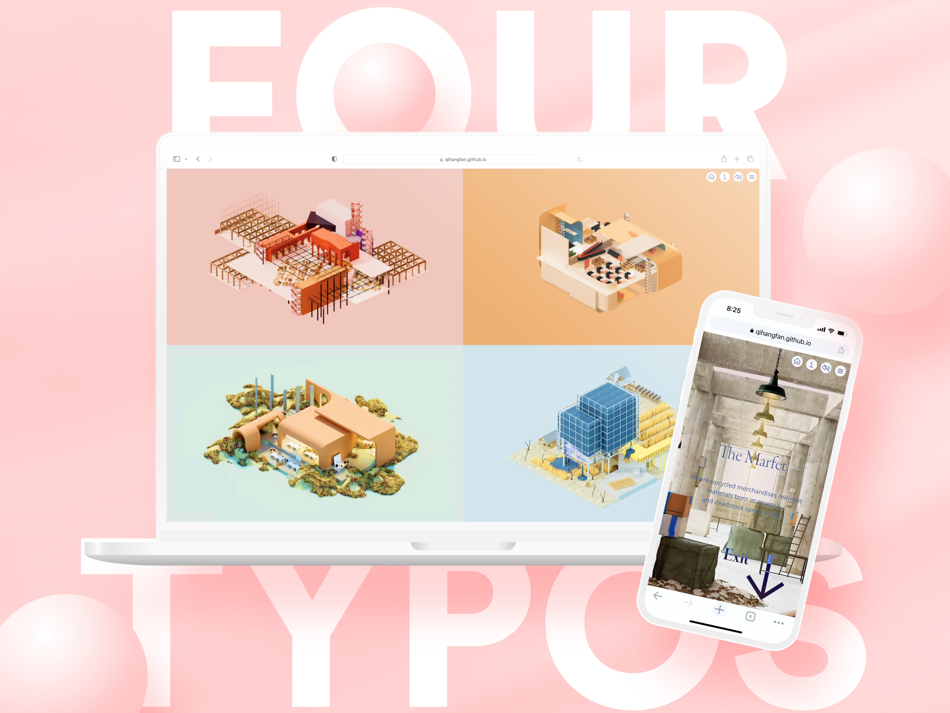 Four Typologies is a responsive interactive media website that introduces new decentralized and localized Garden Fashion Factory Typologies evoking humanity and resisting industrial mechanization trends. Four Typologies allows users to explore architectural designs from a macro perspective, appreciating the intricate miniatures, to a micro level where they can engage with nuanced interactions and dynamic textures. It immerses users into a nonlinear upcycling handicraft workflow tailored to each architectural miniature, which makes architectural designs and fashion concepts more tangible, interactive, and accessible to a wider audience.