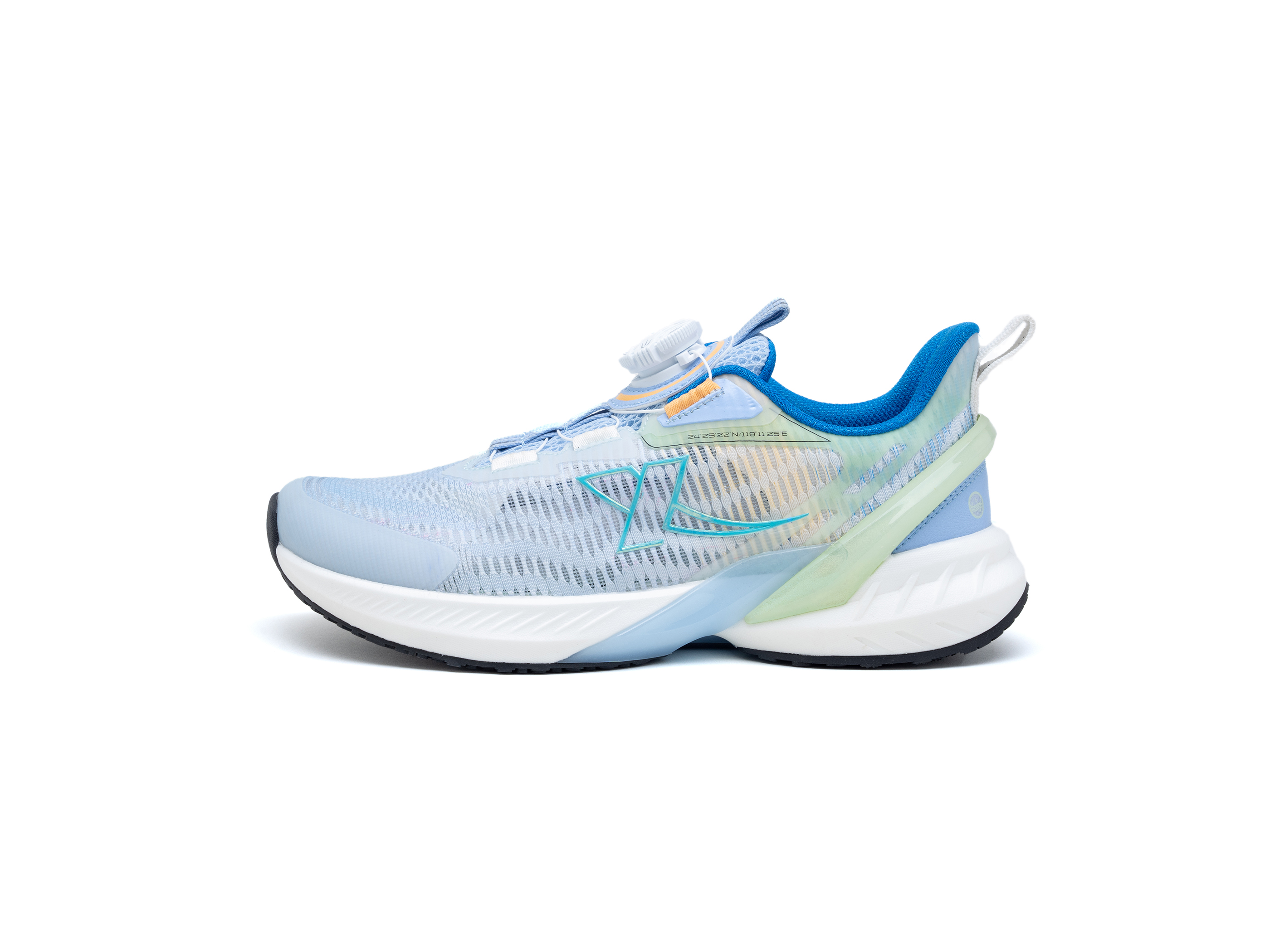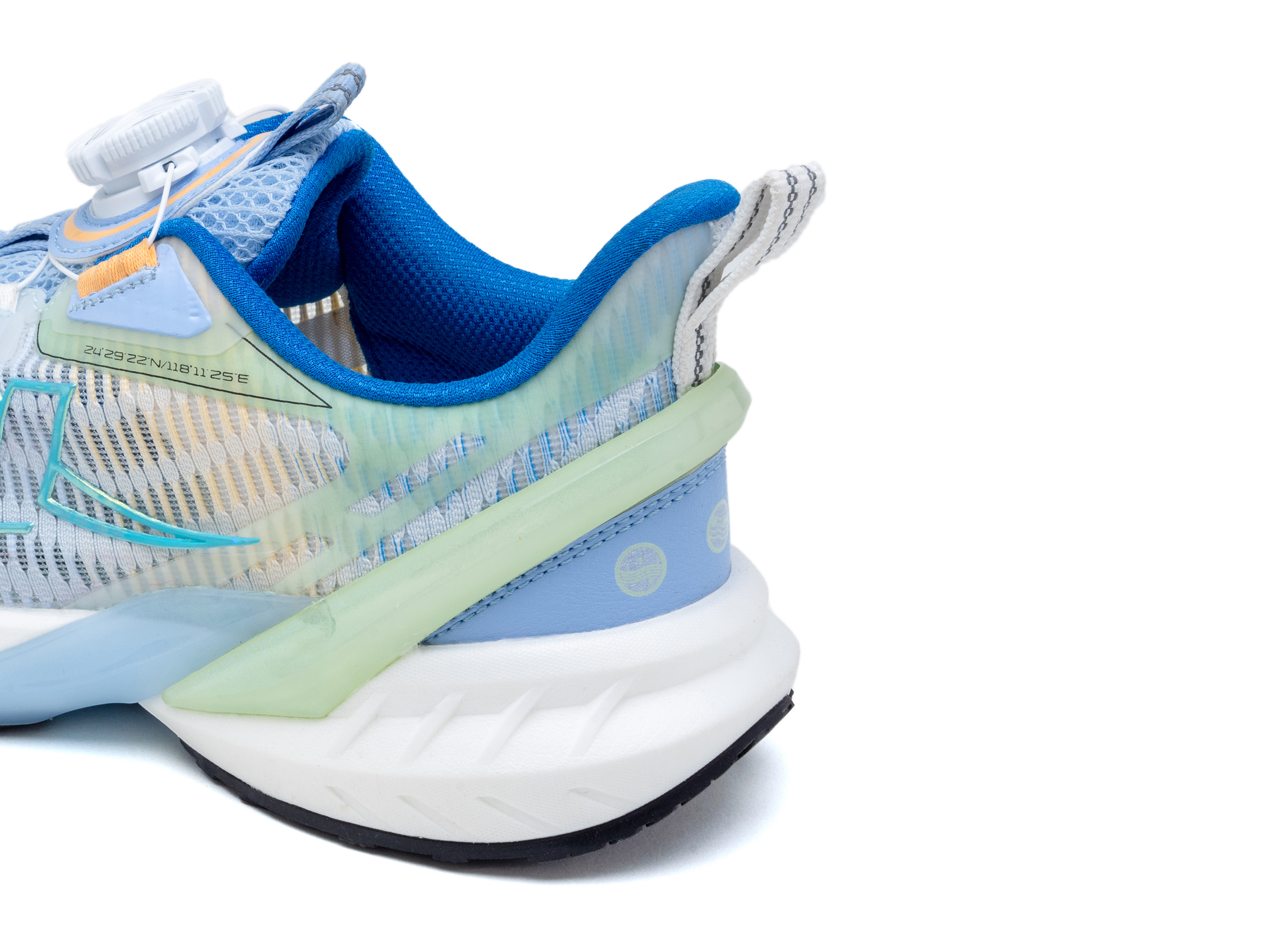 This design prioritizes three critical areas: dynamic propulsion in the toe area, robust arch support in the midfoot, and increased heel stability for ankle protection. The front of each shoe features an ergonomic design with a wide base, incorporating an expanded forefoot and a flattened, arc-shaped toe box. This is augmented by an anti-slip feature to minimize lateral movement. Such a thoughtful design aligns with the morphology of children's feet, effectively warding off hallux valgus. By widening the ground contact area on each side, the shoes significantly alleviate pressure on the toe joints, boosting overall foot comfort. The midsole, crafted from a non-Newtonian fluid-based smart polymer material, can dynamically adapt its elastic modulus in response to the varying intensity of foot strikes. This feature optimizes the rebound force while keeping the shoes lightweight. The heel integrates a distinctive construction that provides a snug wrap-around effect, securely cradling the heel bone to enhance stability with each step and increasing overall support. Further enhancing this design is a carefully considered 4mm drop, which improves movement flexibility and offers superior knee protection.