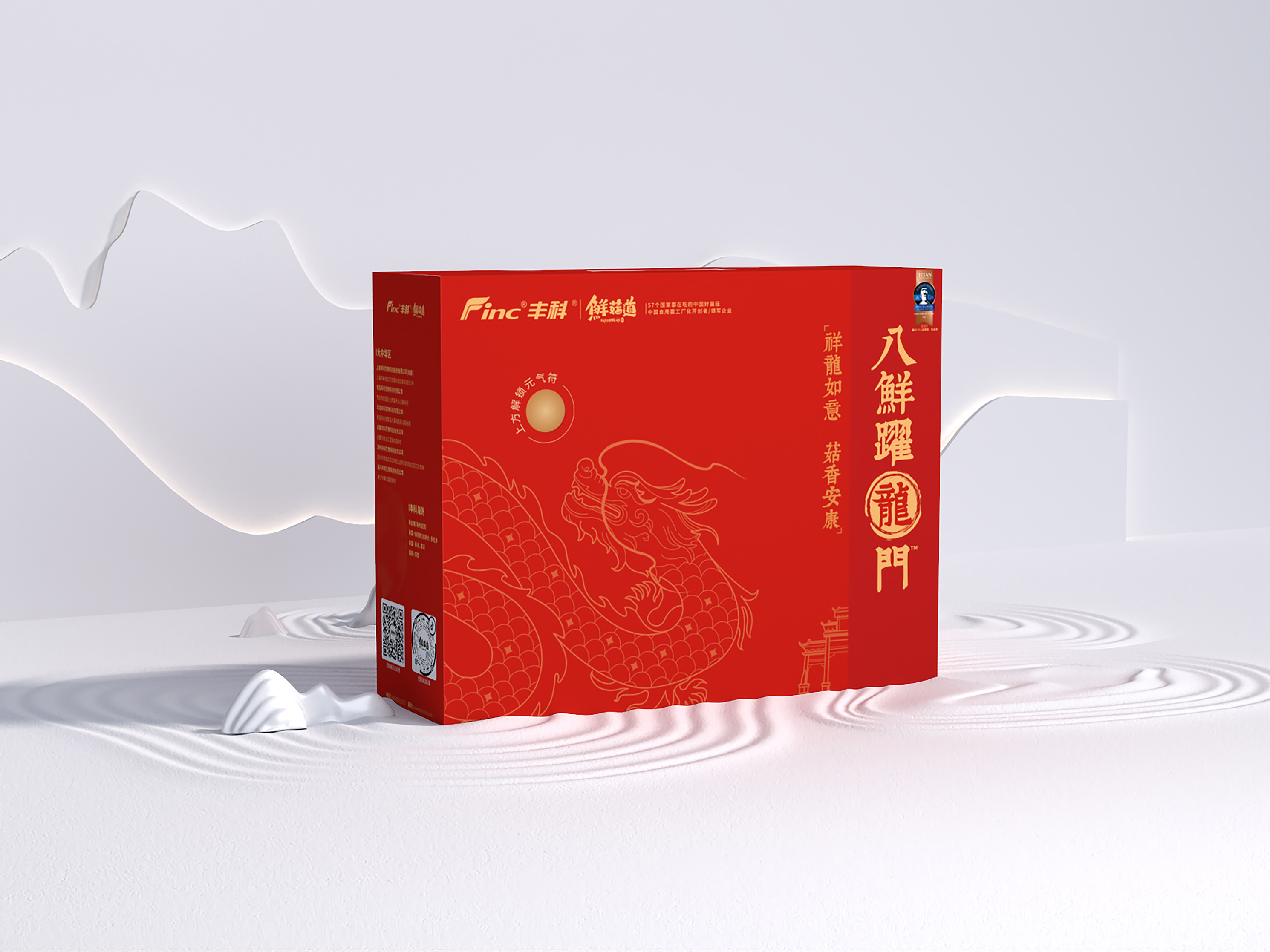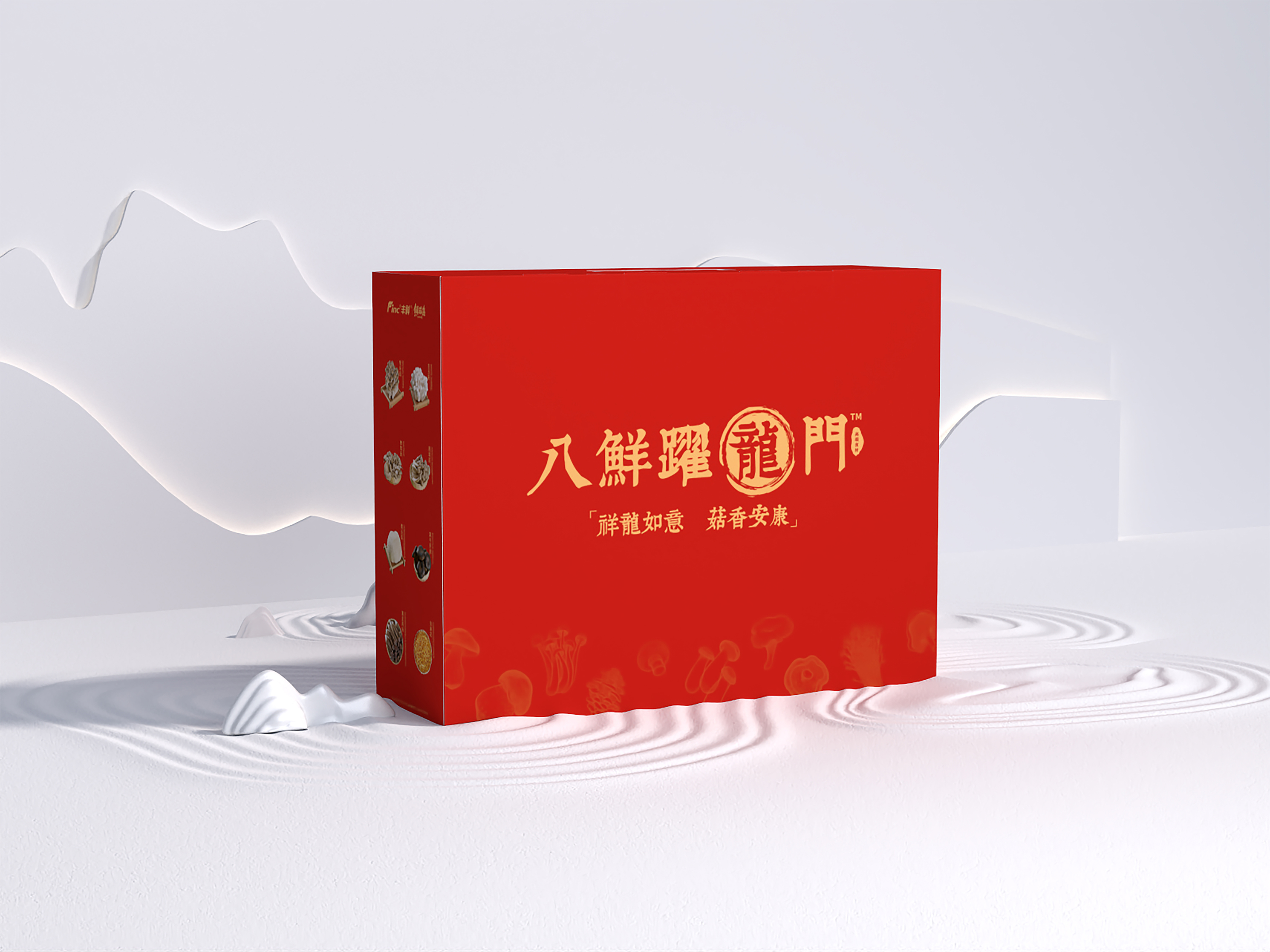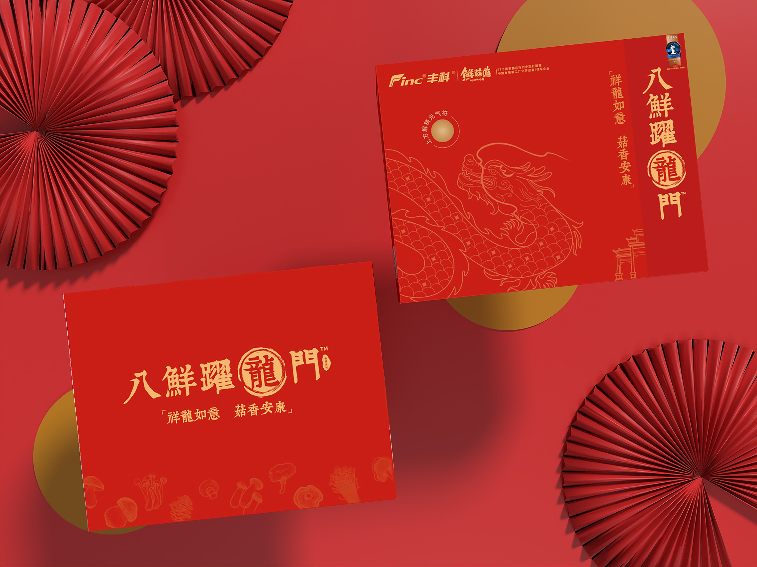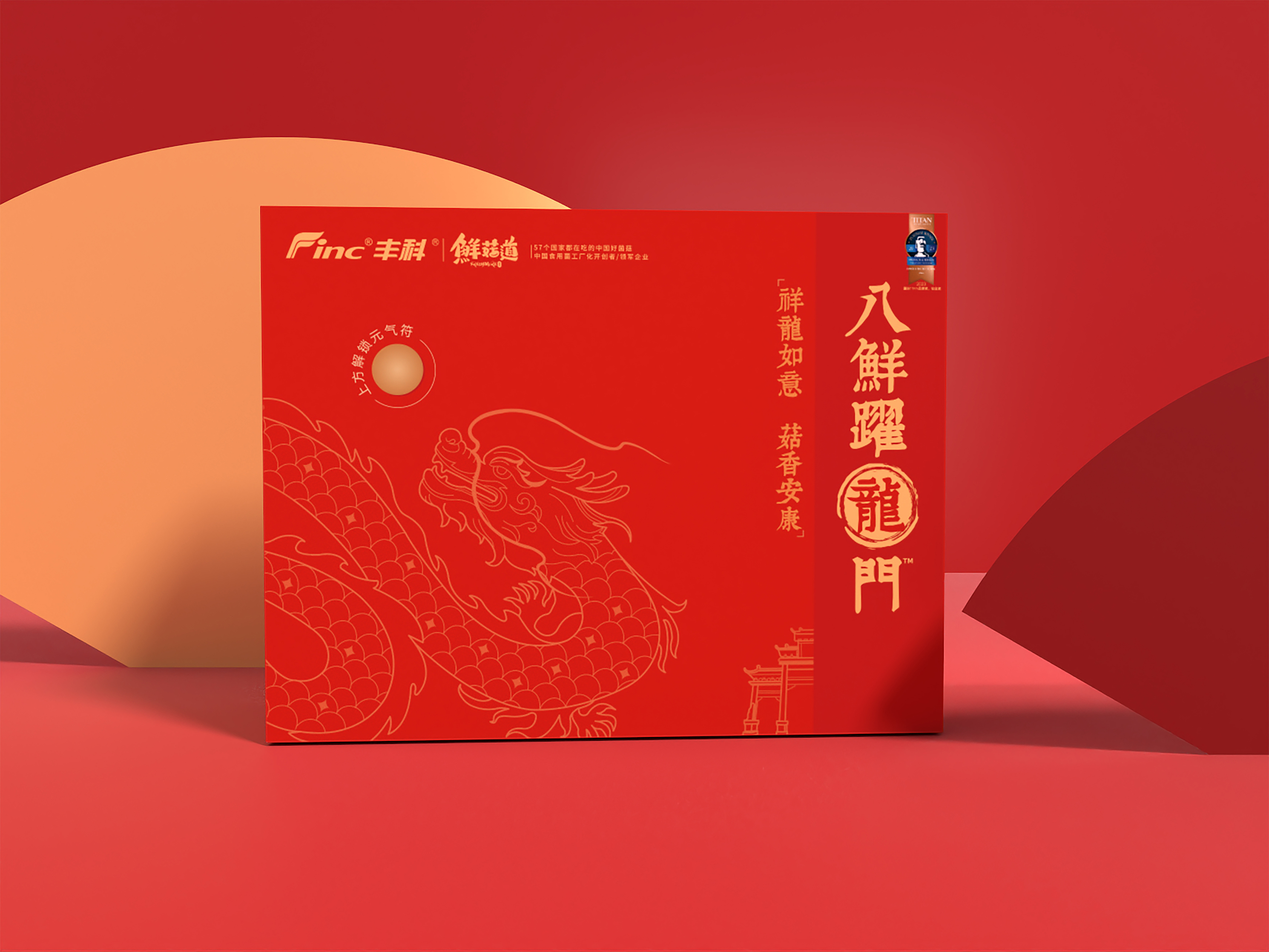 Ba Xian Yue Long Men is a specially designed gift box for Finc's product Fresh Mushroom in the Year of the Dragon. With Chinese red as the main color and the main image of the dragon leaping dragon door line drawing, the gift box aims to convey the brand culture, promote the sales volume of the product and enhance the corporate image through the gift box.