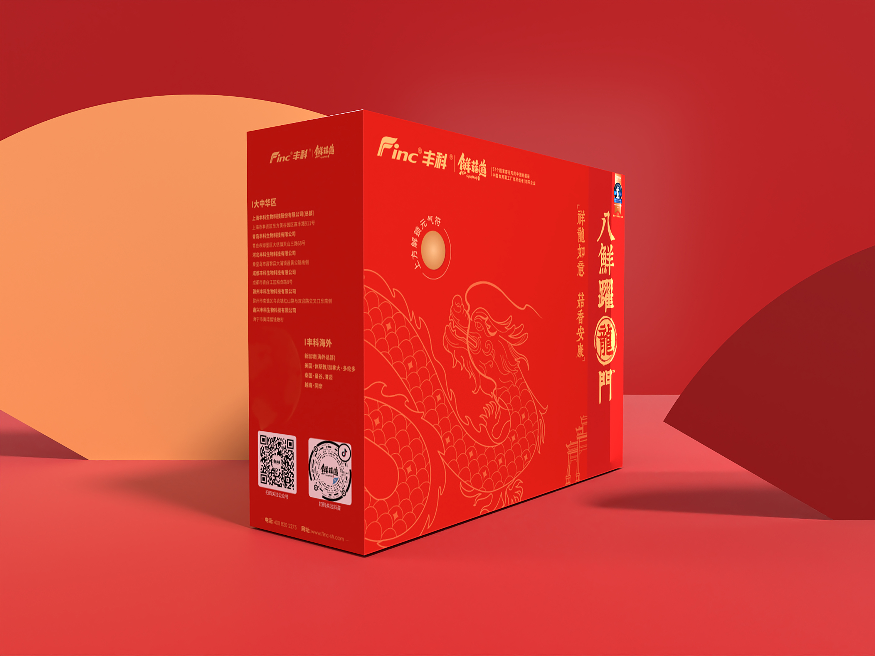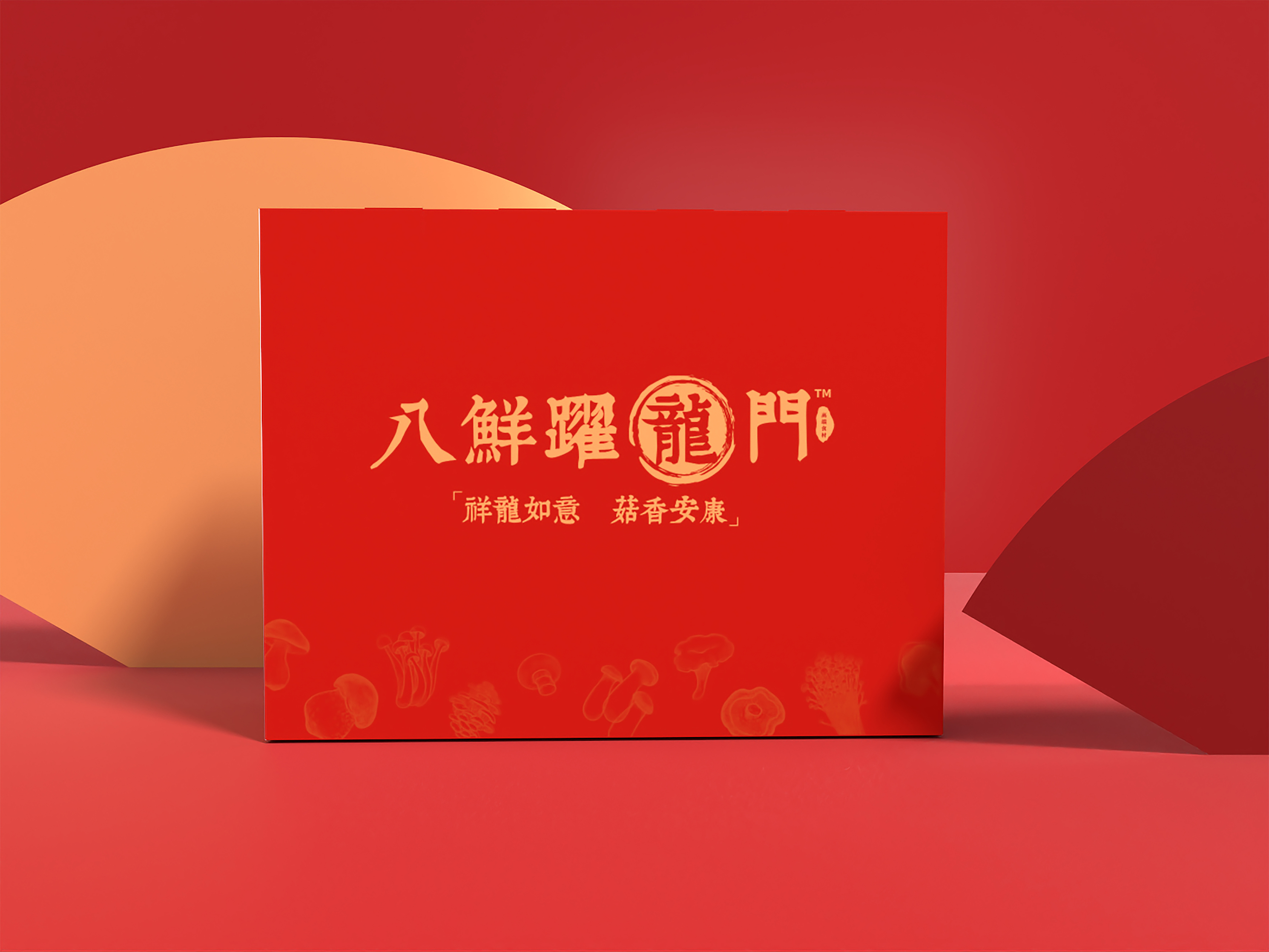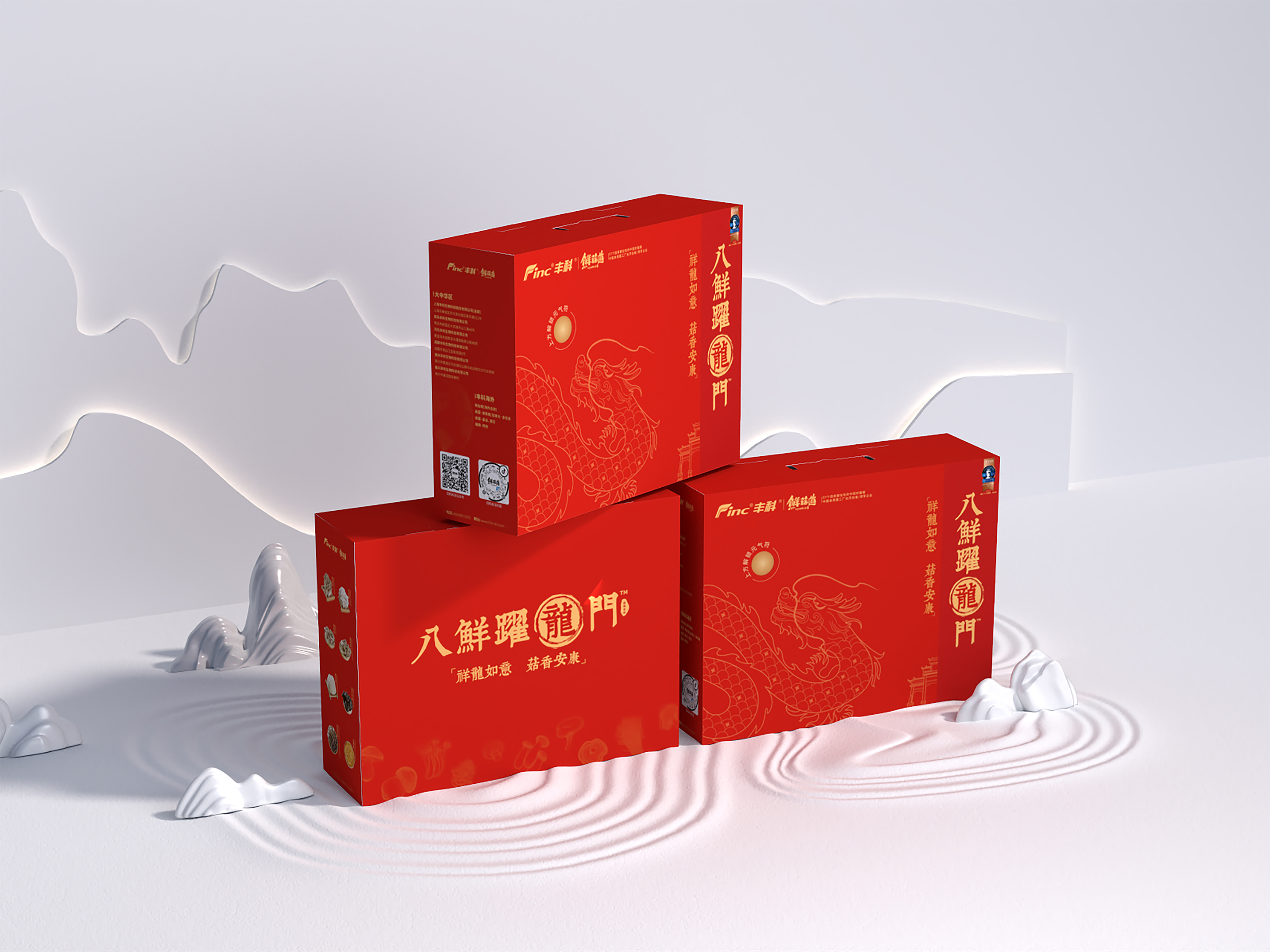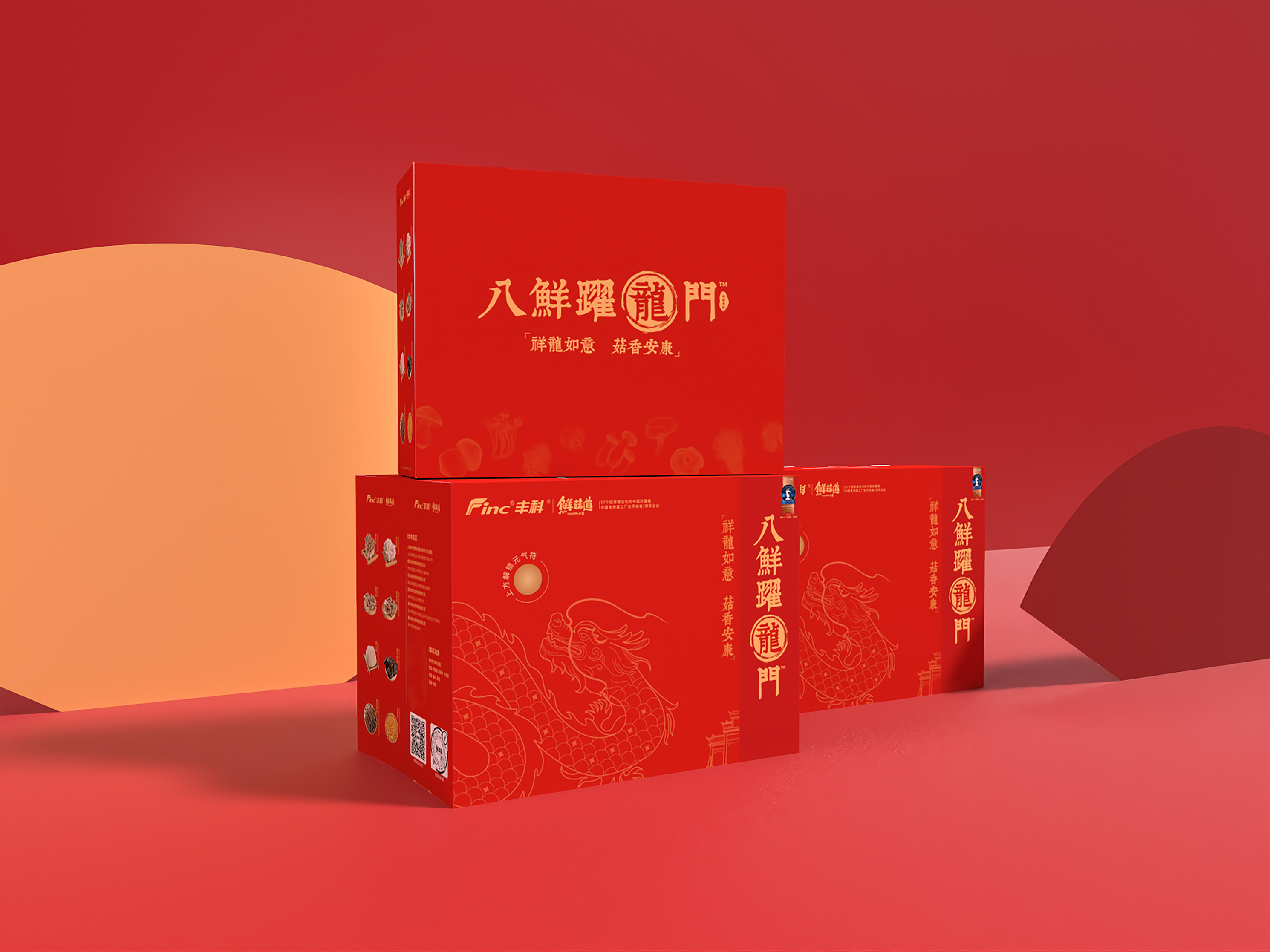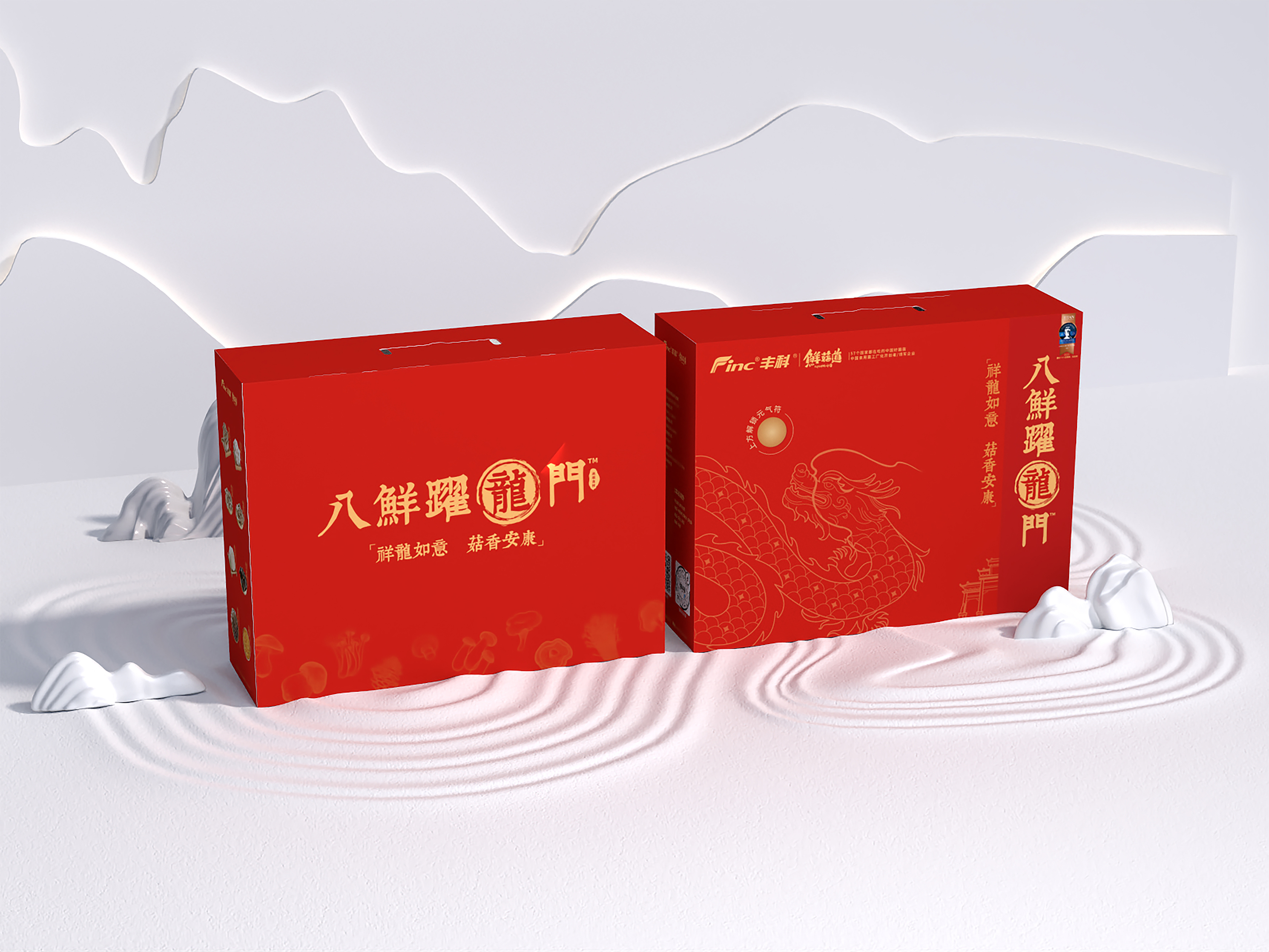 Ba Xian Yue Long Men is a specially designed gift box for Finc's product Fresh Mushroom in the Year of the Dragon. With Chinese red as the main color and the main image of the dragon leaping dragon door line drawing, the gift box aims to convey the brand culture, promote the sales volume of the product and enhance the corporate image through the gift box.