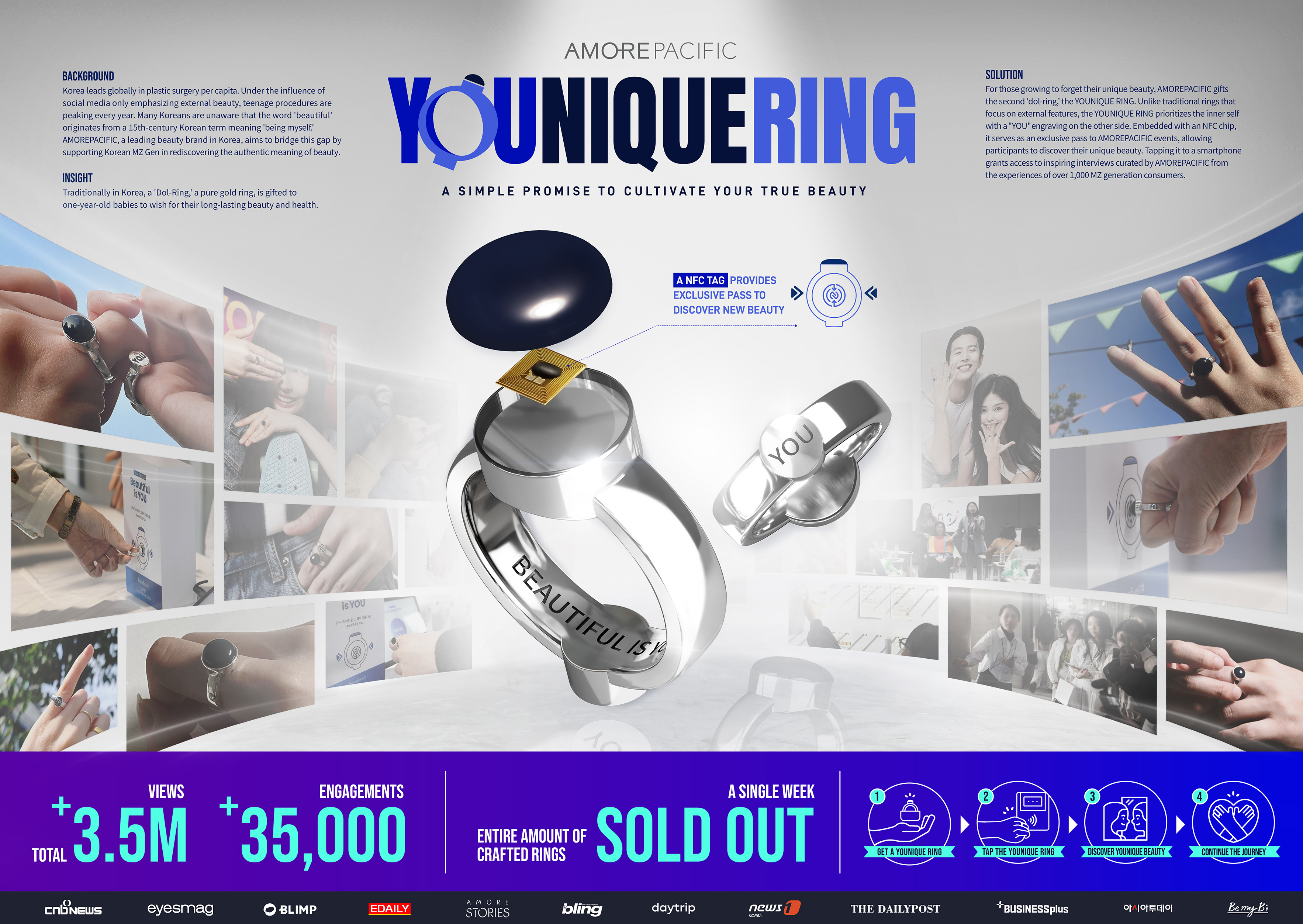 AMOREPACIFIC's pioneering campaign, "YOUNIQUE RING," strategically confronts Korea's societal fixation on external beauty, particularly exacerbated by social media influences. With Korea leading globally in plastic surgery per capita, the campaign's mission is to inspire a transformative shift, urging the MZ generation to embrace and celebrate their unique inner beauty in defiance of prevailing narrow beauty standards.