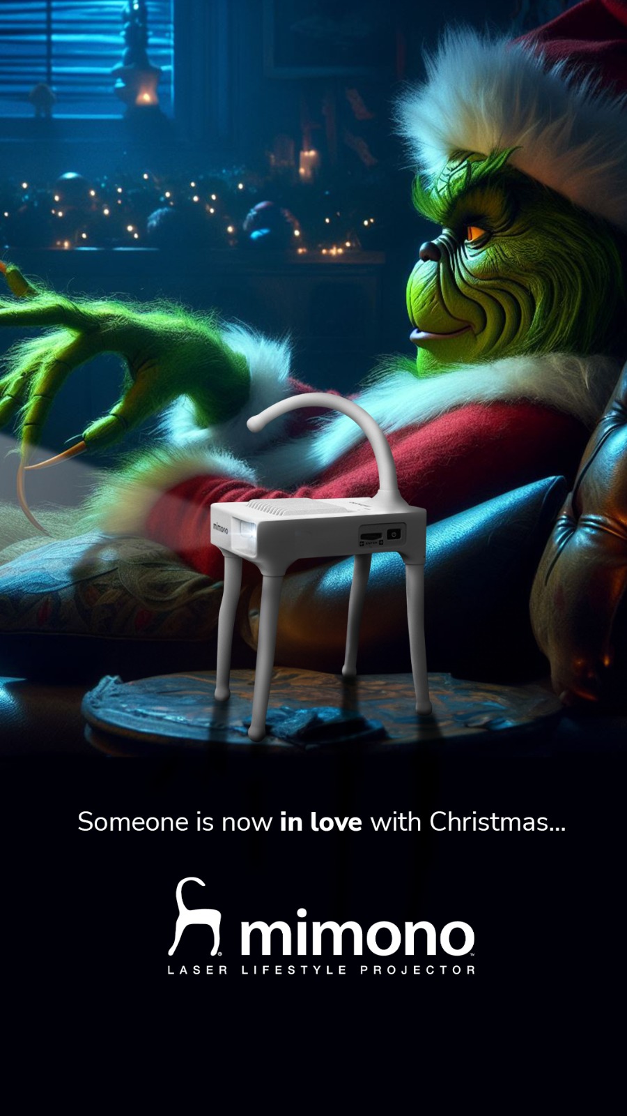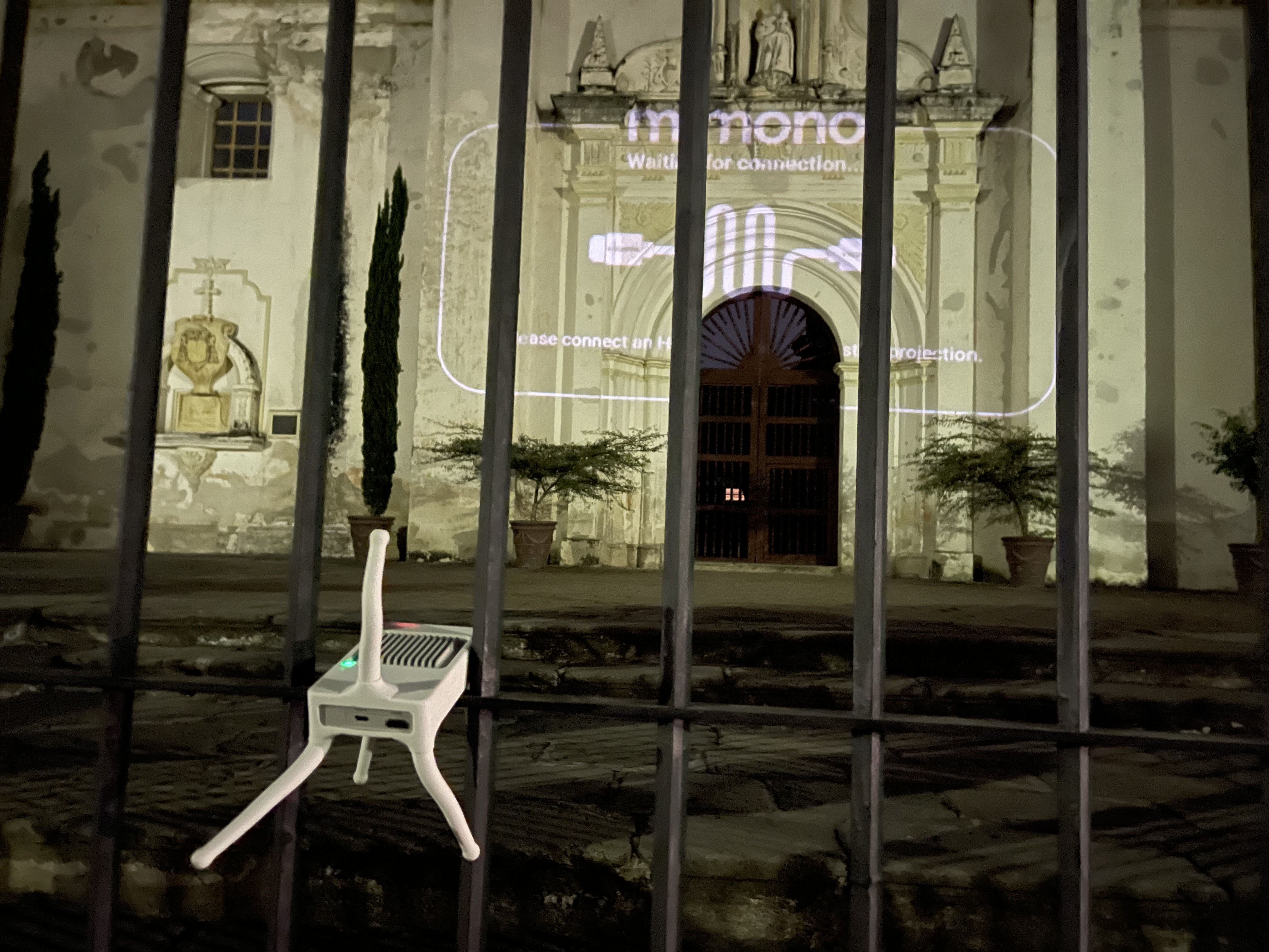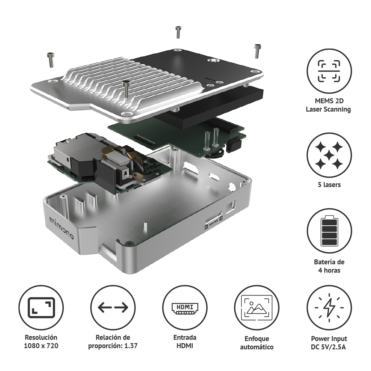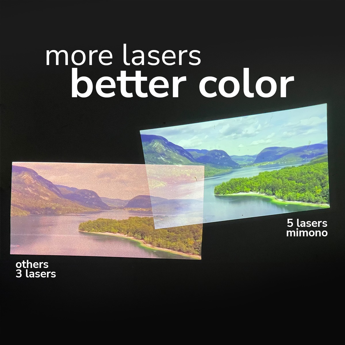 Mimono 5 Laser Portable Projector- Dynamic, fully automatic direct connectivity. 4 hour batery adjustable to any surface patented heat dissipation technology. All in one very small package.