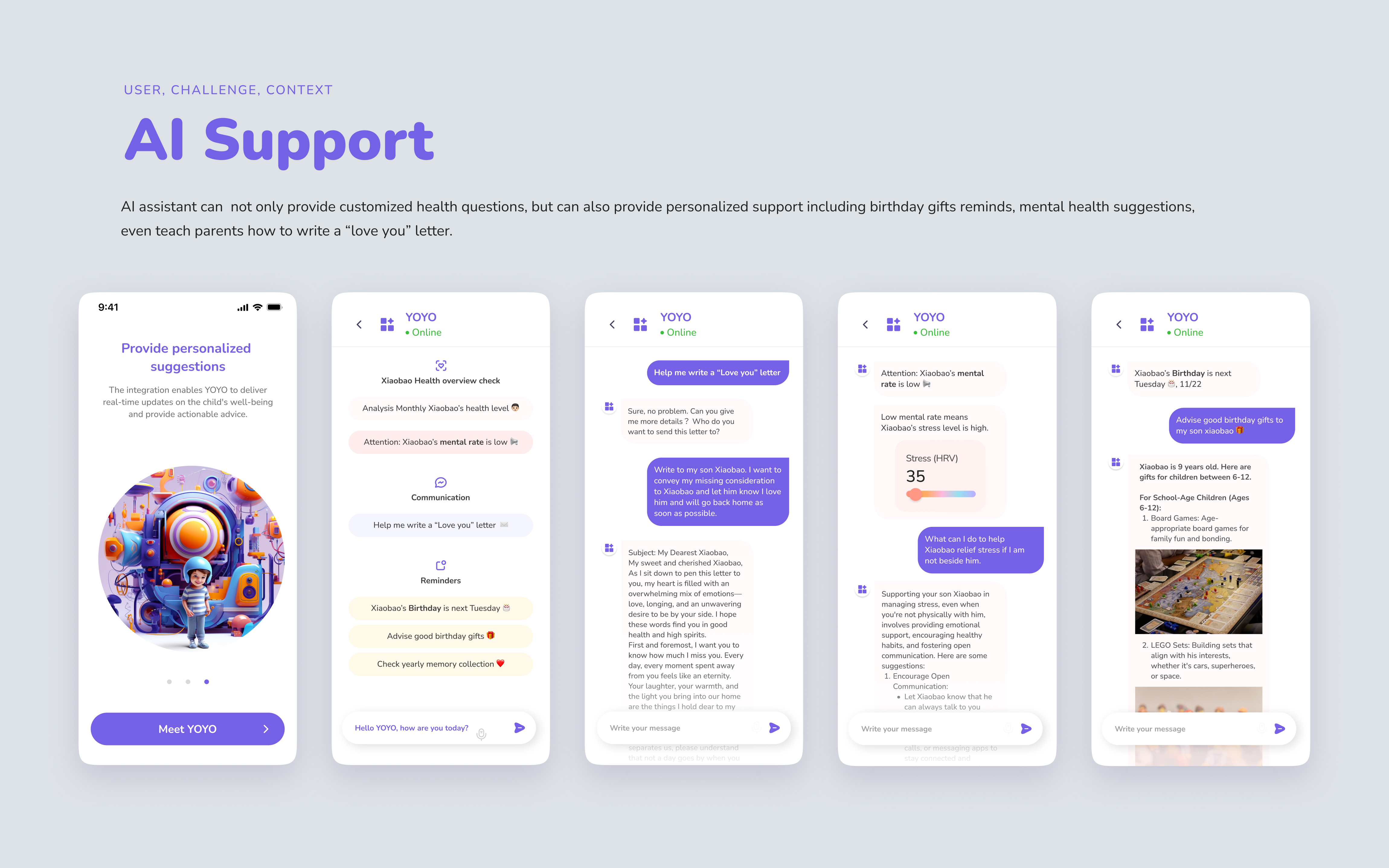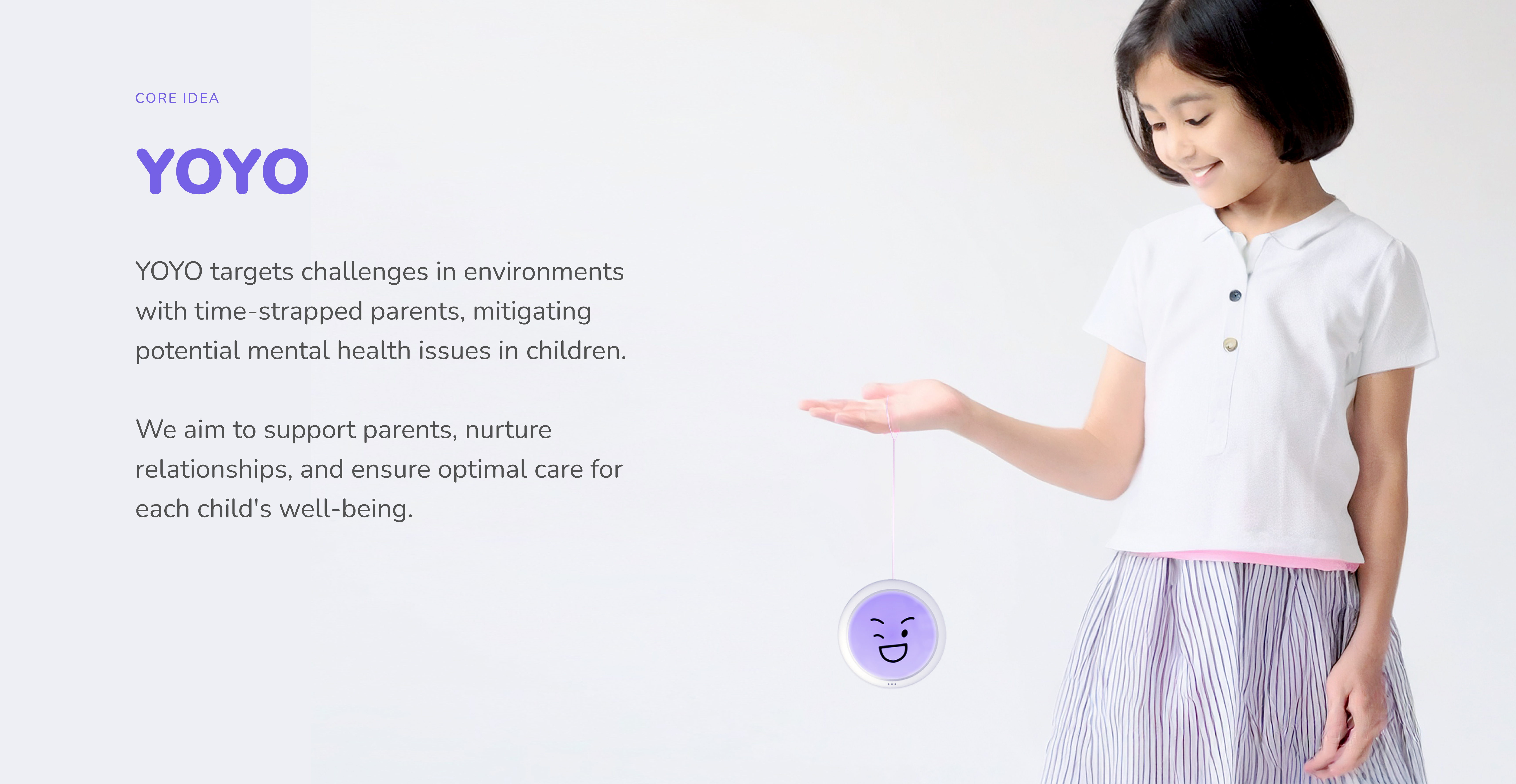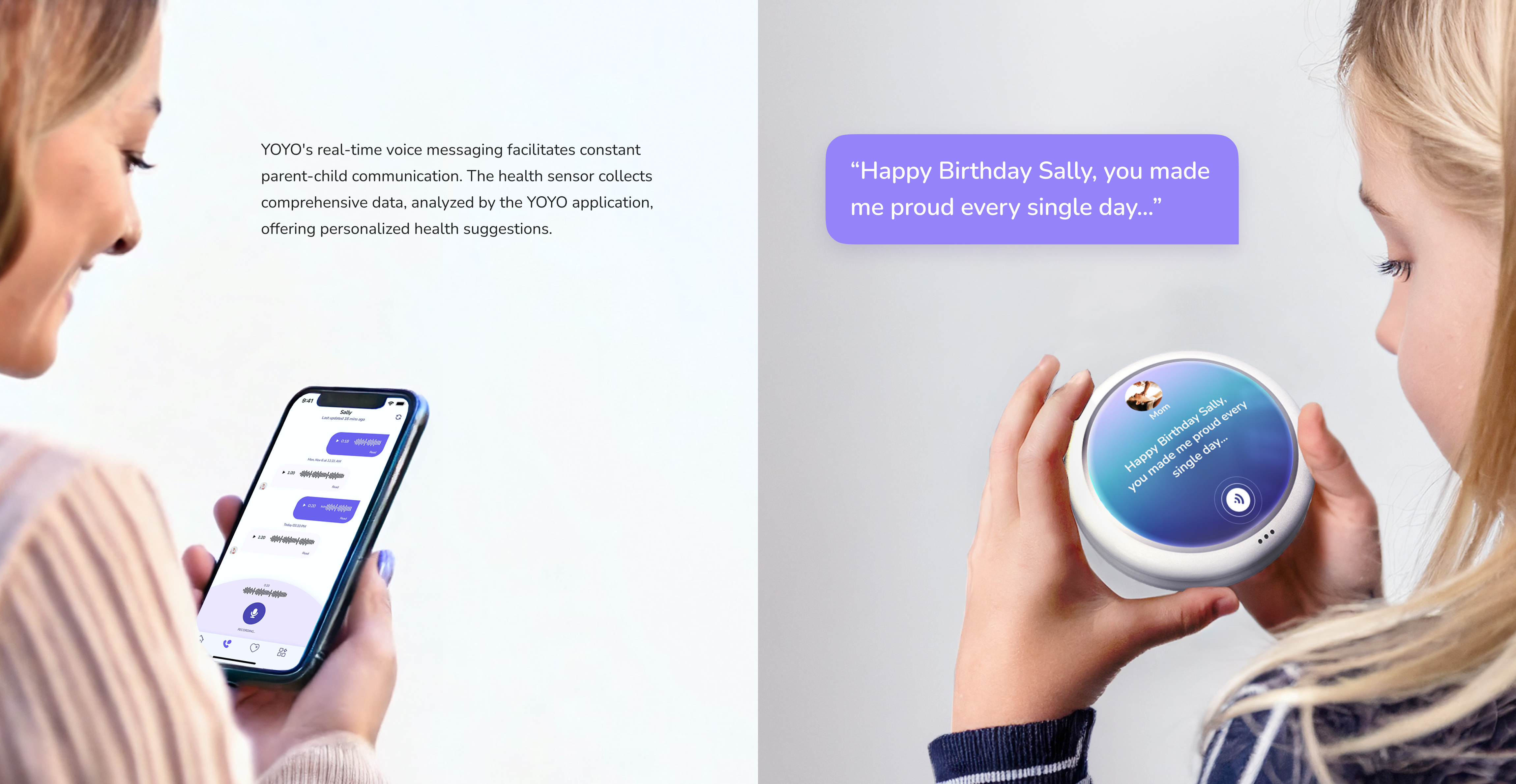 YOYO, an intelligent assistant utilizing AI and voice technology, fosters enhanced communication between parents and young children. Addressing the challenges of busy schedules hindering parental engagement, YOYO aims to tackle kids' mental health challenges through direct communication tools, real-time tracking, health monitoring, and personalized suggestions. As a parental representative, YOYO integrates AI to address specific inquiries, ensuring a holistic approach to child development.