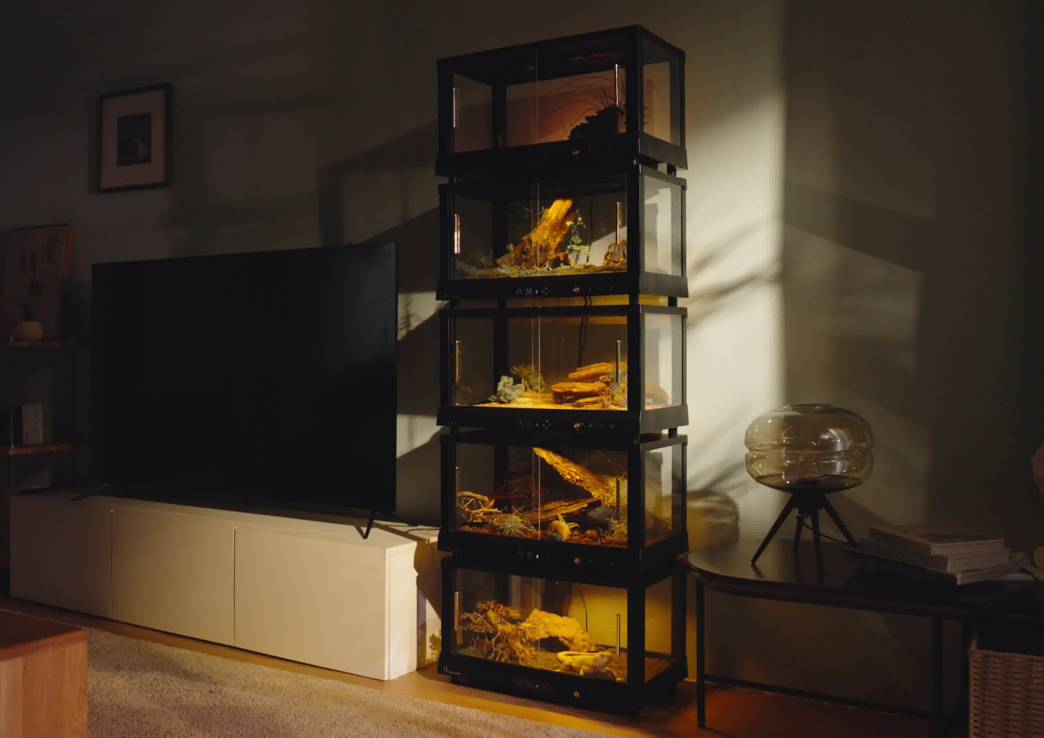 Eguma-CP1 All-In-One Pet Enclosure, featuring personalized customization, convenient installation, wireless-powering design and functional integration, not only provides an ideal habitat for various small pets such as insects, reptiles and amphibians, as well as plants, but also offer users a more effortless and smart breeding experience.