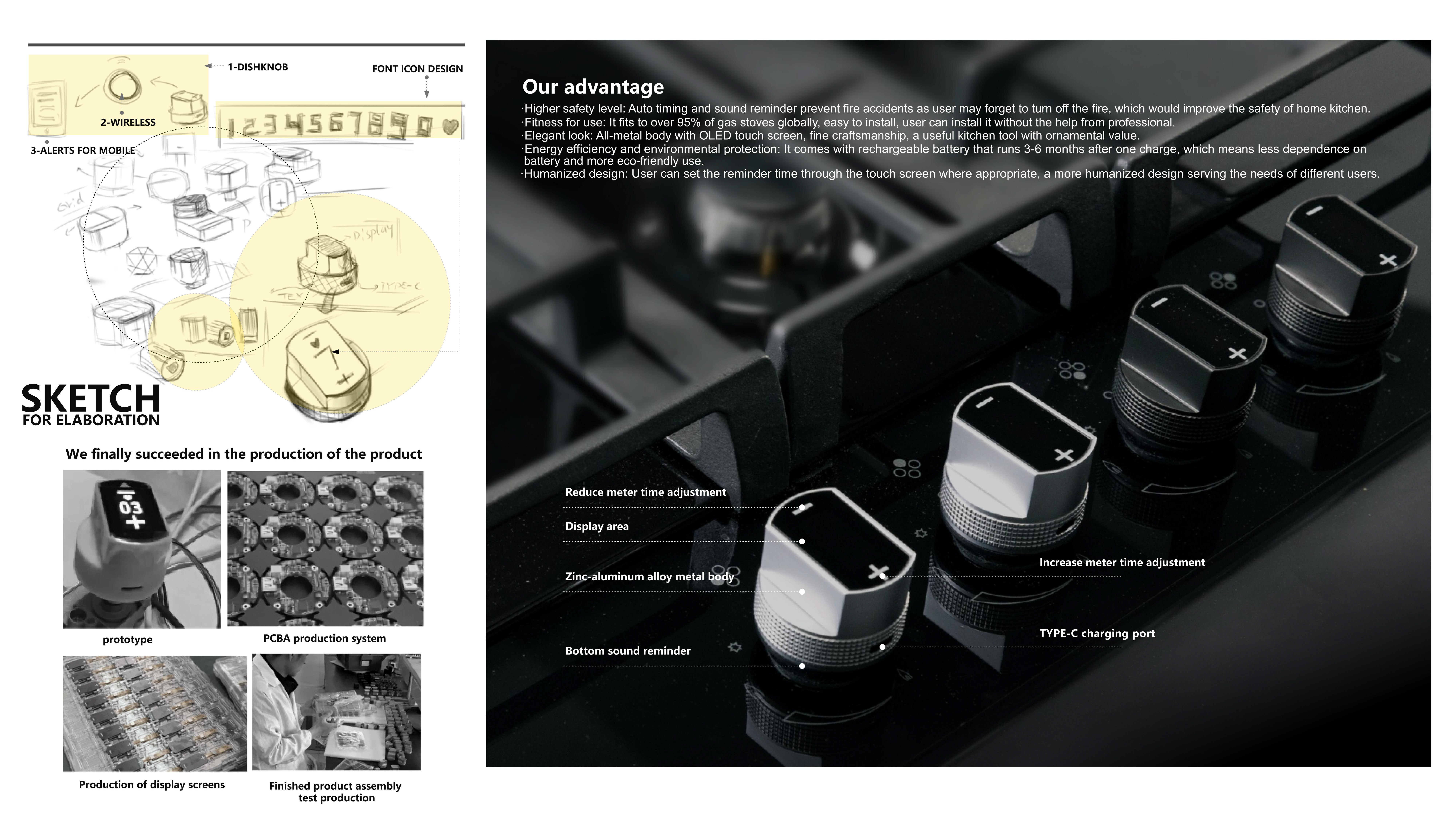 Dishknob is a gas stove knob with an automatic timer reminder function. It can be installed on more than 90% of gas stoves. dishknob has an exquisite appearance and strong versatility. It can be used for half a year on a single charge. With dishknob, you can avoid dry burning in the kitchen or even fire. Suitable for elderly families or families who often cook at home.