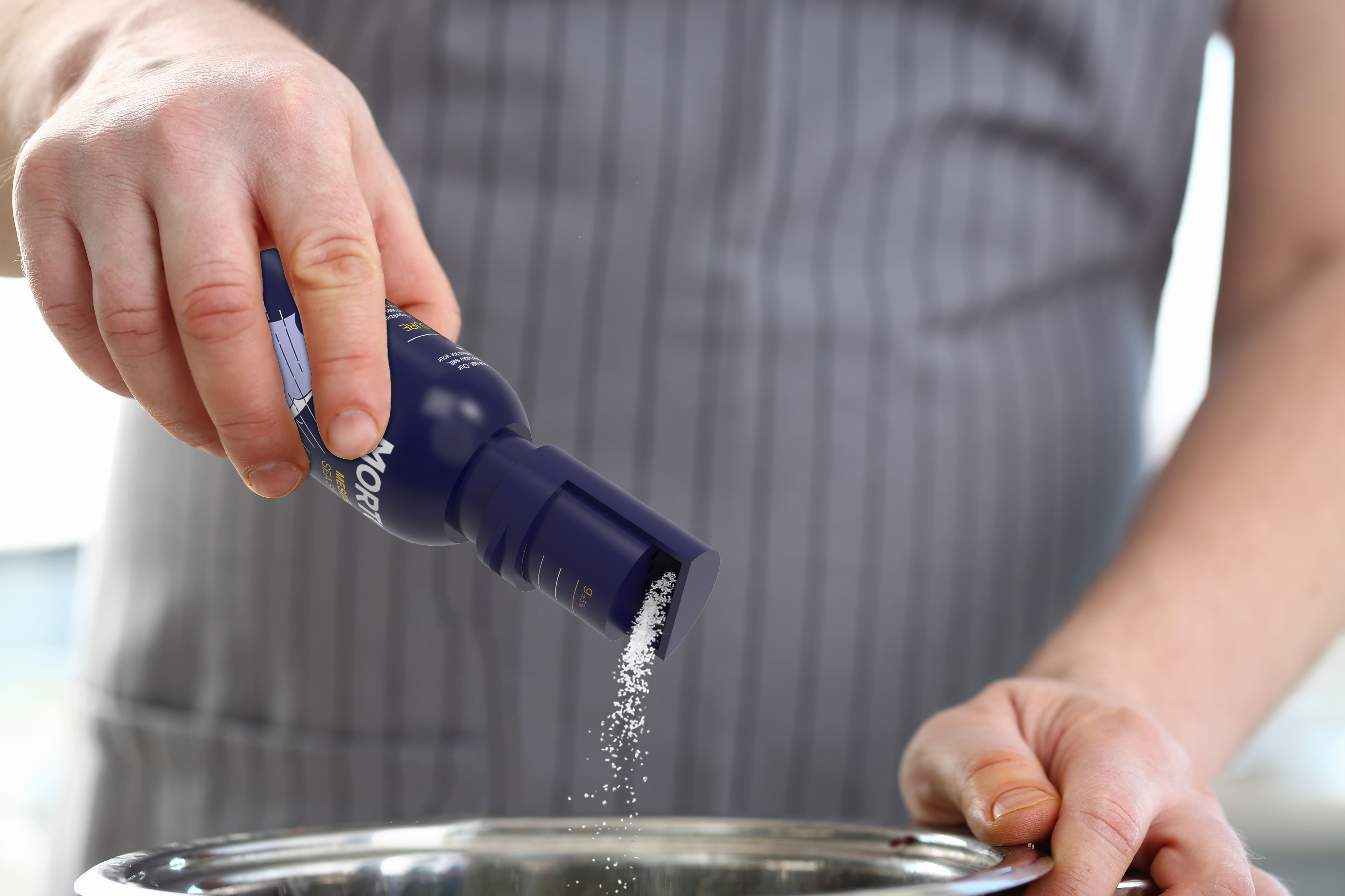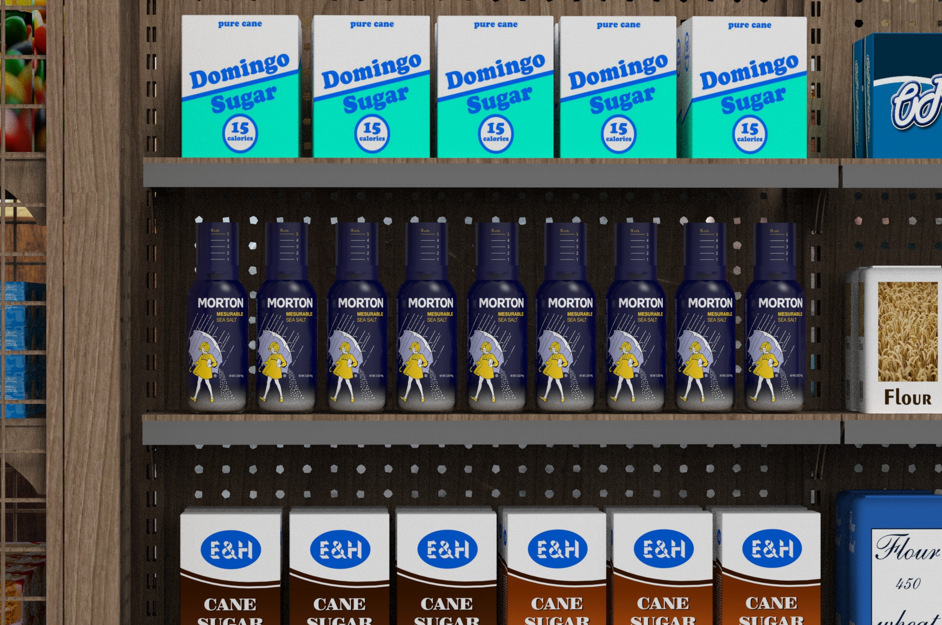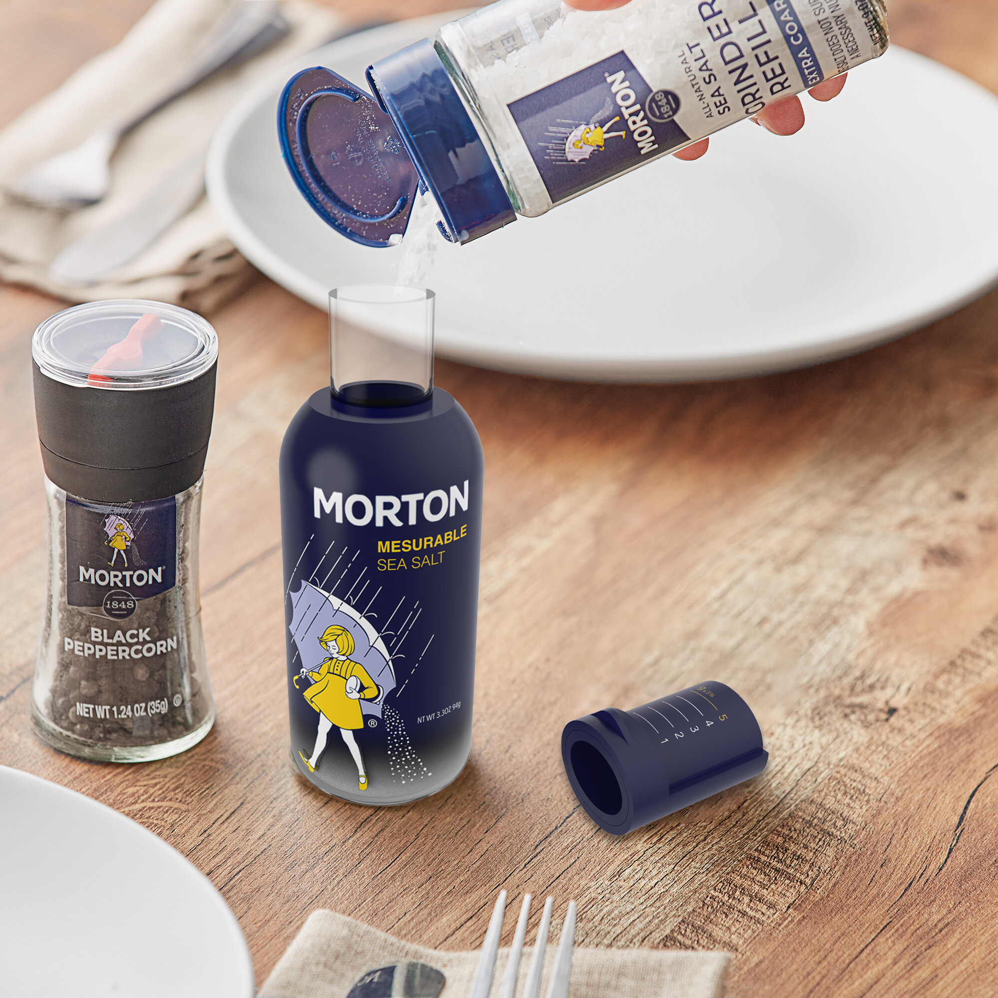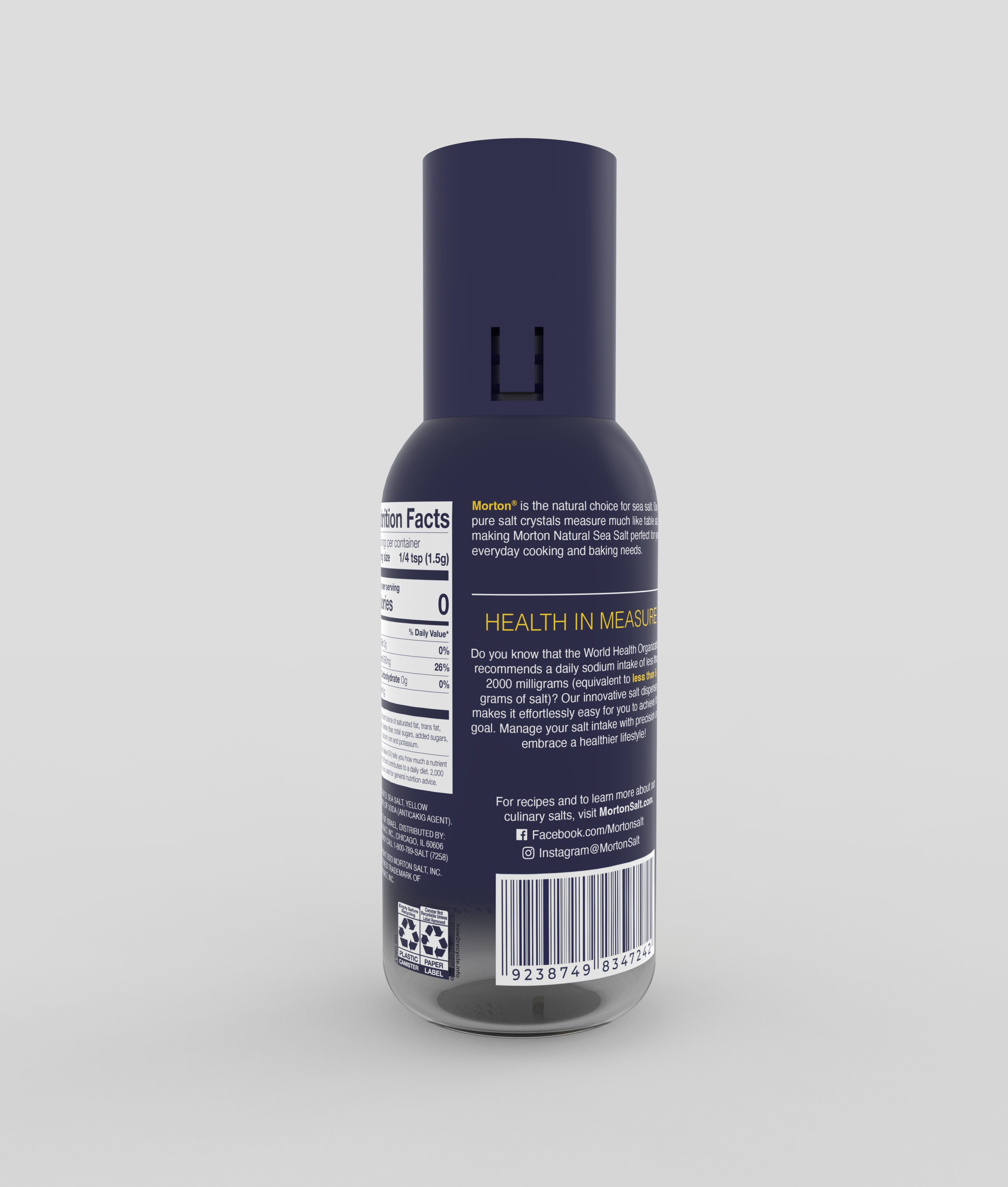 This project is a salt shaker packaging design specific for Morton. What makes it differentiated from similar salt shaker packages available in the market is uncluttered and unaffected form. The mating of the graduated groove and the snap-fit mechanism allows user to accurately dispense 1-5 g salt. It is easy to operate with just one hand. This metering salt shaker supports refilling and reuse. The transparent label on the bottom helps user see how much salt is left.