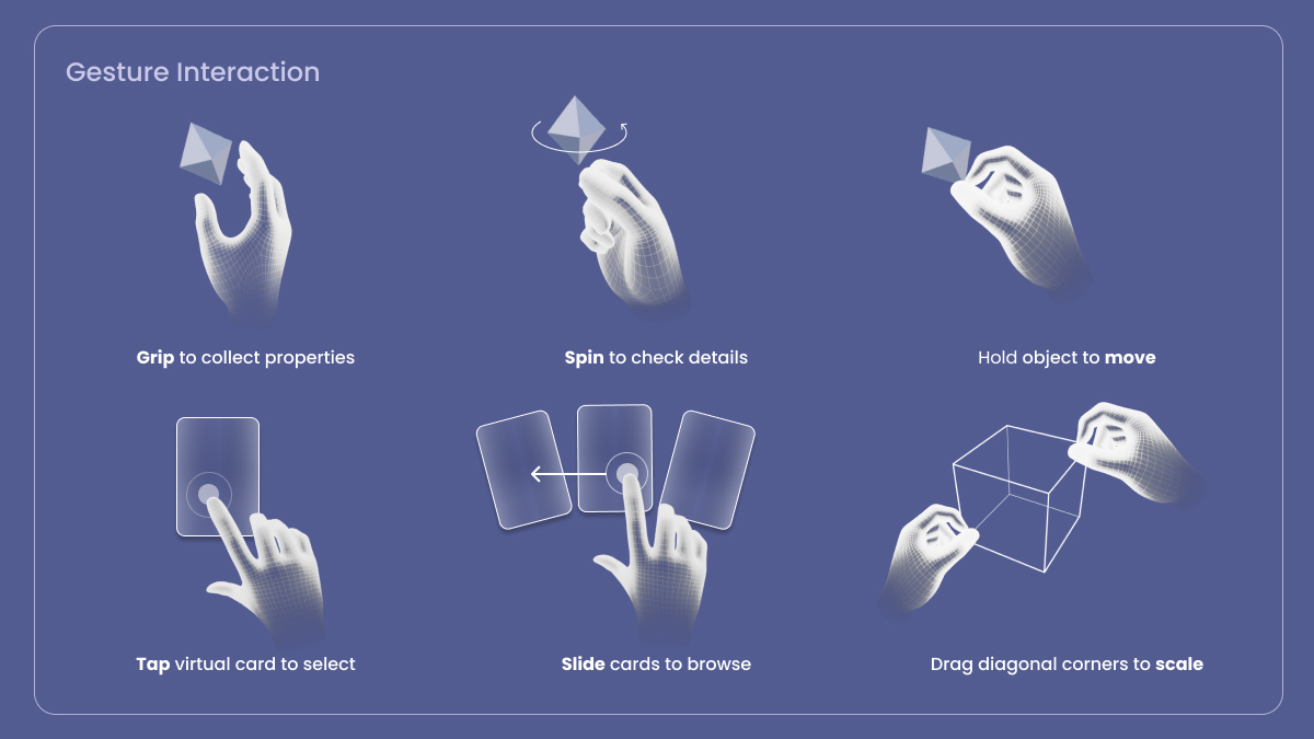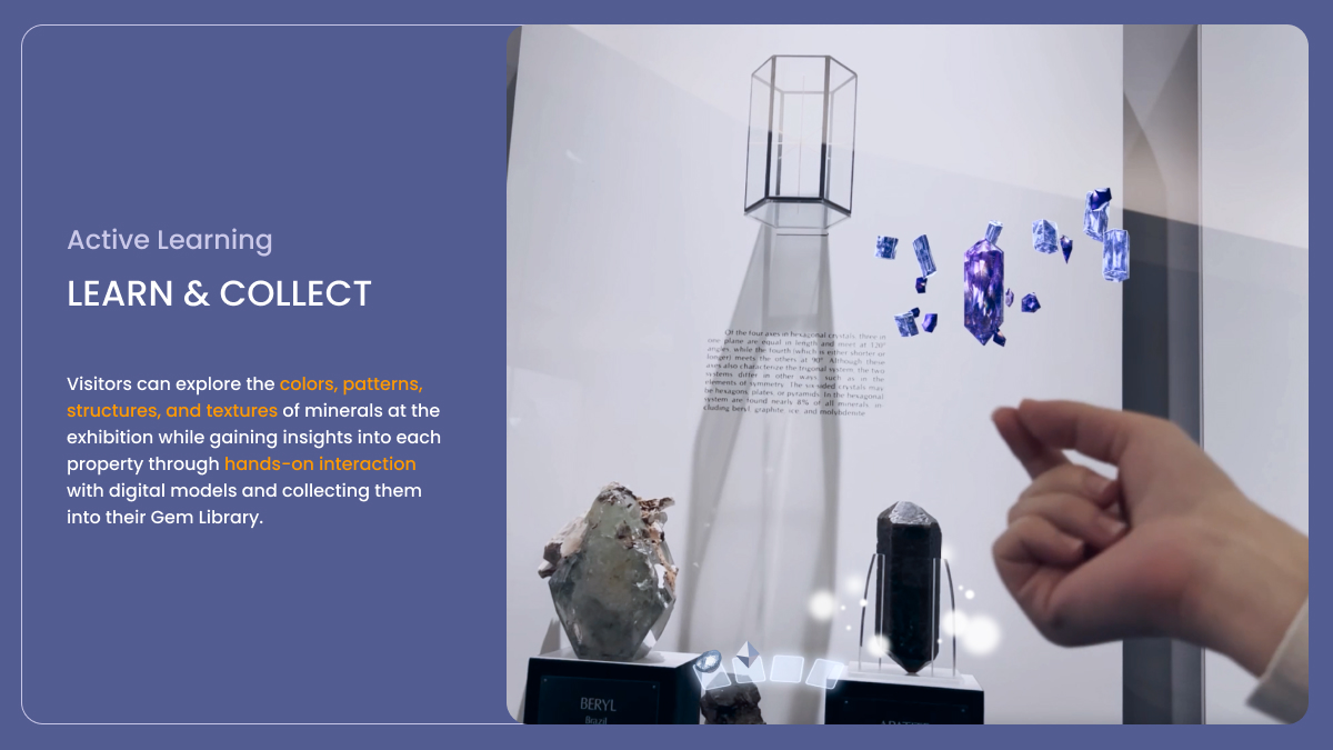 The essence of GAIA lies in its ability to turn the museum visit into an active exploration. Visitors embark on a journey of discovery, where they can collect virtul elements of gems on an MR headset while learning about the intricate details of minerals-colors, patterns, structures, and texture-through hands-on interaction. This exploration differs from traditional museum experiences that involve only one-way observation. GAIA is all about engaging visitors through digital gem collection, creating a personal Gem Library, and making the learning experience interactive and personalized.