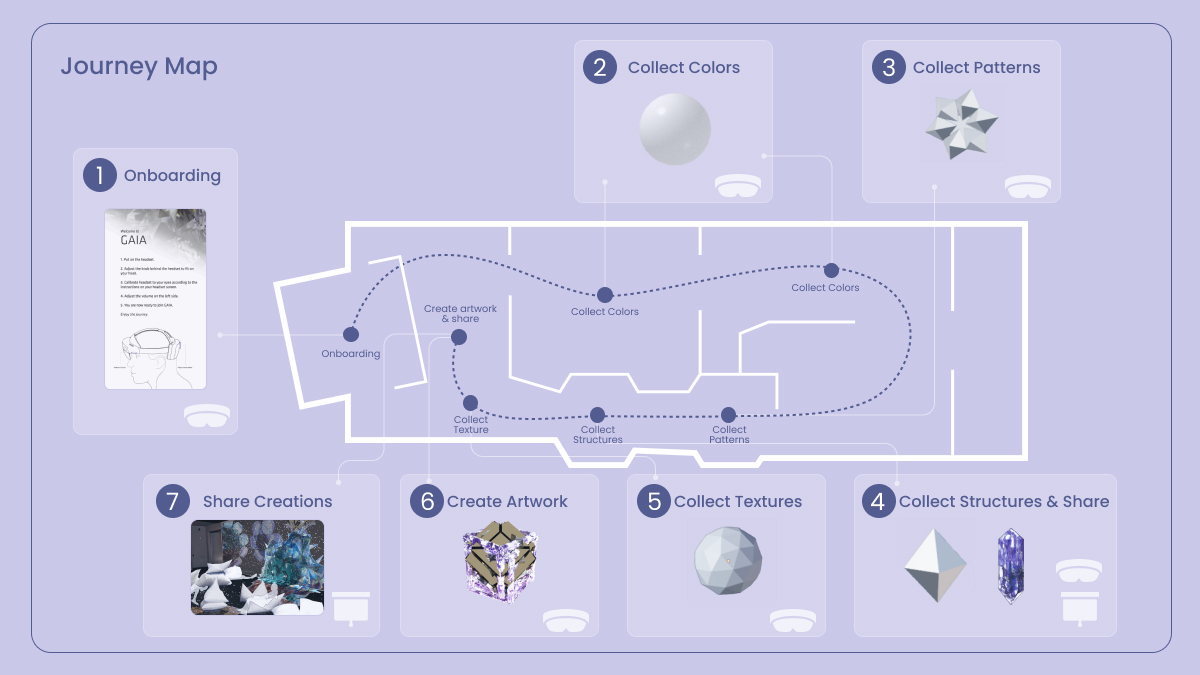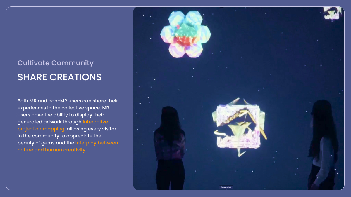 The journey through GAIA culminates in a shared communal space, where visitors can showcase their unique creations. These creations are not just displayed but celebrated, bridging the gap between MR and non-MR users. This allows everyone to collectively appreciate the artworks and fosters a sense of community among visitors. They share and admire the beauty of gems and the creativity they inspire in human expression.