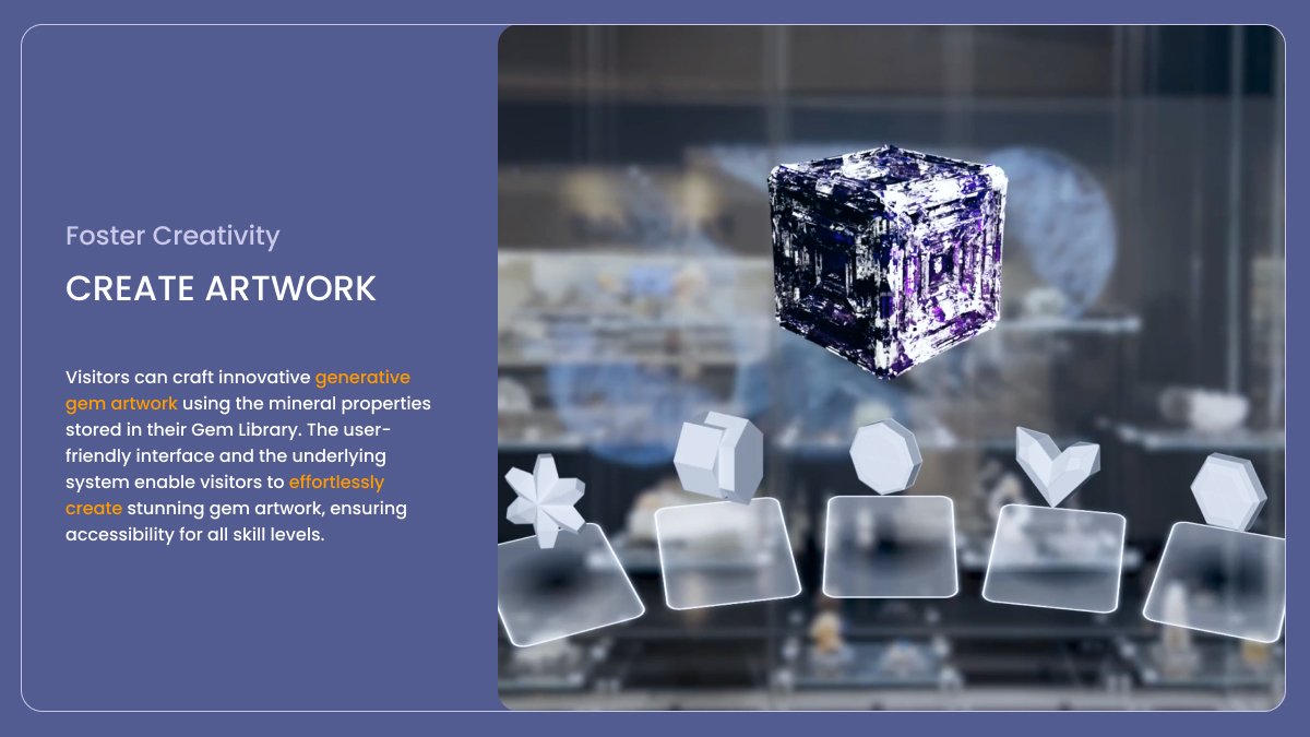 In this immersive environment, creativity flourishes. Visitors use the mineral properties they've collected to create unique, generative gem artwork. This aspect of GAIA democratizes the artistic process, enabling people of all skill levels to express their creativity through a user-friendly interface. The result is a direct reflection of the individual's interaction with the natural beauty of gems, transformed into stunning visual artwork.