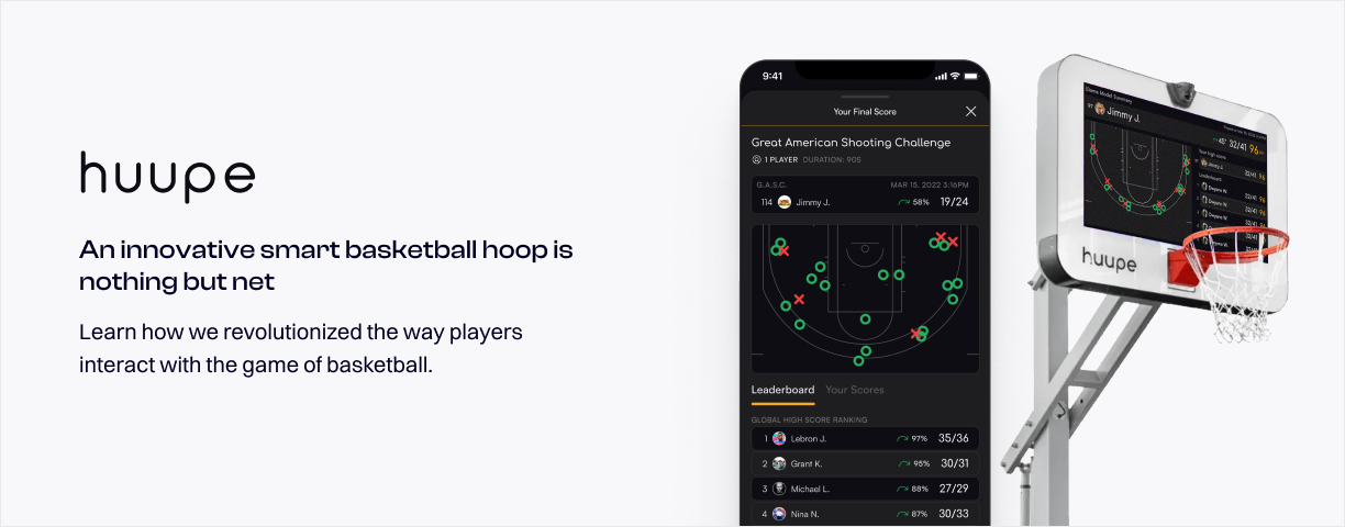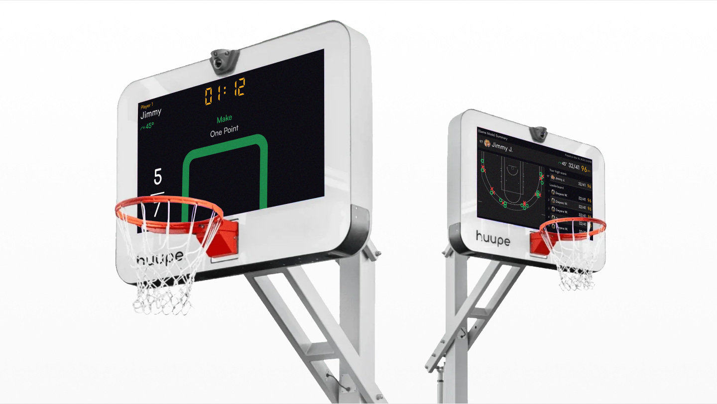 The “Huupe” features a digital screen on its backboard and a camera with a lidar system mounted above. The design is not just for shooting hoops, but for revolutionizing the way players practice and interact with the game of basketball.