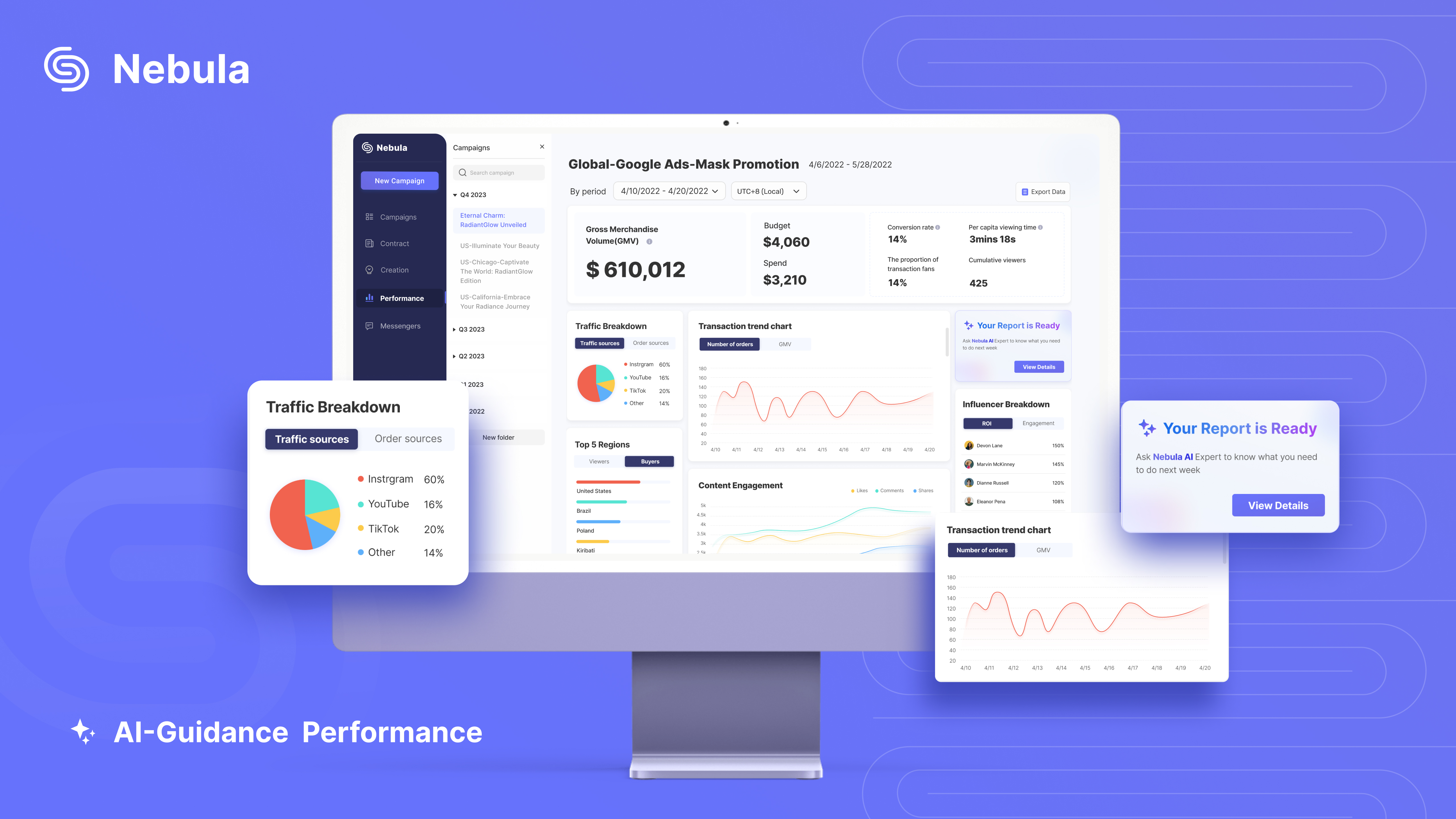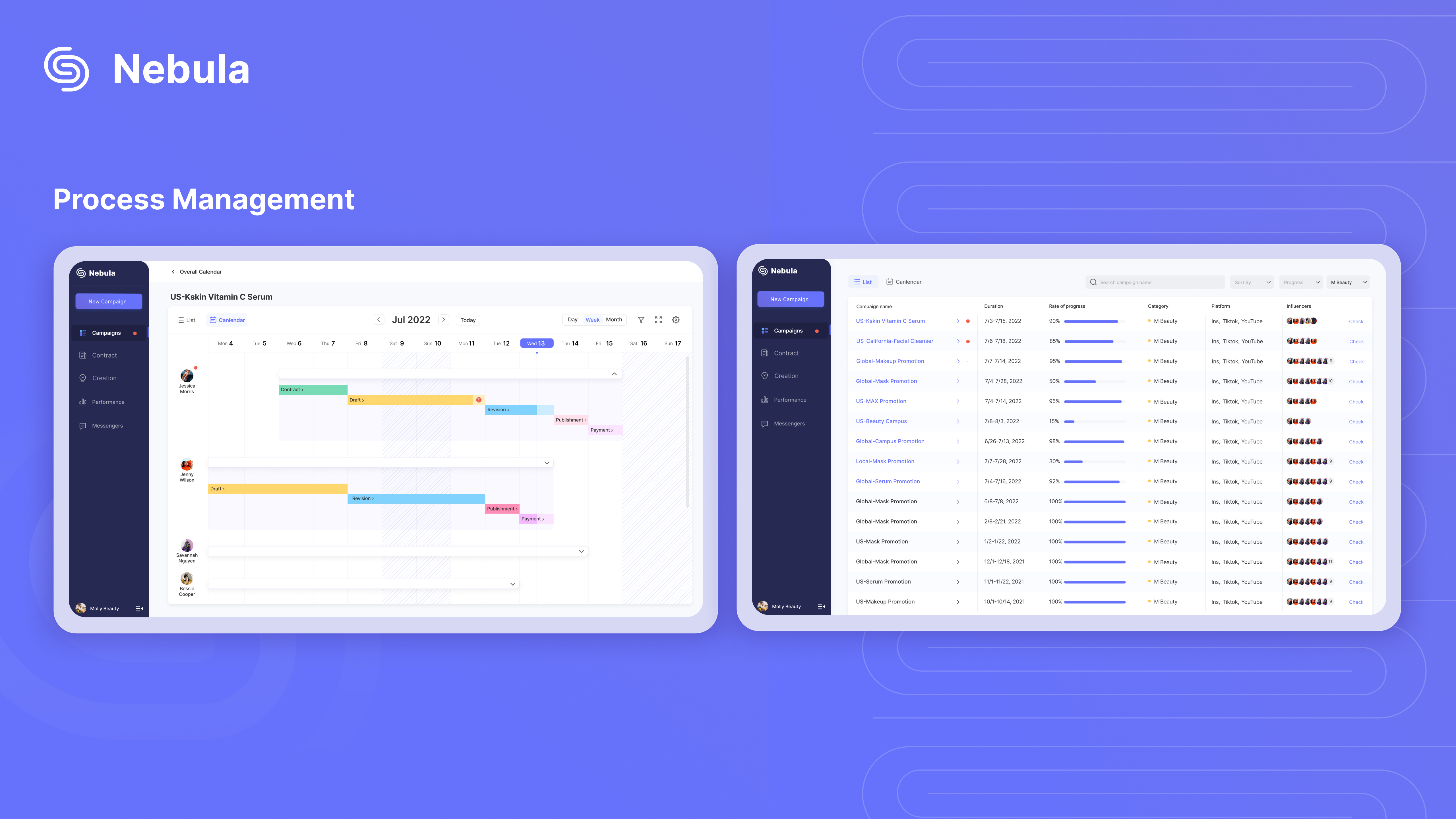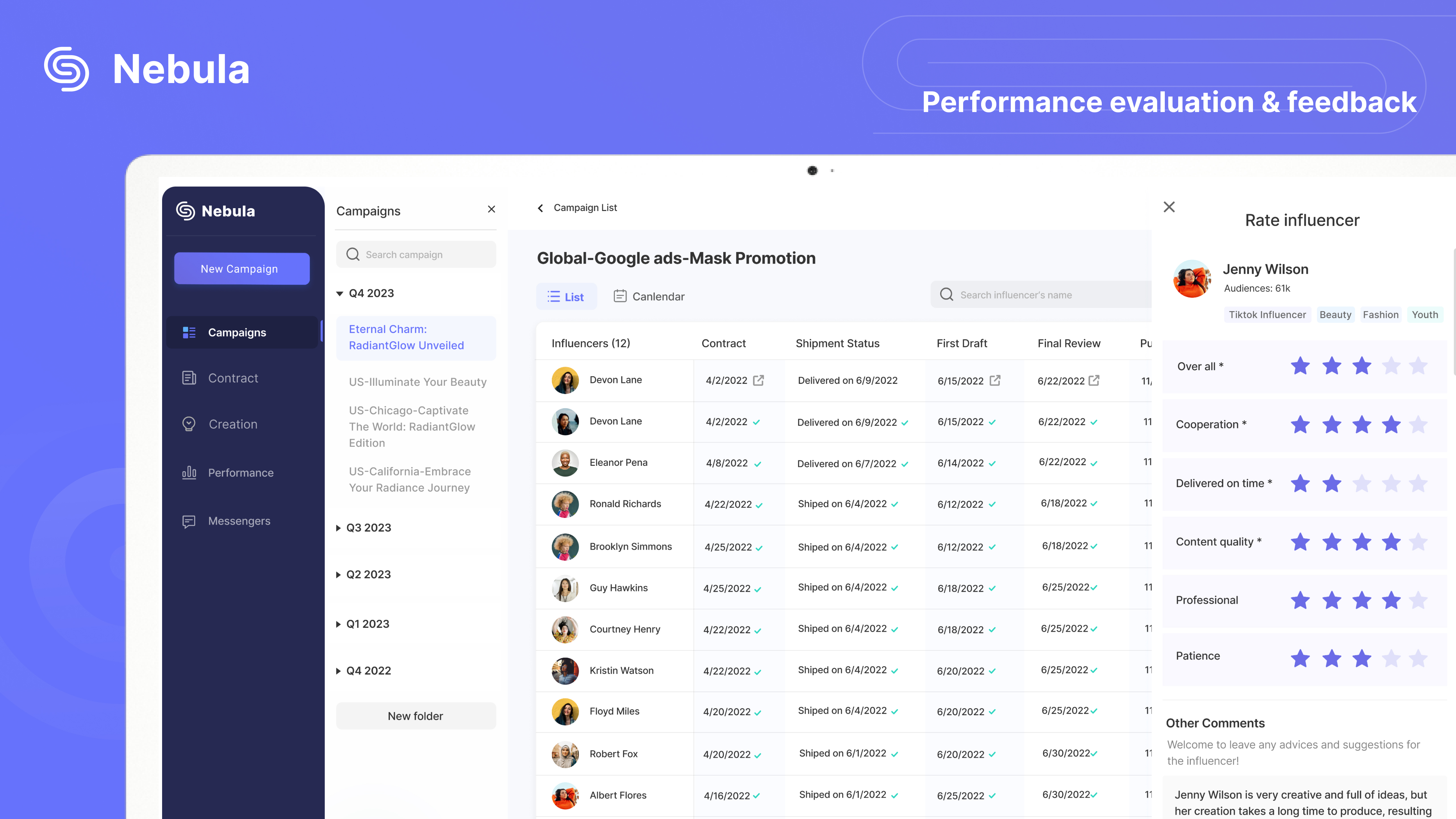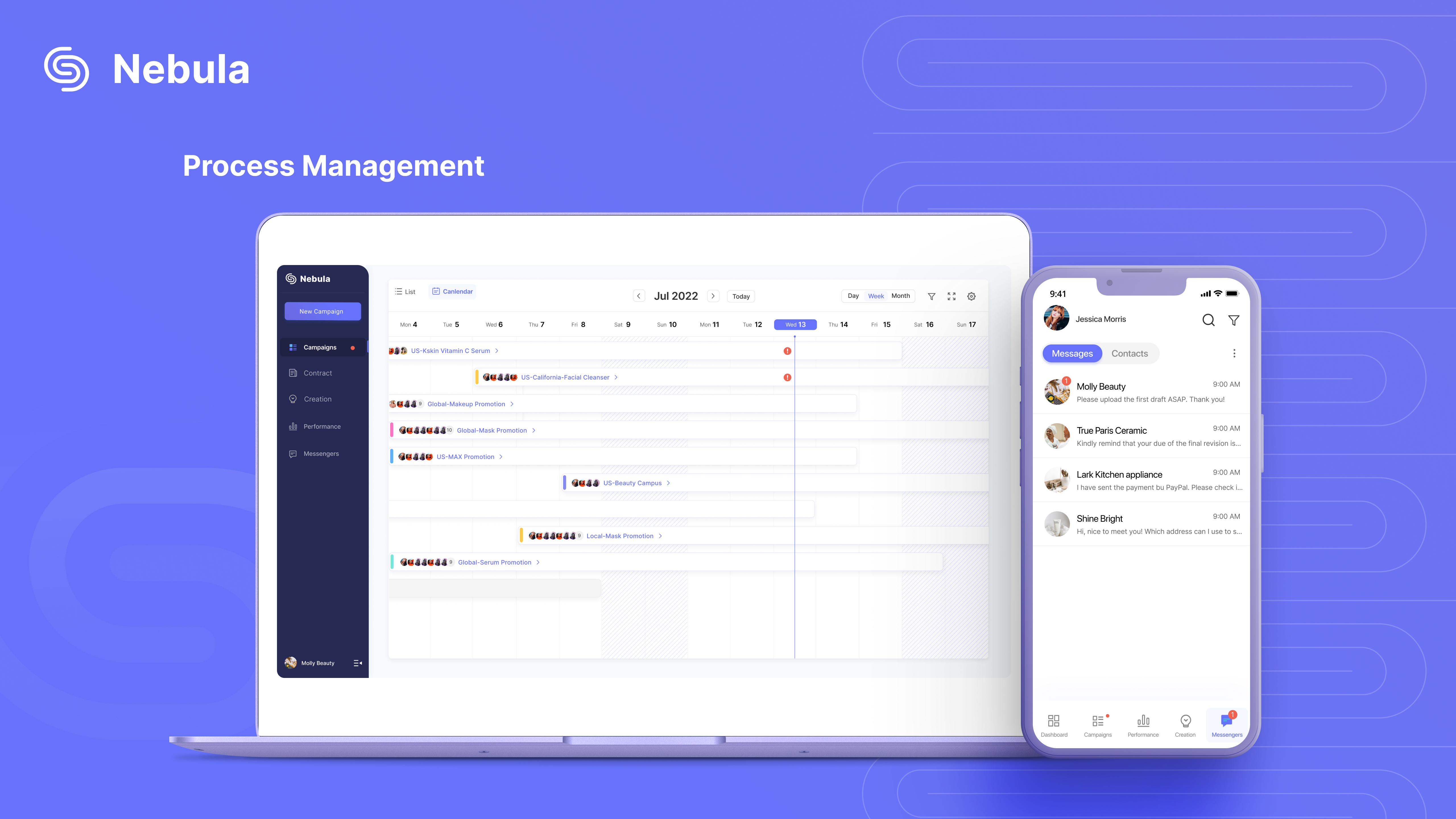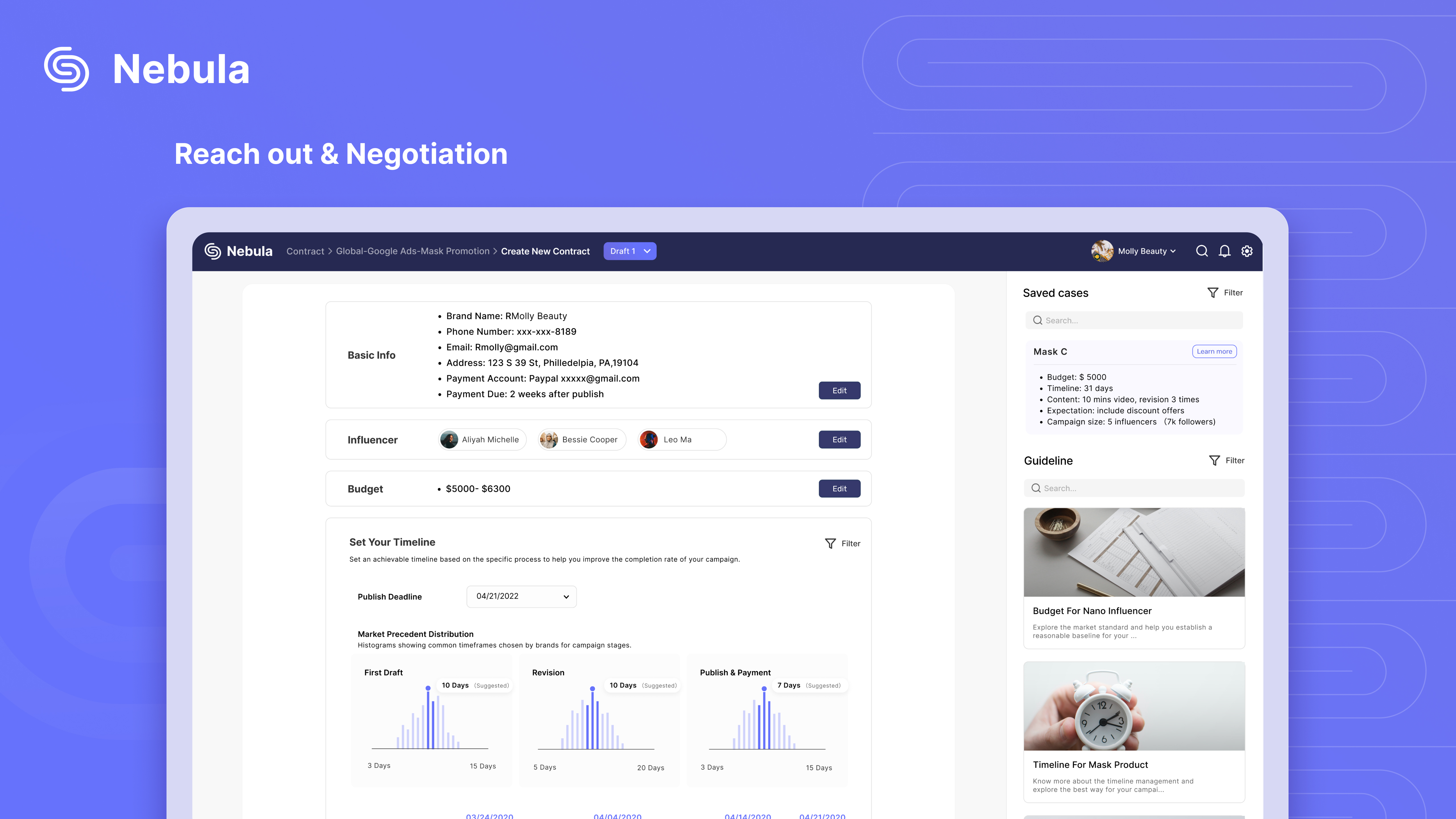 Nebula empowers SMBs to customize every step of their campaigns, providing easy, step-by-step guidance throughout the process. For influencers, Nebula ensures effortless task tracking and seamless organization of files. Never miss a beat with timely reminders, enabling prompt responses and efficient campaign management.