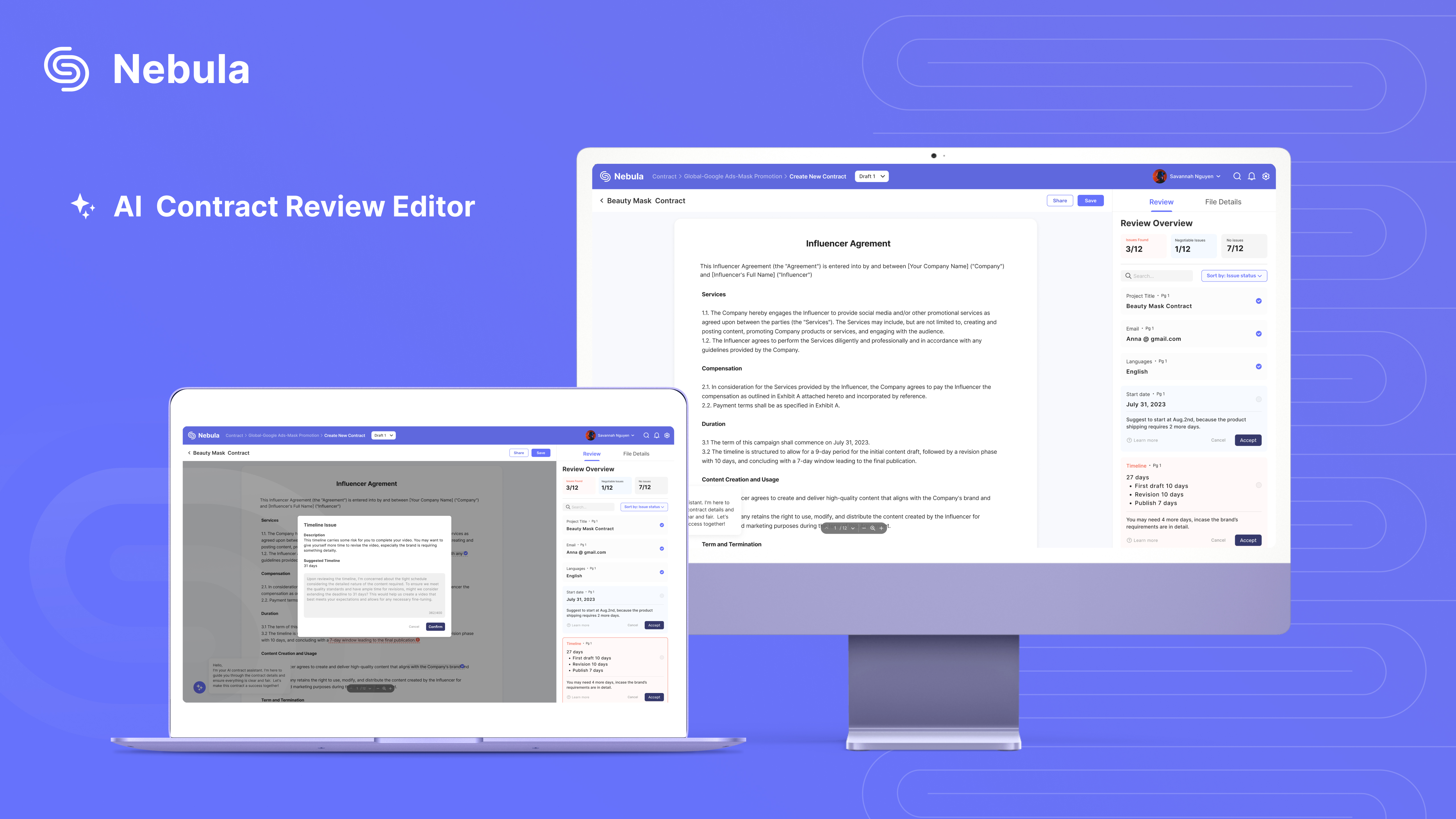 For SMBs, Nebula offers actionable tutorials and comprehensive references, providing valuable market insights during contract drafting. Influencers can face new contracts with confidence as Nebula's AI meticulously reviews each clause, offering expert insights and allowing easy comment insertion with just a click.