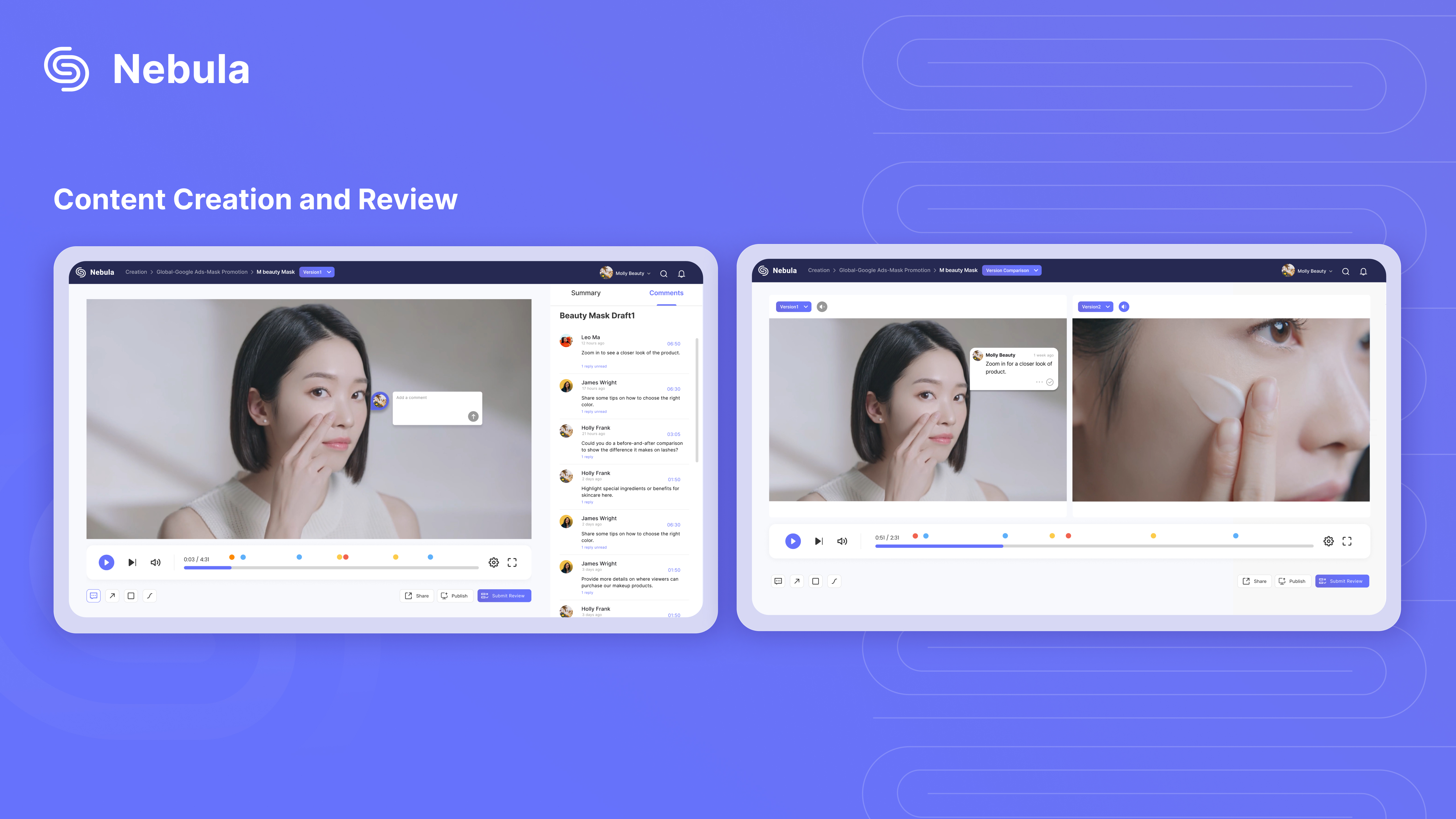Nebula streamlines the review process, allowing instant updates and easy content reviews for timely and effective feedback. With just one click, enter the video review page where Nebula AI optimizes your workflow, providing quick summaries and enhancing review management efficiency.