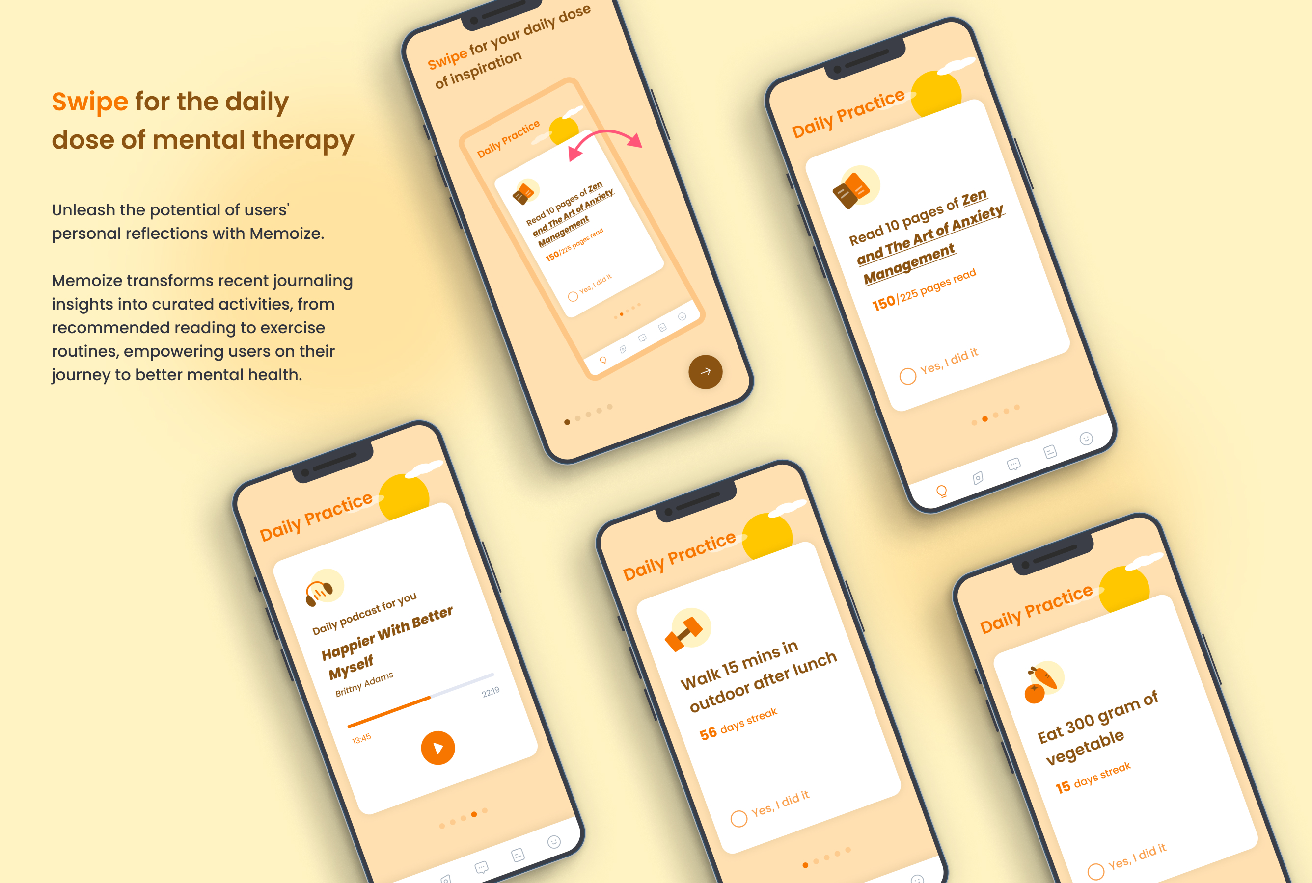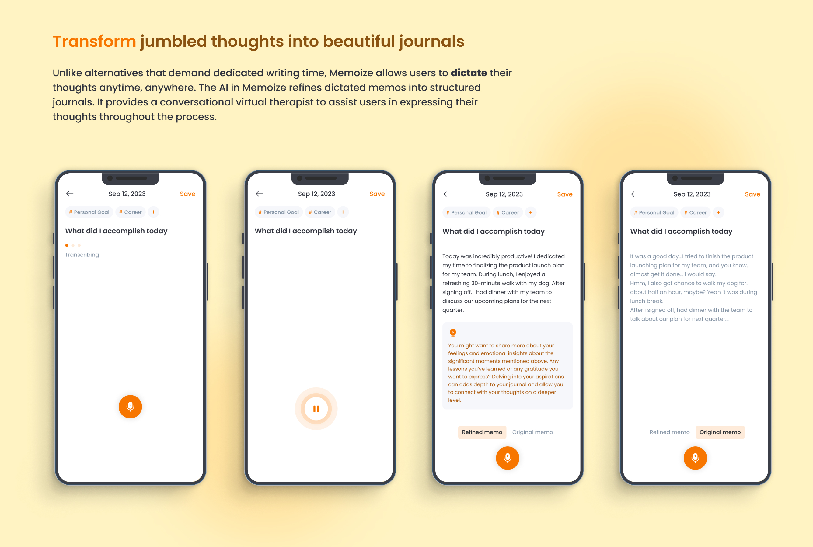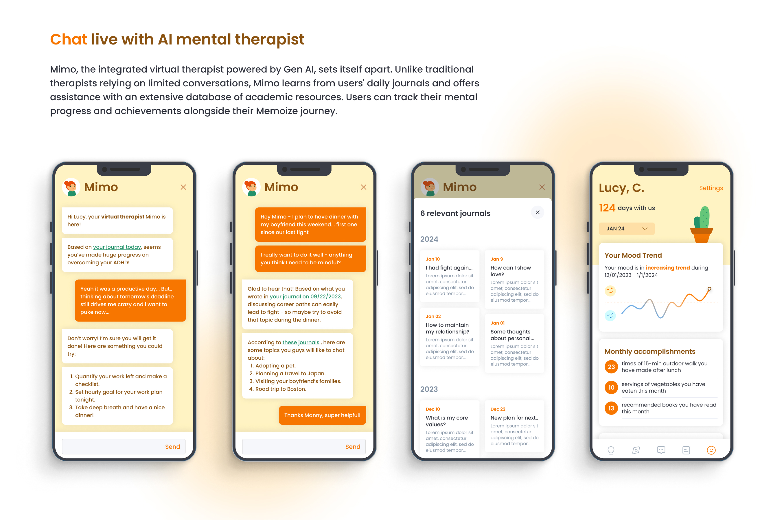 Memoize is a revolutionary AI-driven mental therapy app crafted to elevate thoughts and empower minds. With Memoize, users delve into diverse journaling topics and effortlessly dictate their thoughts, refining them into structured journals with the assistance of AI. Through analyzing users' journals, Memoize's AI therapist, Mimo, curates personalized daily activity suggestions encompassing exercise, nutrition, reading, and podcasts, tailored to support users in maintaining their mental well-being. Moreover, users can easily track their mental progress and milestones on Memoize, thanks to intuitive visualizations. With Memoize, users unlock the potential of their personal reflections and embark on a transformative journey towards enhanced mental well-being.