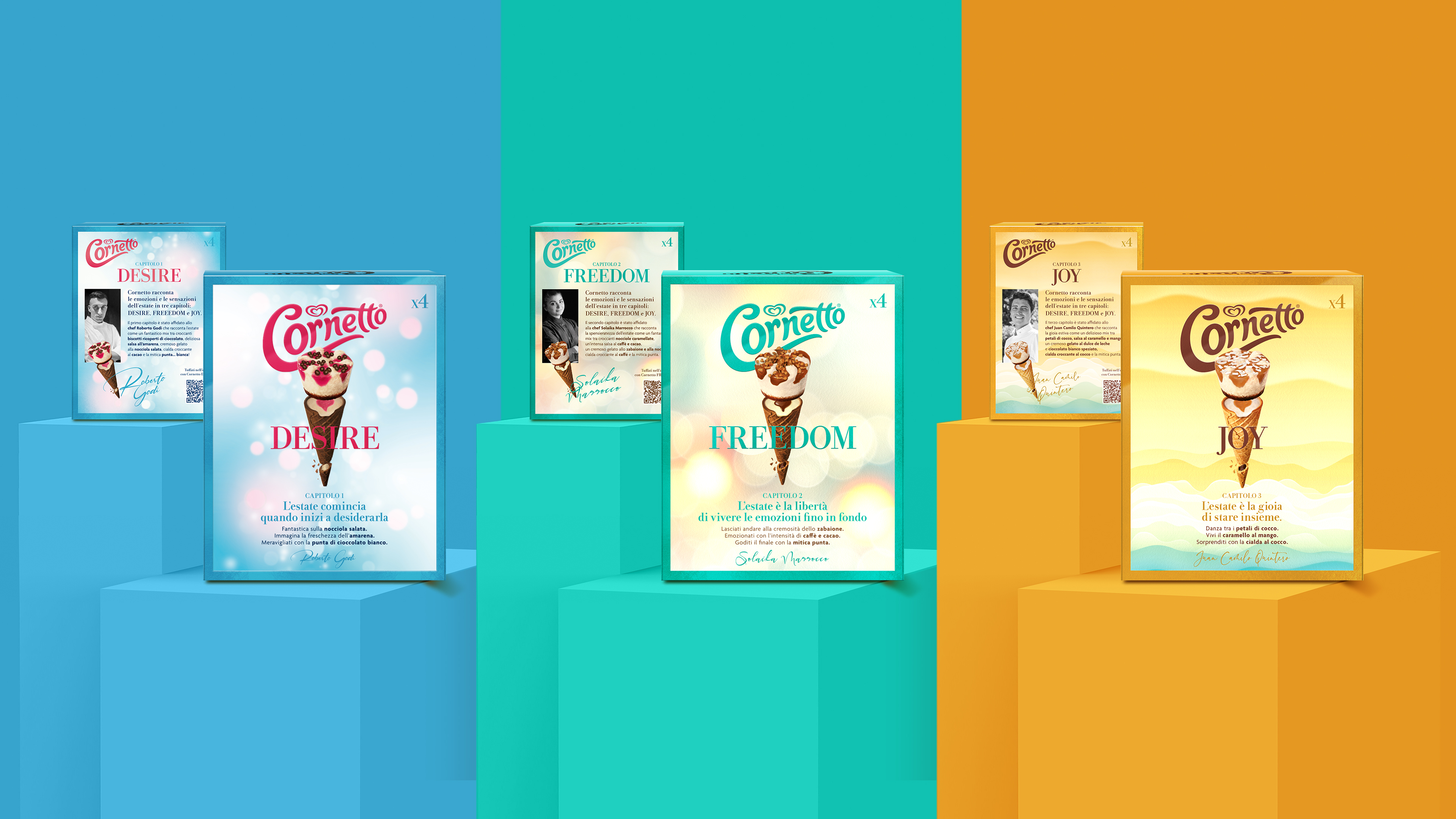 Mission: Develop on-pack communication of the limited editions "Cornetto Summer Emotions 2023" - Desire, Freedom, Joy – words describing summer emotions and chef-designed taste experiences, available at three different periods.