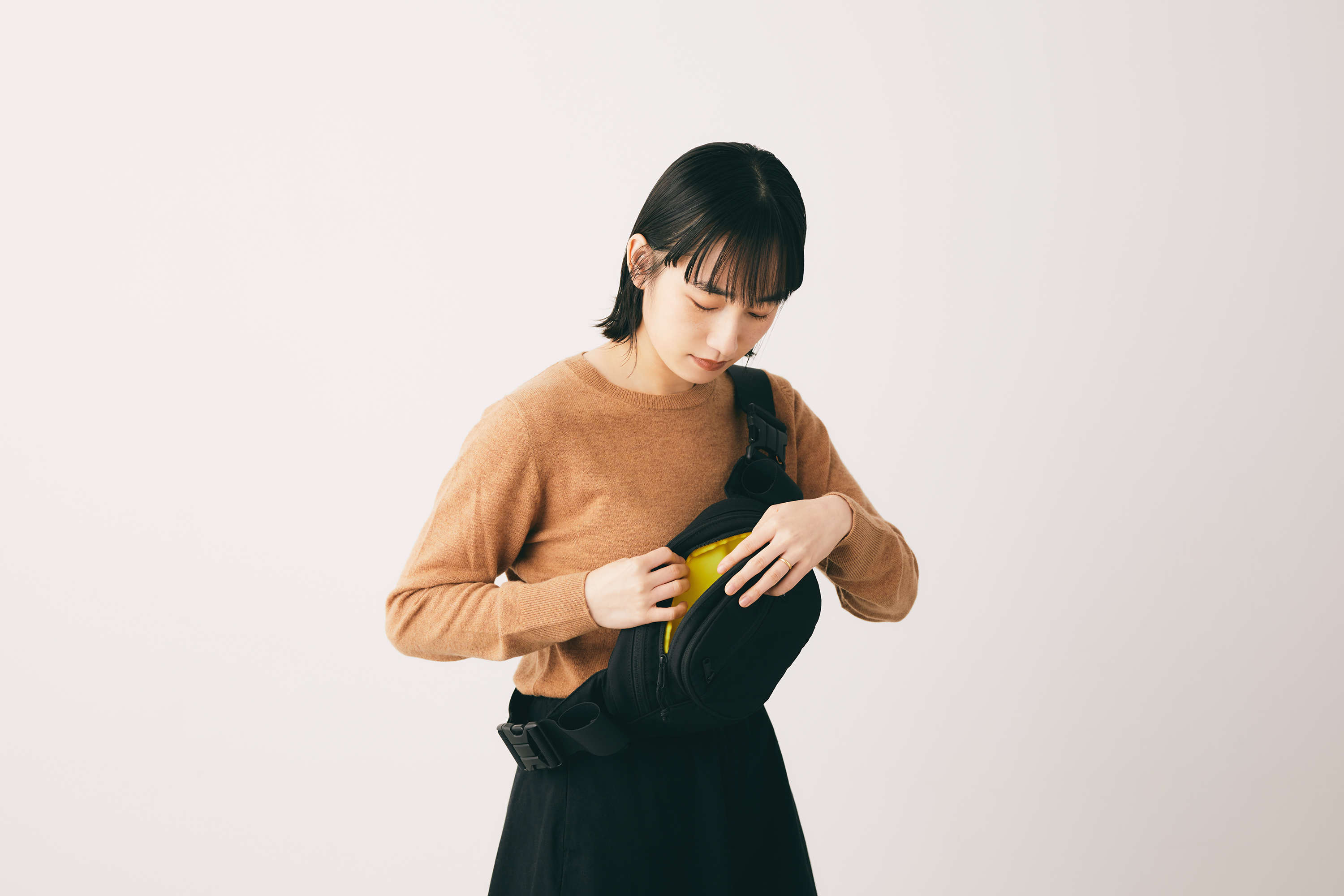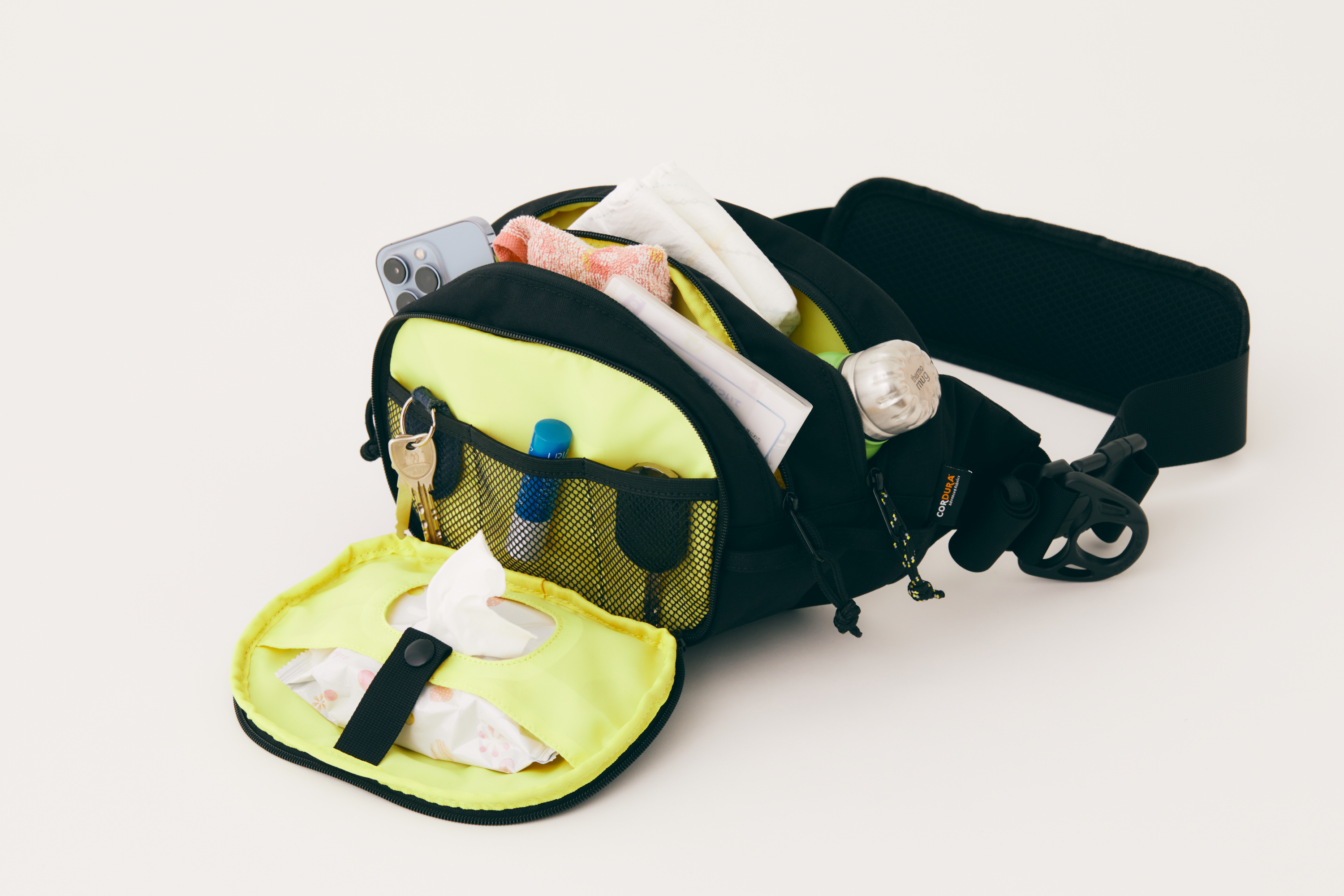 Surveyed 1,500 moms and dads on what they carry with them when they go out. Four pockets were designed to hold all the items needed for an outing. By making it a shoulder bag type, the burden on the hands and back when carrying it is reduced. It also allows you to organize your belongings so you don't have to carry another bag!