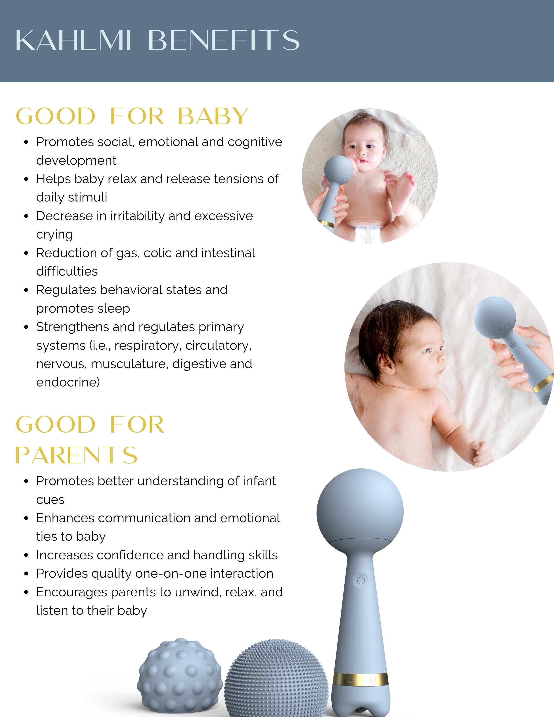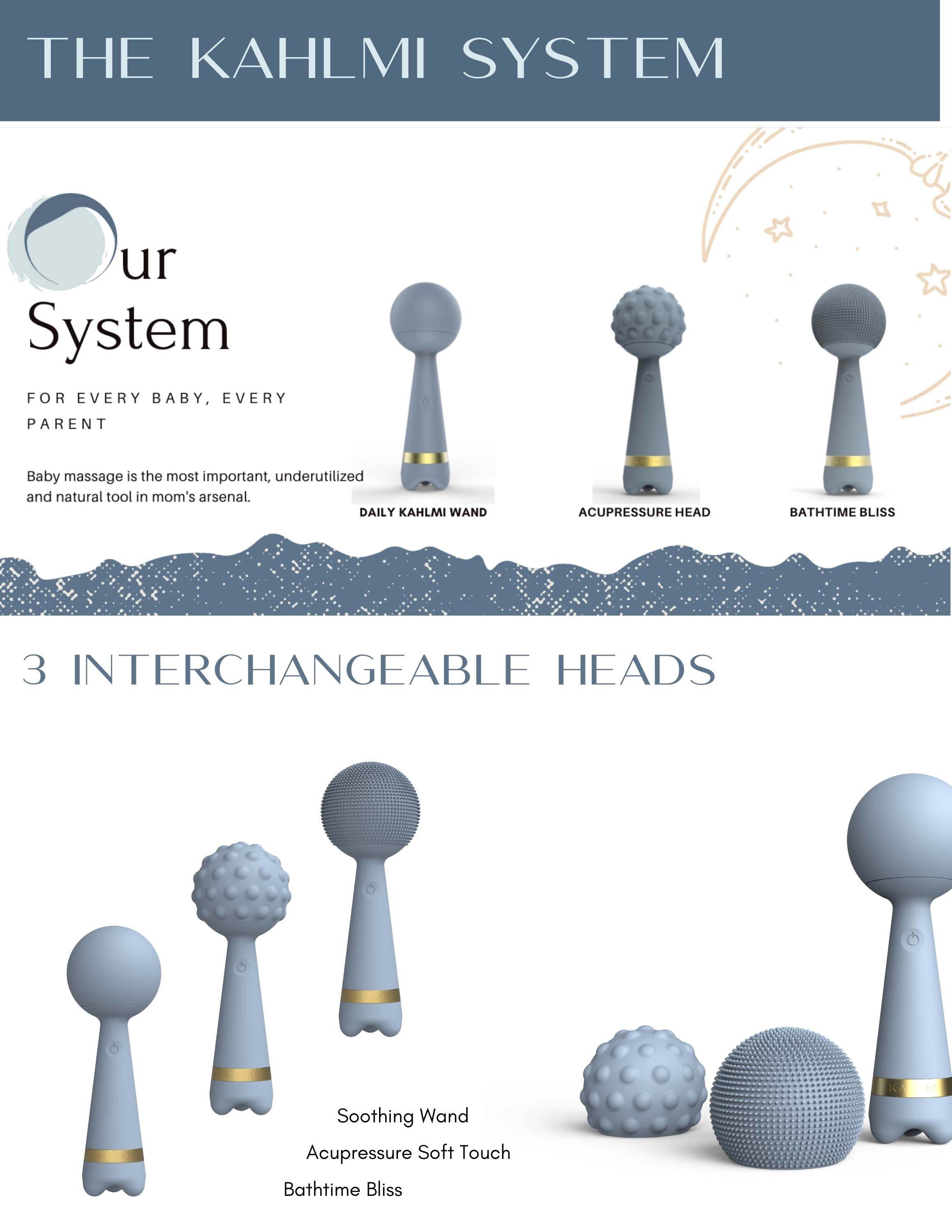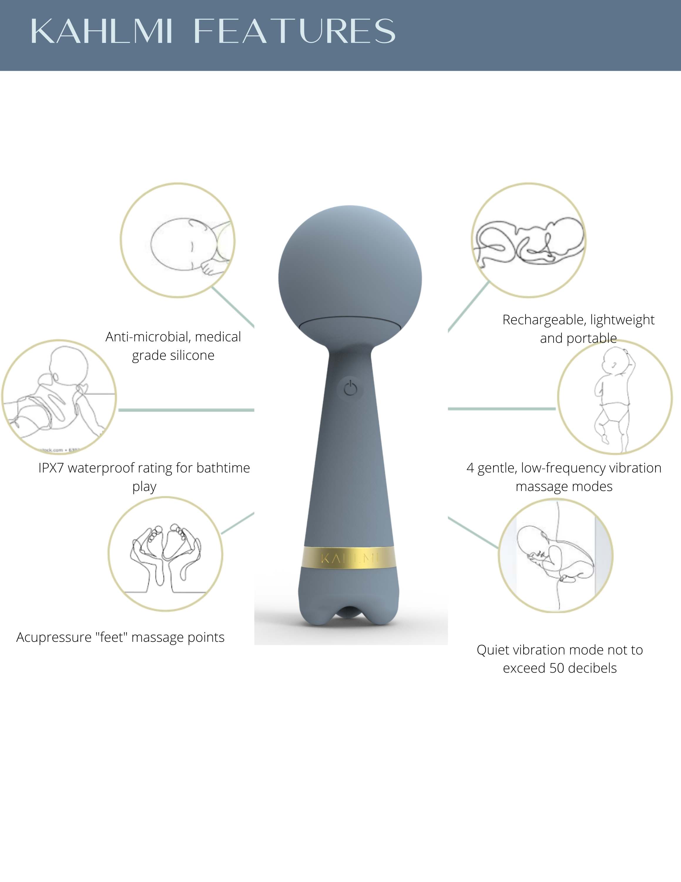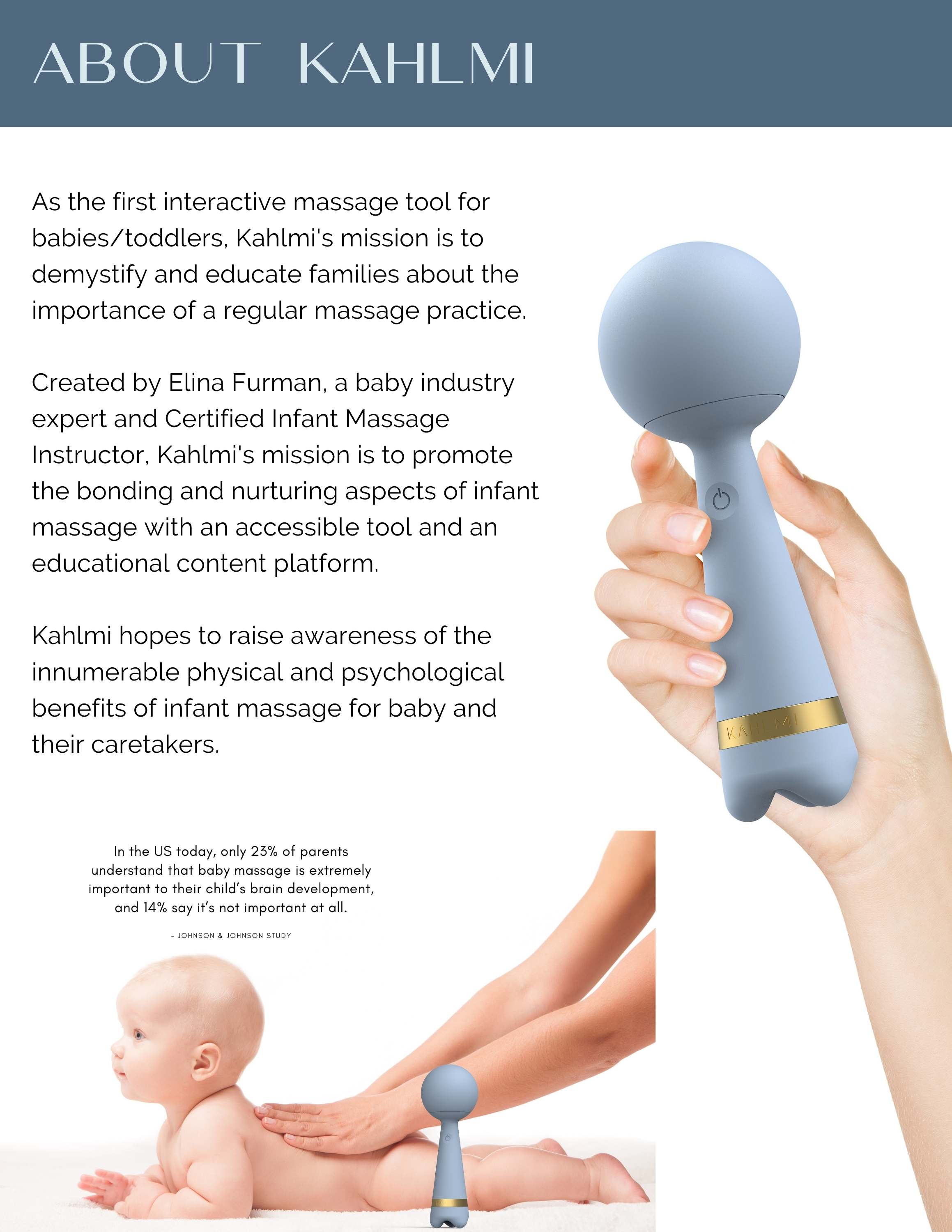 Kahlmi is the first interactive massage tool for babies/children. Baby massage is one of the most powerful and naturally therapeutic practices, dating back centuries to the Qing dynasty. Today, baby massage has come a long way but has yet to achieve mass adoption. By developing the first waterproof, low-vibrational massage tool, Kahlmi’s mission is to help more parents embrace the bonding and nurturing aspects of infant massage with an accessible tool and an educational content platform. Conceived to conform to baby’s smaller anatomical scale and inspired by Japanese Kokeshi dolls, the Kahlmi massage wand features anti-microbial, edible-grade silicone, water resistance, Acu-touch feet, and three interchangeable massage heads for a variety of sensory experiences.