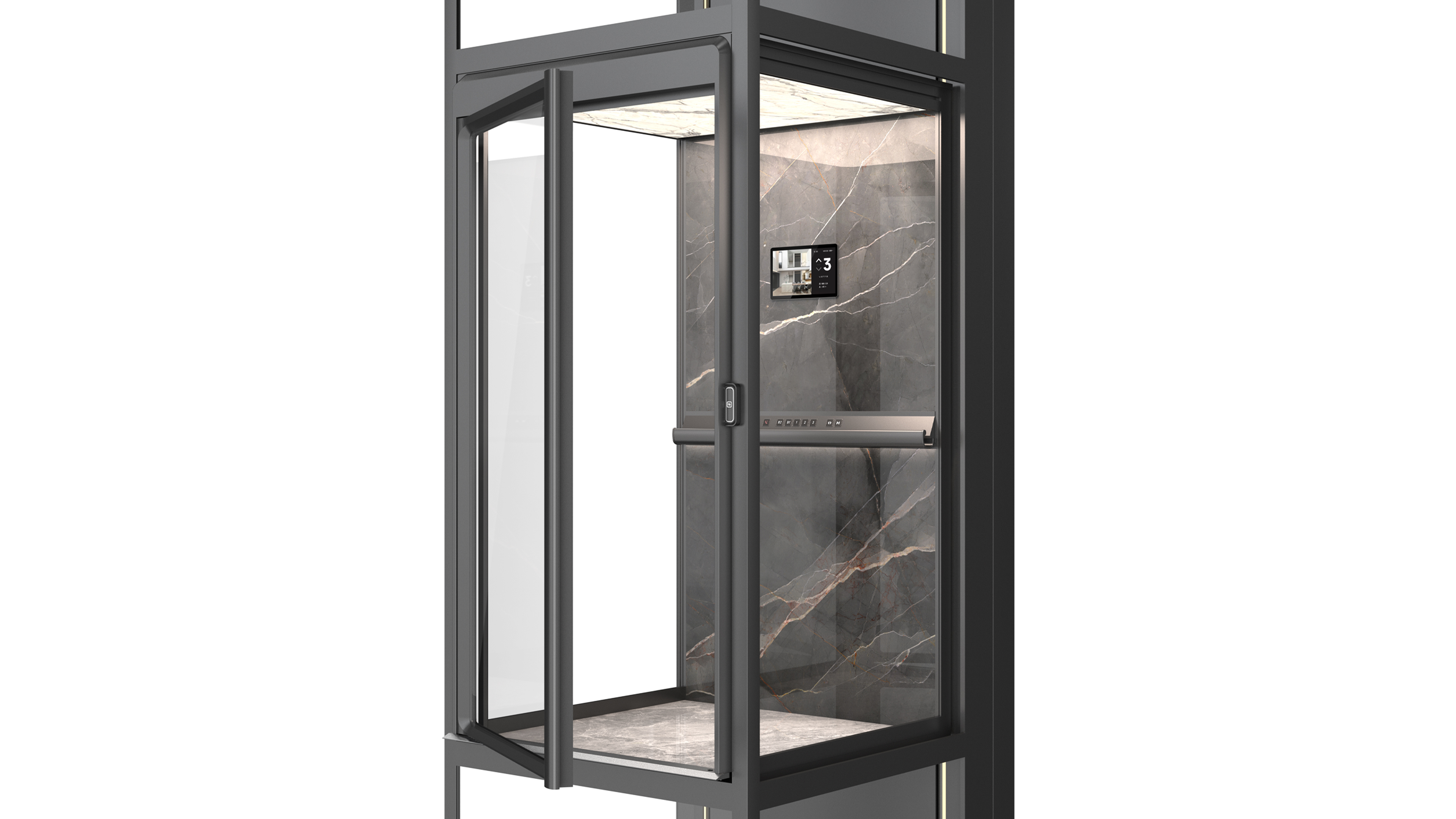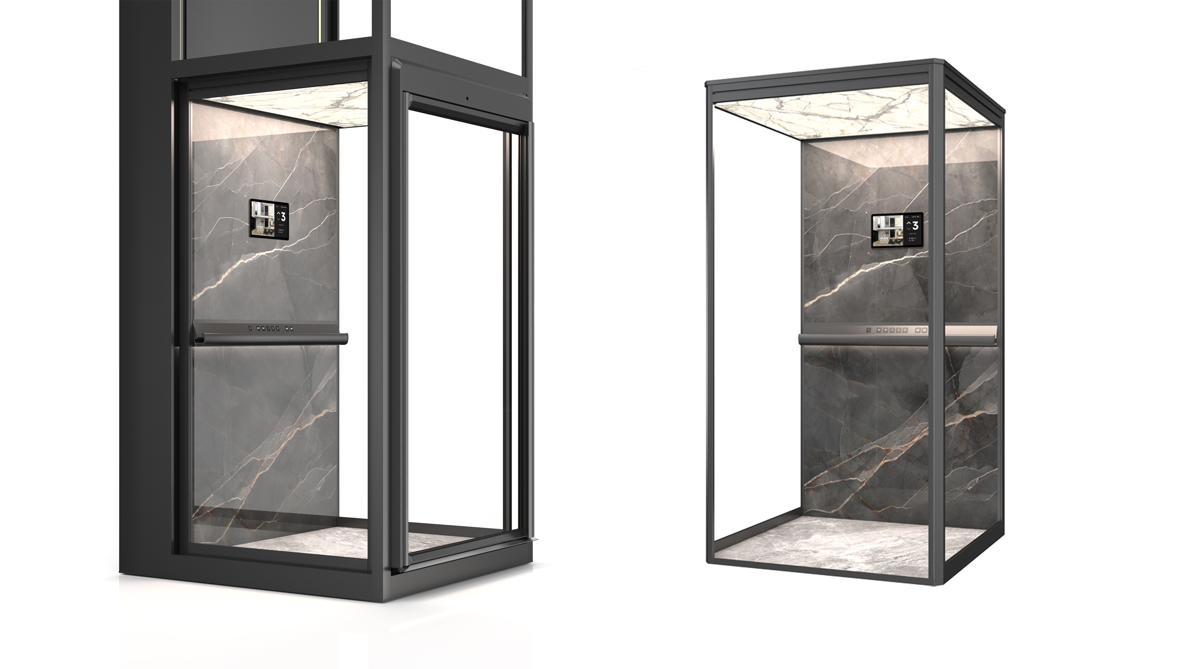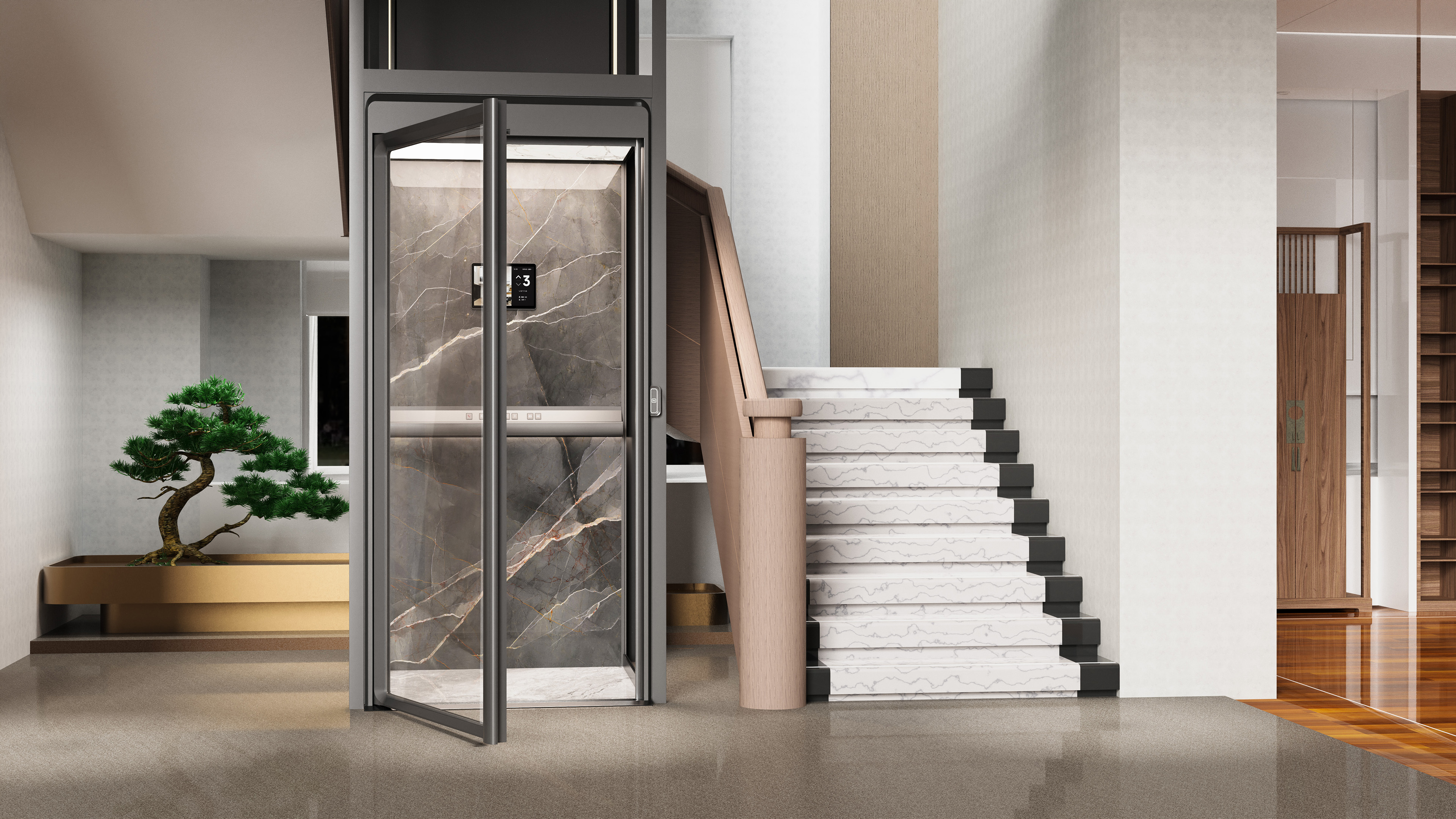 This elevator reinterprets the homelift with a new concept and perspective completely from the user's perspective, focusing on the practicality, functionality and aesthetics of the product. In order to perfectly integrate any modern high-end home environment, it uses the original narrow frame, transparent wall and hidden car frame without any visible running parts, bolts and cables inside the elevator shaft, so as to bring the unobstructed and ultimate visual experience of panoramic sightseeing on three sides. With high-end luxury stone, rock plate and other home decoration elements in the top and the back-wall of the car, together with scientific and technological lighting effects, it breaks through the cold industrial style, creating an exquisite, comfortable and luxurious visual effect.