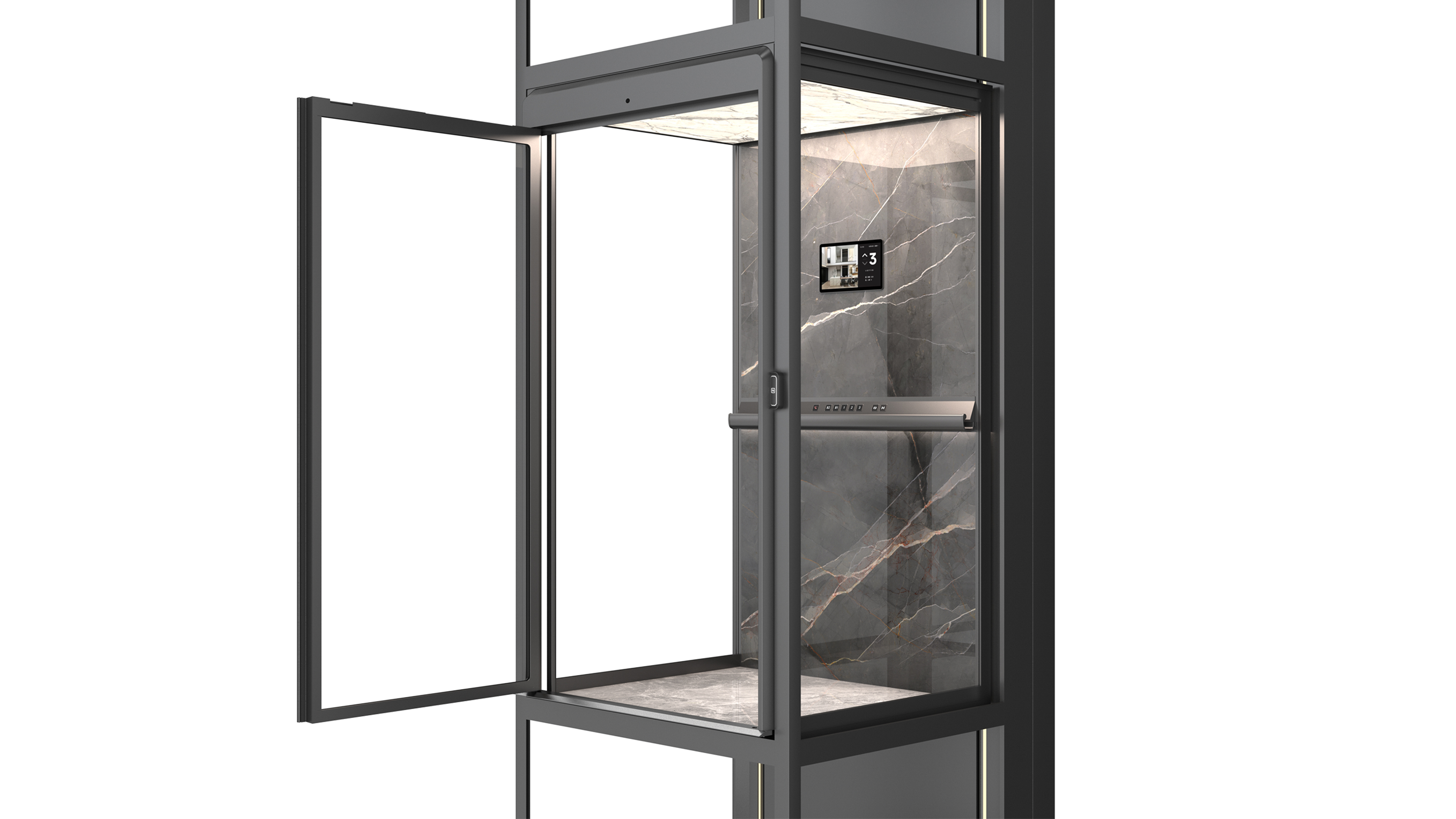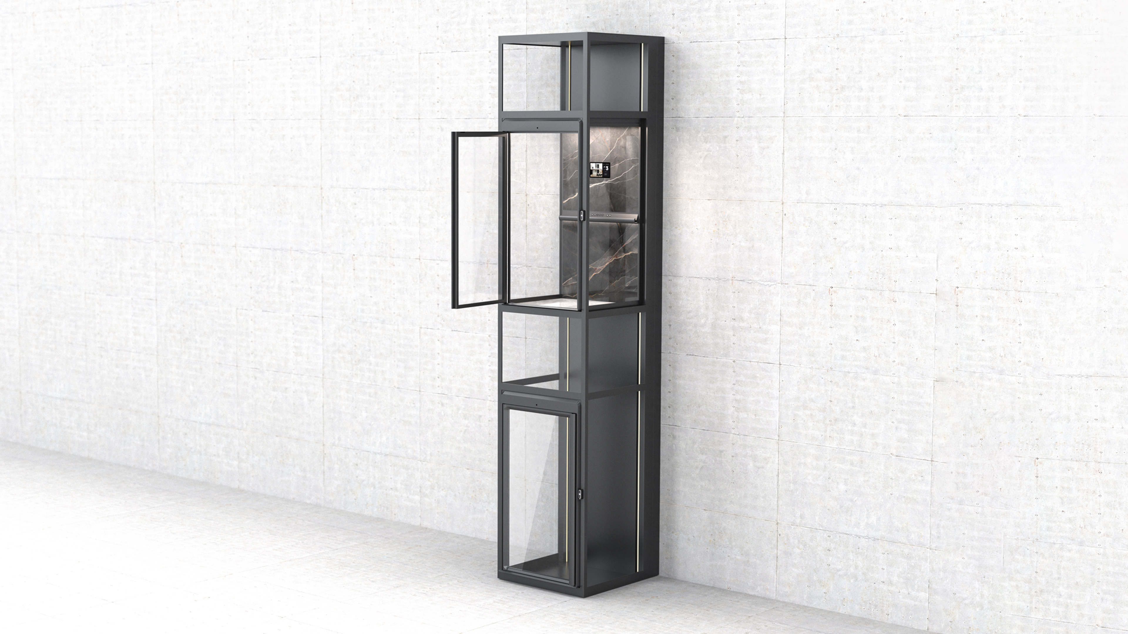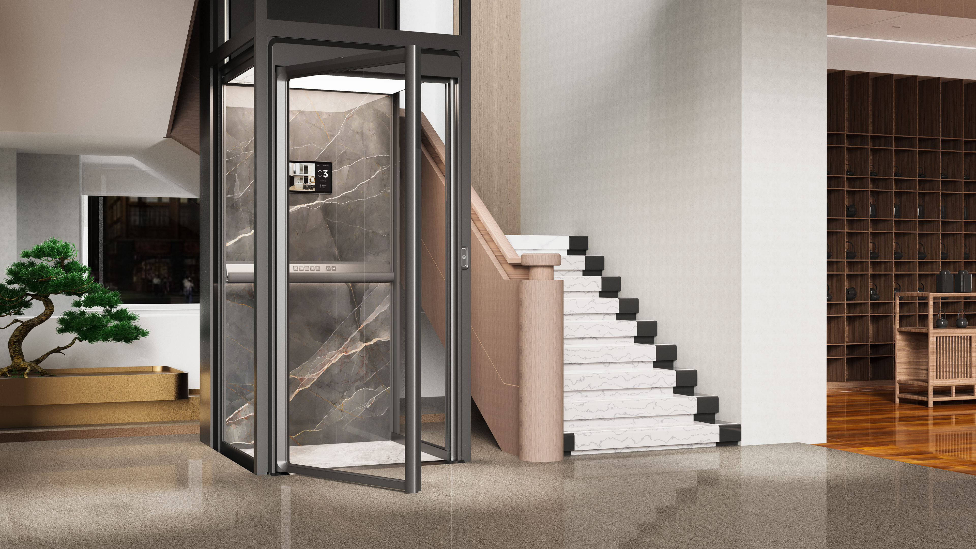 This elevator reinterprets the homelift with a new concept and perspective completely from the user's perspective, focusing on the practicality, functionality and aesthetics of the product. In order to perfectly integrate any modern high-end home environment, it uses the original narrow frame, transparent wall and hidden car frame without any visible running parts, bolts and cables inside the elevator shaft, so as to bring the unobstructed and ultimate visual experience of panoramic sightseeing on three sides. With high-end luxury stone, rock plate and other home decoration elements in the top and the back-wall of the car, together with scientific and technological lighting effects, it breaks through the cold industrial style, creating an exquisite, comfortable and luxurious visual effect.