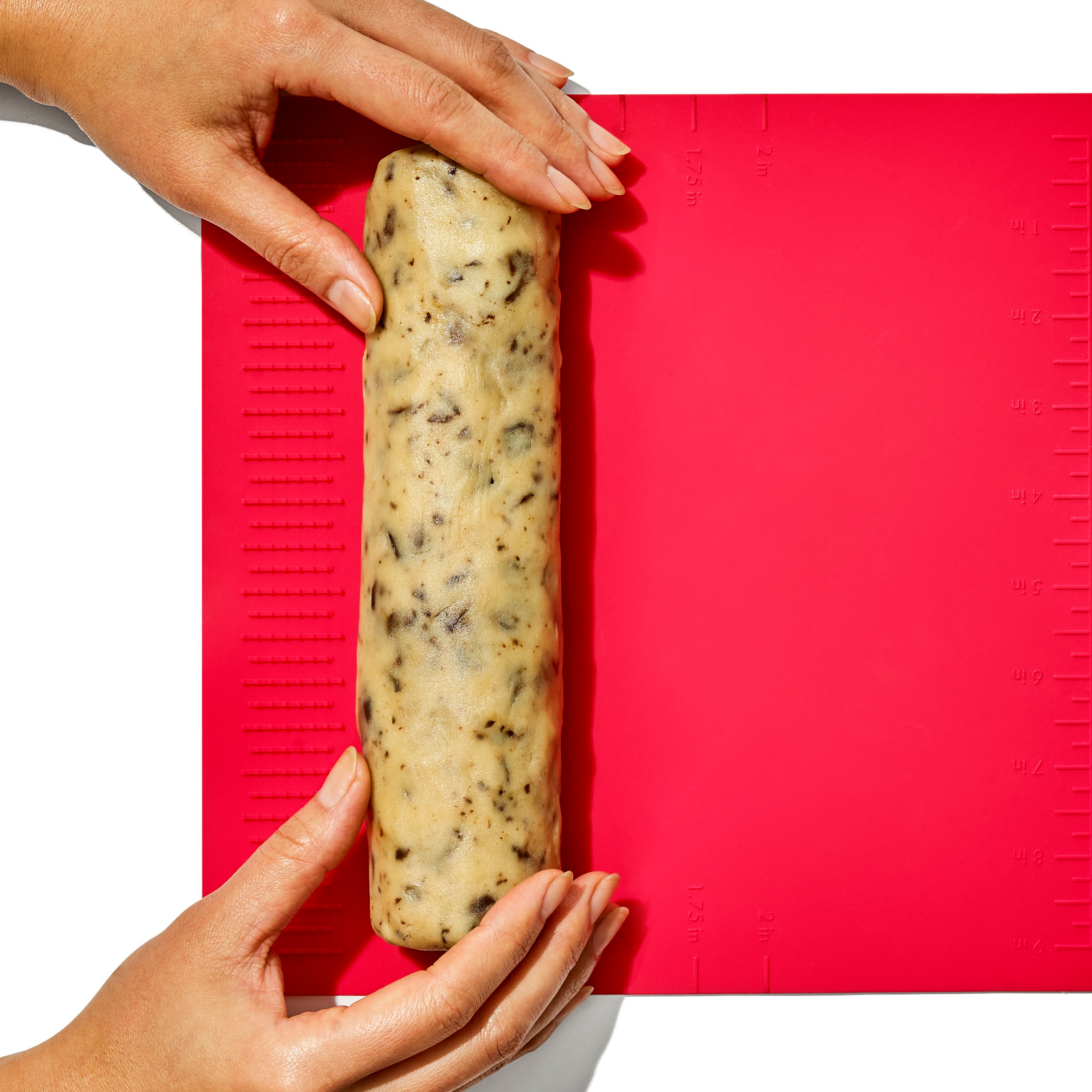 At the heart of the OXO Good Grips Slice and Bake Cookie Maker's design is its unparalleled innovation. The product features a unique and intuitive design that streamlines the cookie-making process, eliminating the hassle of single use plastic wraps and parchment papers that are messy and cumbersome, and uneven cookies. Through embedded measurement markings on the side of the mat and end caps to compress and seal the dough, user’s are able to form, chill, and bake cookies with ease. The user-friendly design incorporates precision-engineered components that ensure consistent results every time.