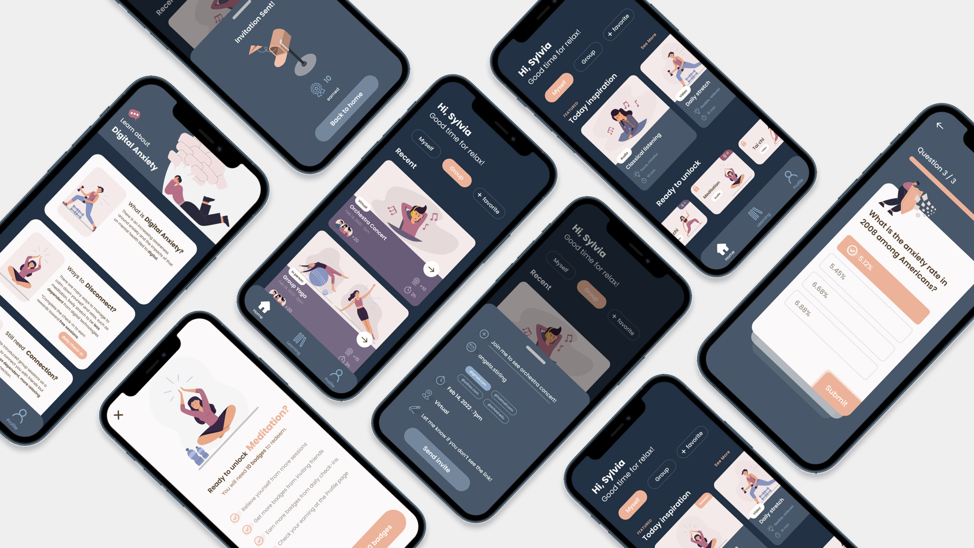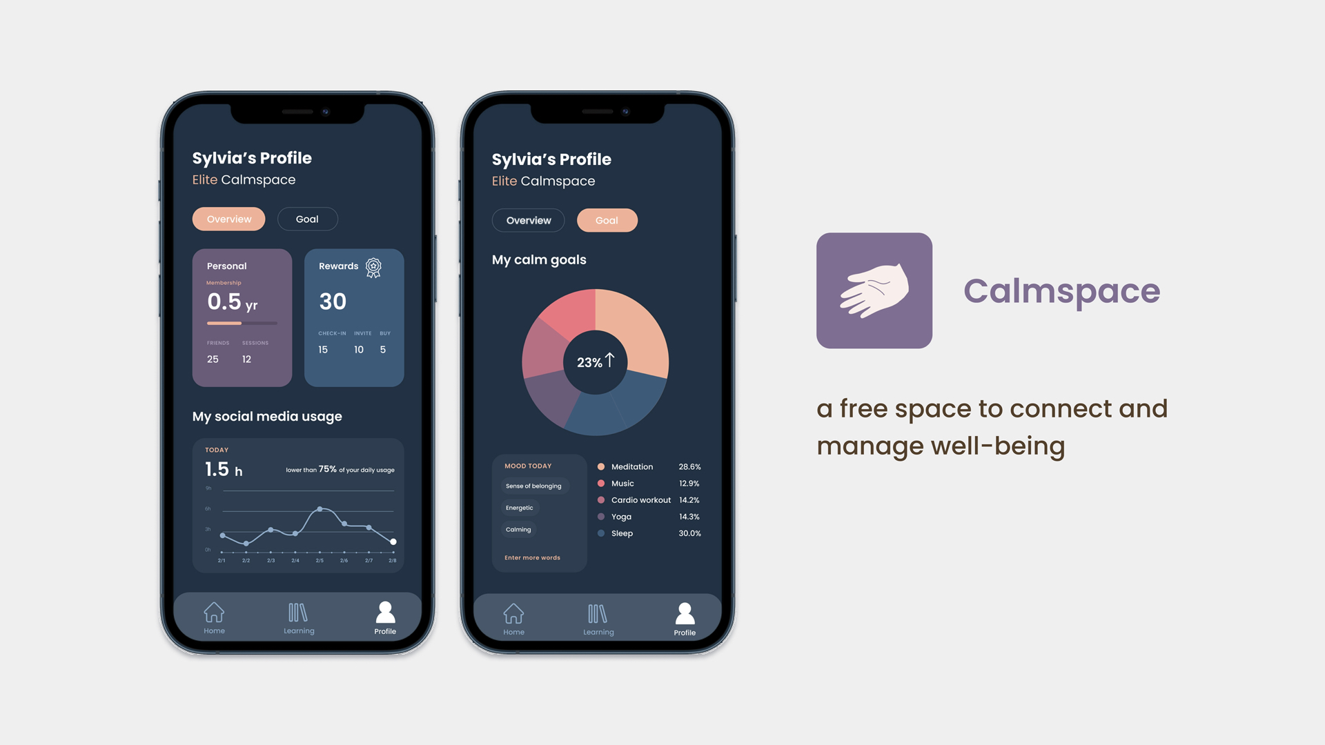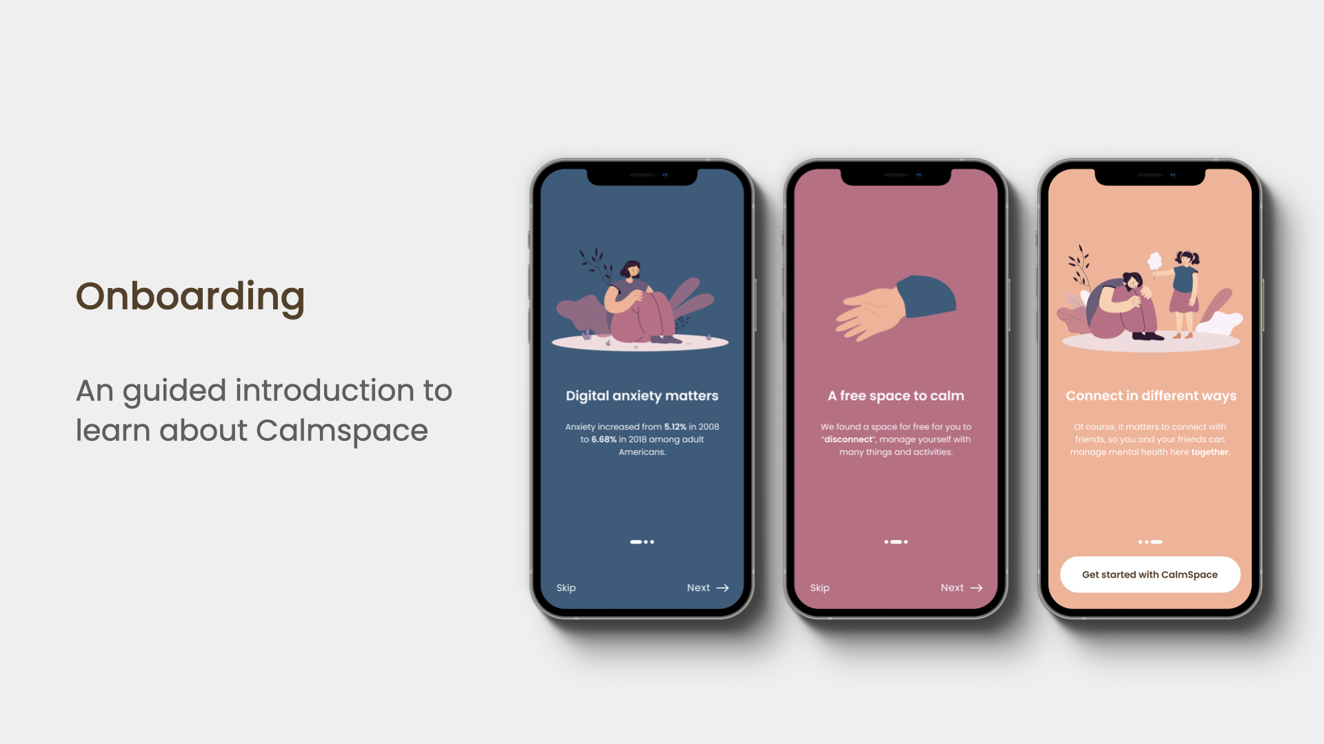 How can we raise awareness of young adults' anxiety through digital tech, addressing their "always connected" concerns for well-being? Calmspace seeks a mental balance for whom in need of having personal spaces while still desiring social connections. It aims to design an intuitive, accessible experience to raise people's awareness of mental well-being. The design includes features where people can take self-focused sessions individually, while being able to join group sessions to maintain connections, and it adopts colors that evoke a sense of care and stress-free, and builds with a freemium model for free and a reward program for motivations.