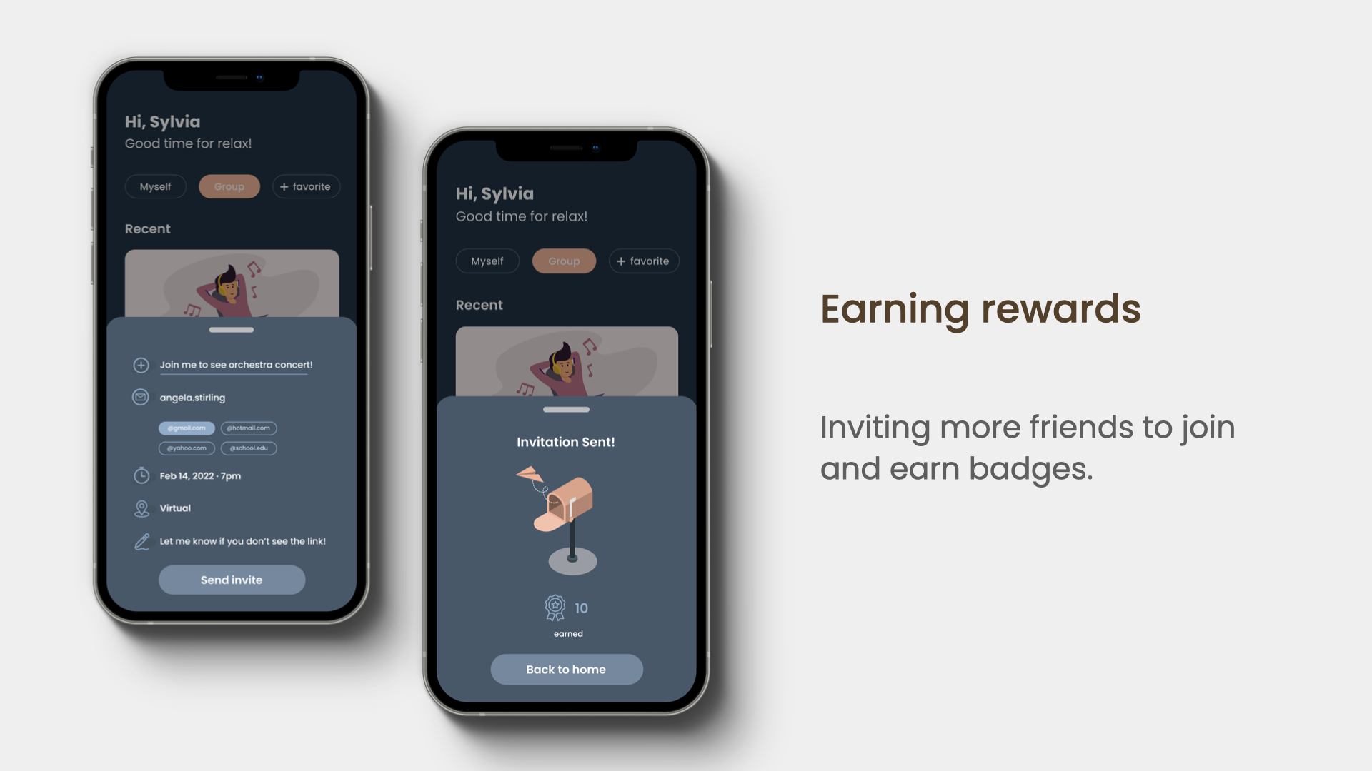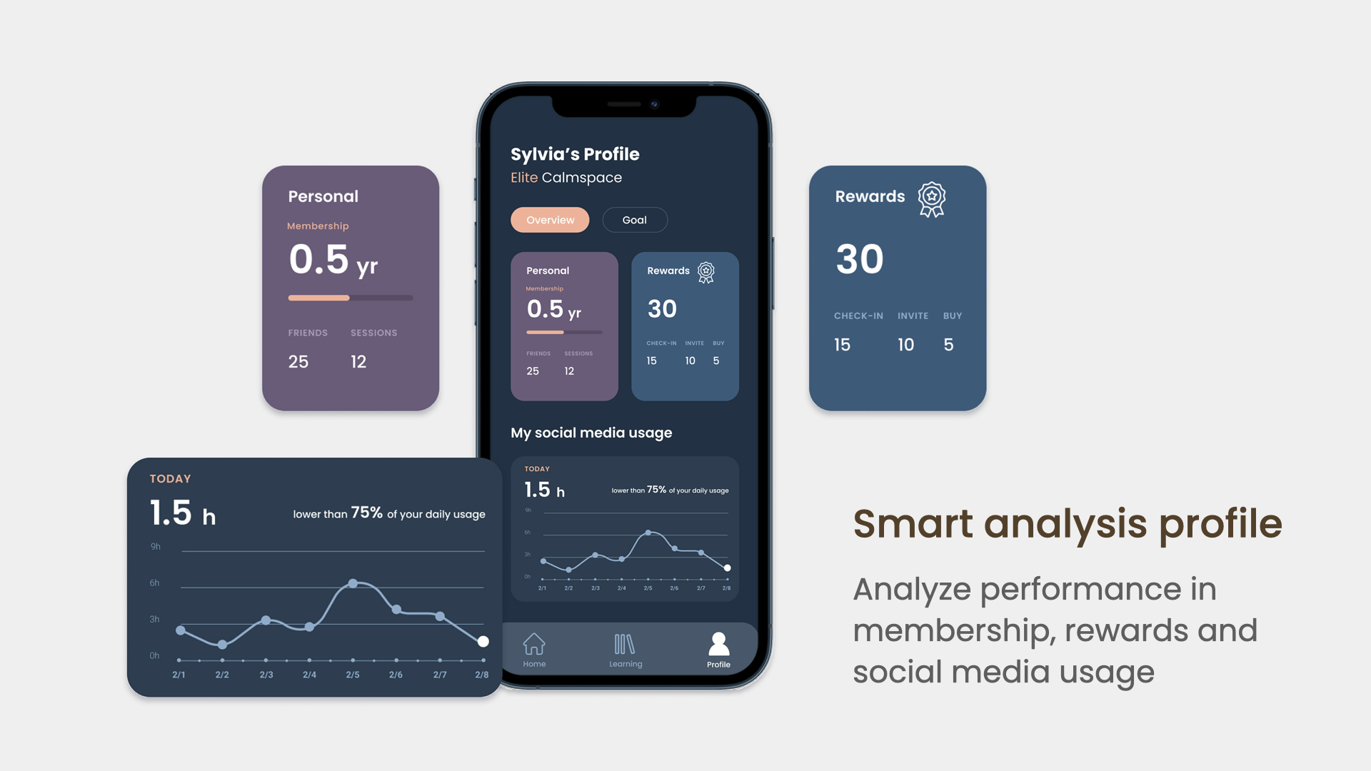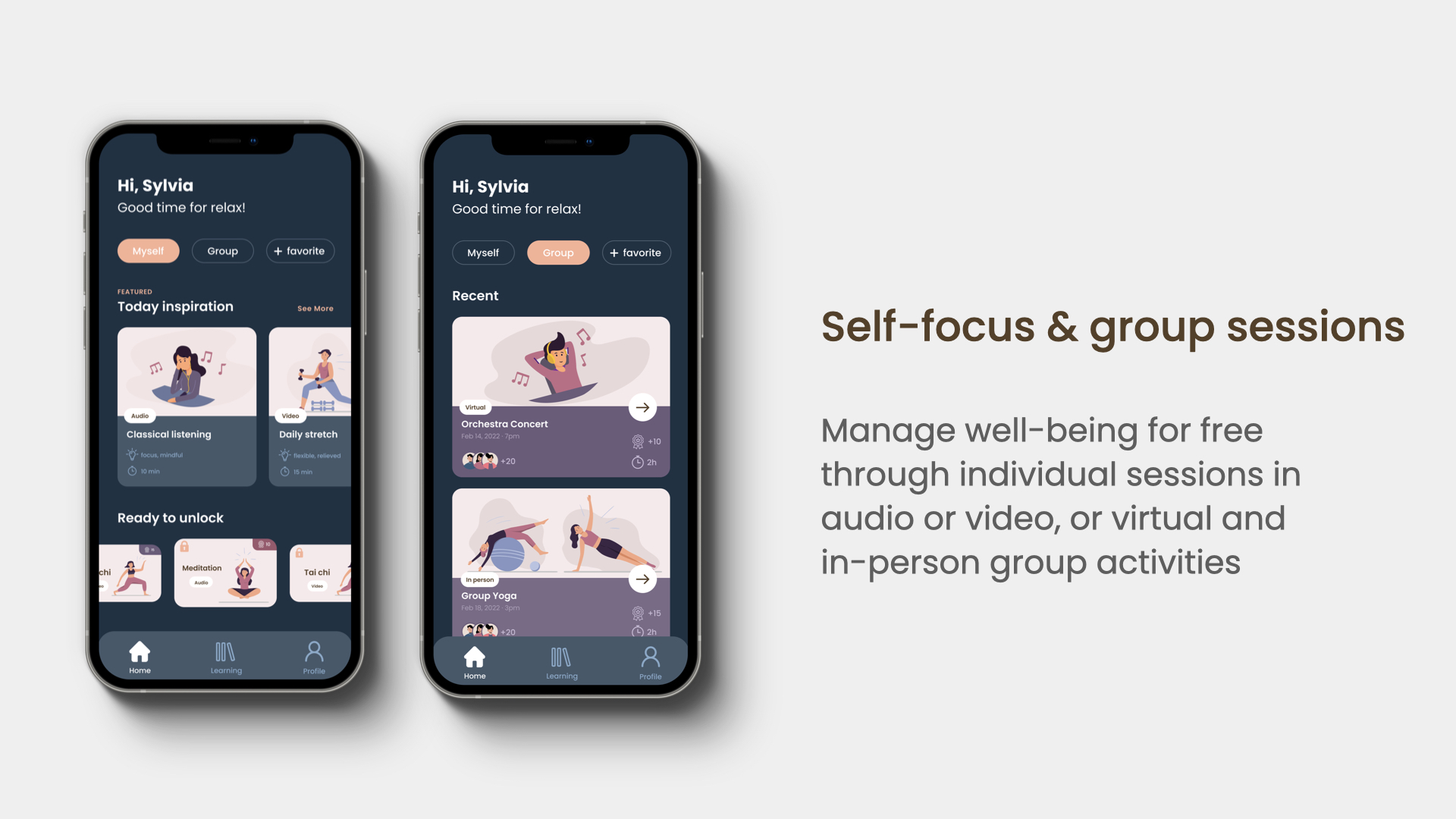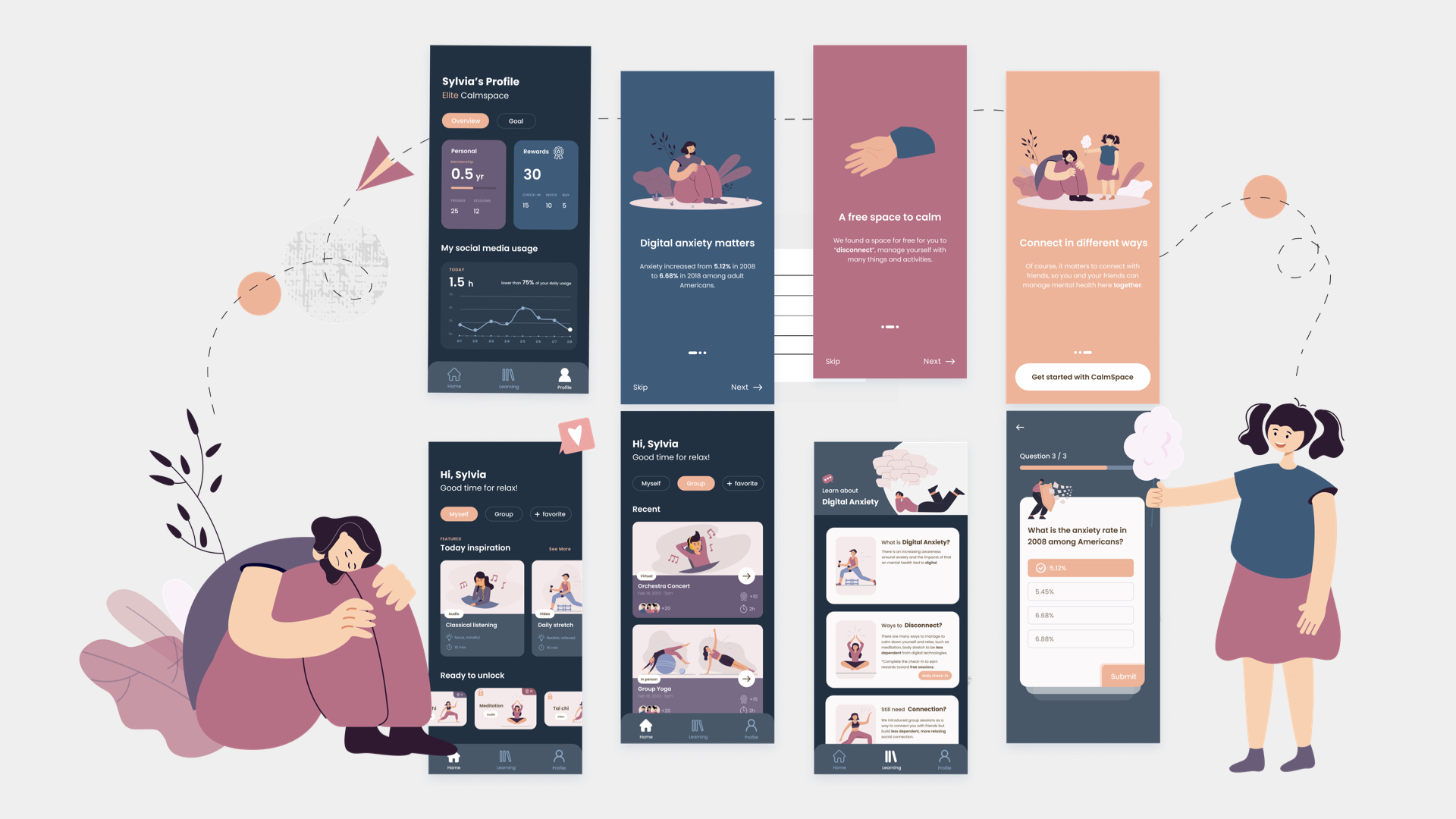 First-time user begins with three-step onboarding where Calmspace offers a guided introduction, and they land on the homepage that shows the individual activities. This is the entry point of the experience that brings people the choices of managing mental well-being through self-care or group activities. In the meantime, people are able to learn about digital anxiety topics through the Learning page, and track their performance in the Profile dashboard. Calmspace aims to bridge the dilemma between self-care and social connections, and break down the barriers of budget, location by making users at home.