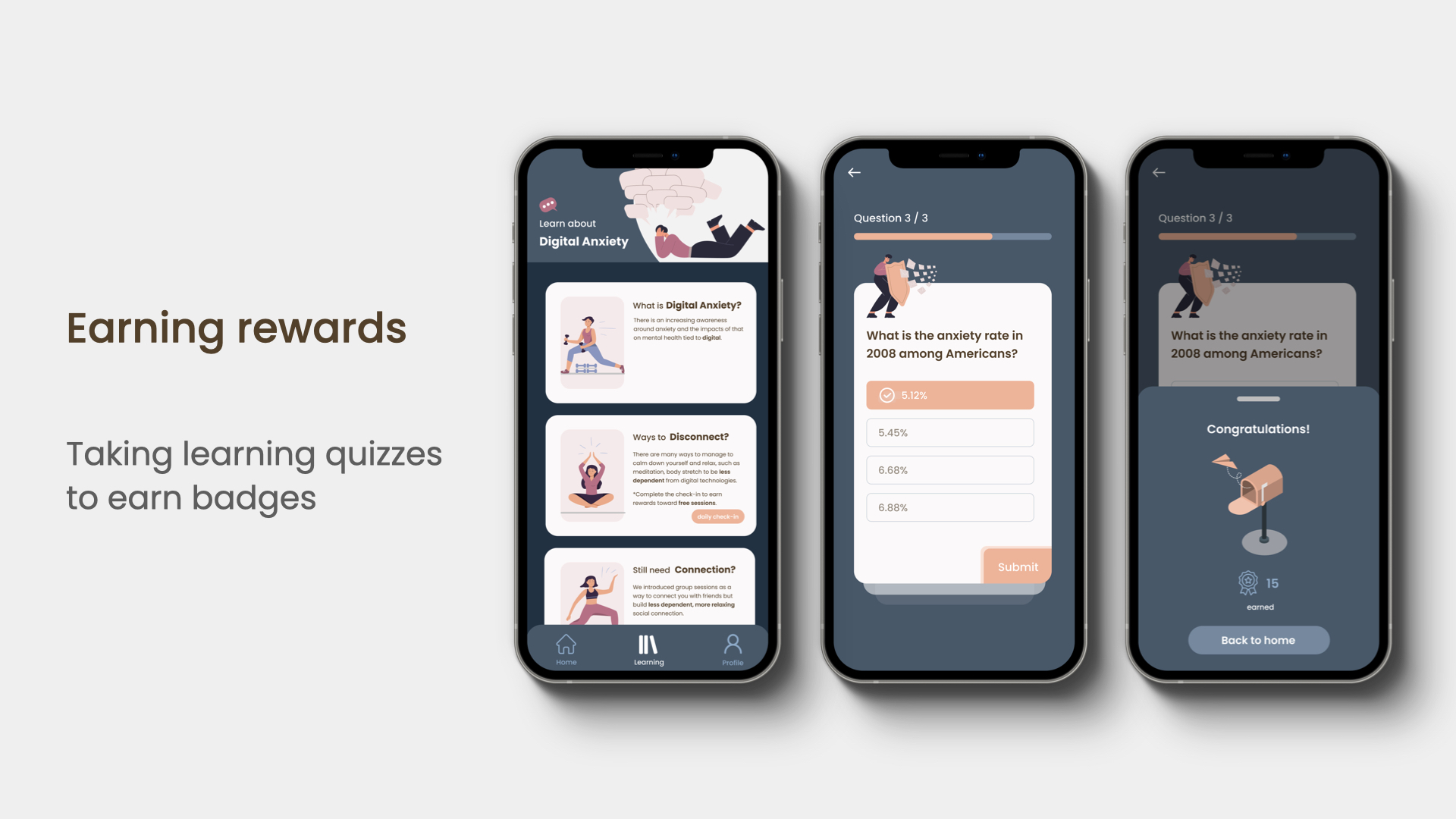Calmspace, a mobile design addressing technology-induced anxiety in young adults who are at school or working in professional industries, employs a freemium model, providing free well-being features for self-focused and group activities. The innovative reward program encourages users to learn about digital anxiety, earn credits through quizzes and inviting friends for free sessions, and track well-being performance in the profile dashboard. Calmspace aims to enhance happiness, and natural, proactive interaction for a healthier digital lifestyle.