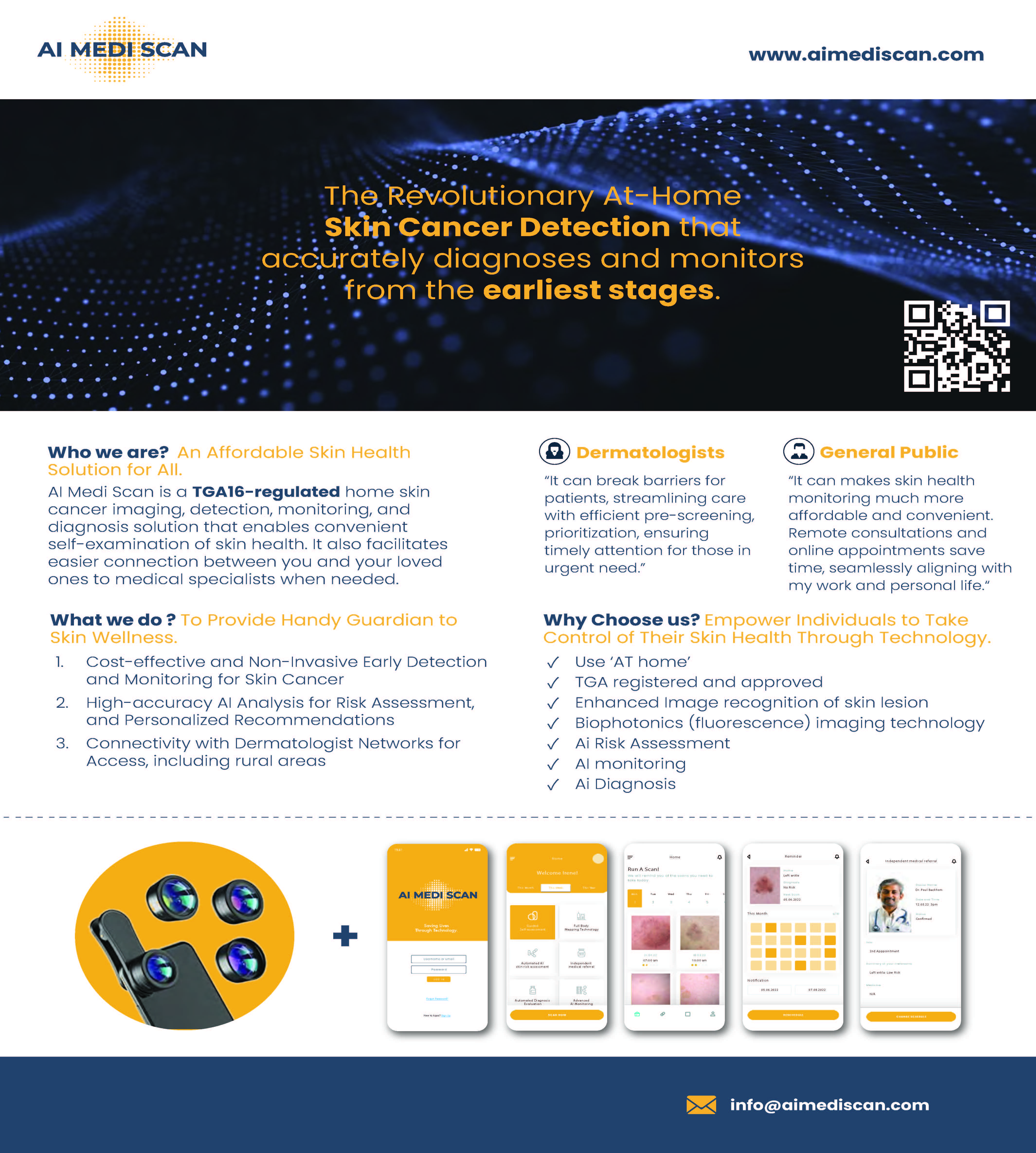 AI MEDI SCAN is a healthtech start-up on a mission to deliver accurate, affordable, at-home skin cancer detection via a combination of cutting-edge technologies. Using a smartphone camera and mobile app, in combination with AI and a blockchain-enabled health records platform, AI MEDI SCAN is set to transform skin cancer care in Australia.