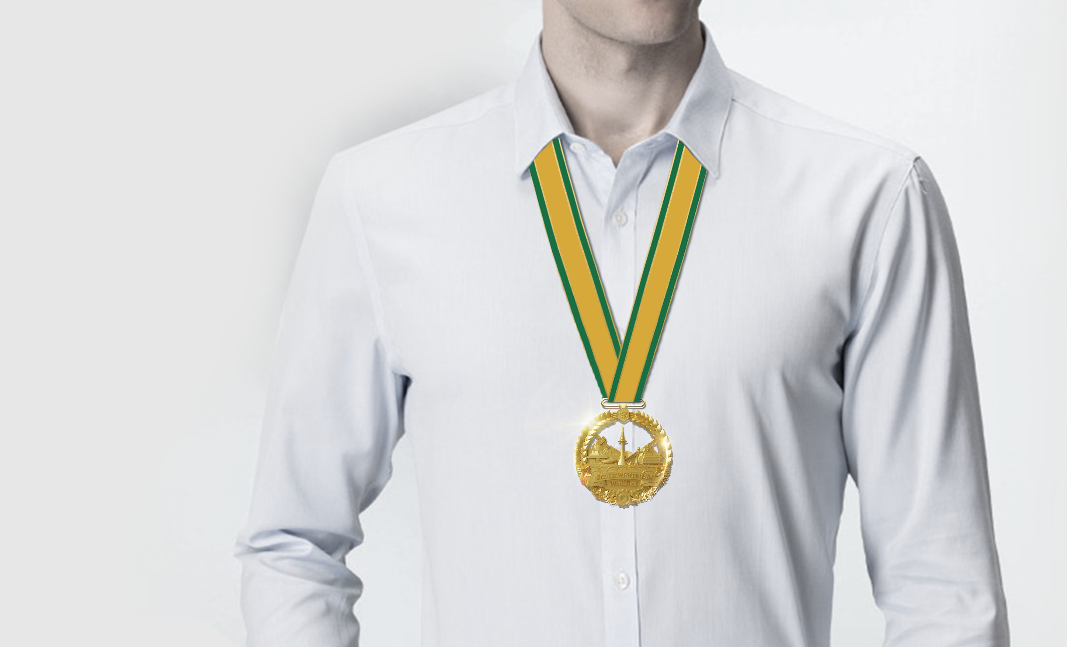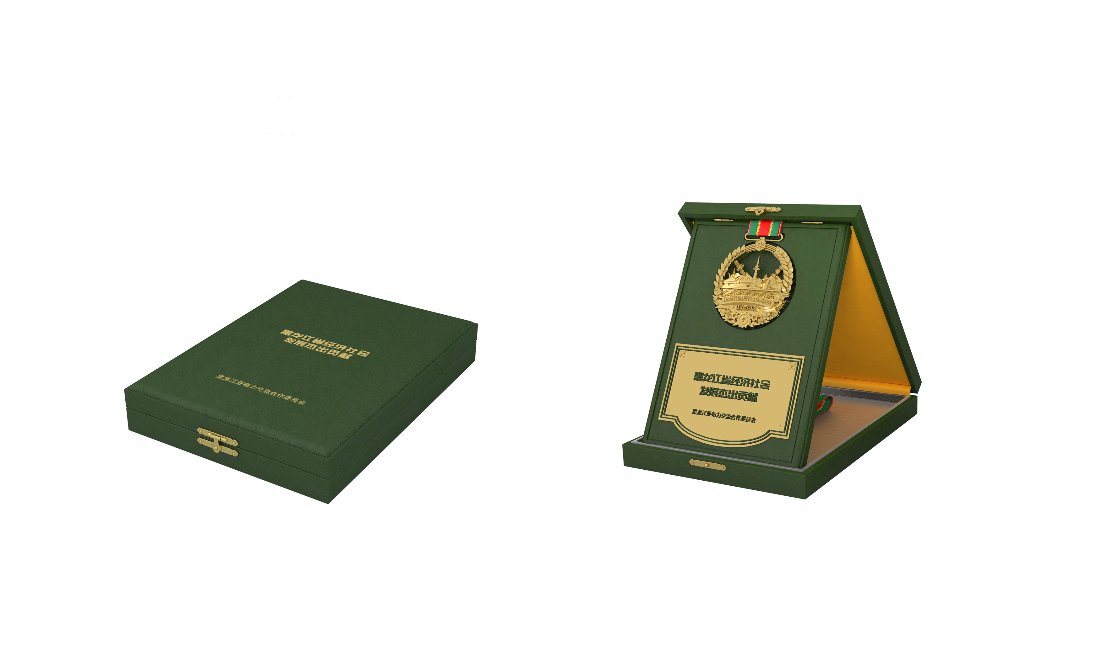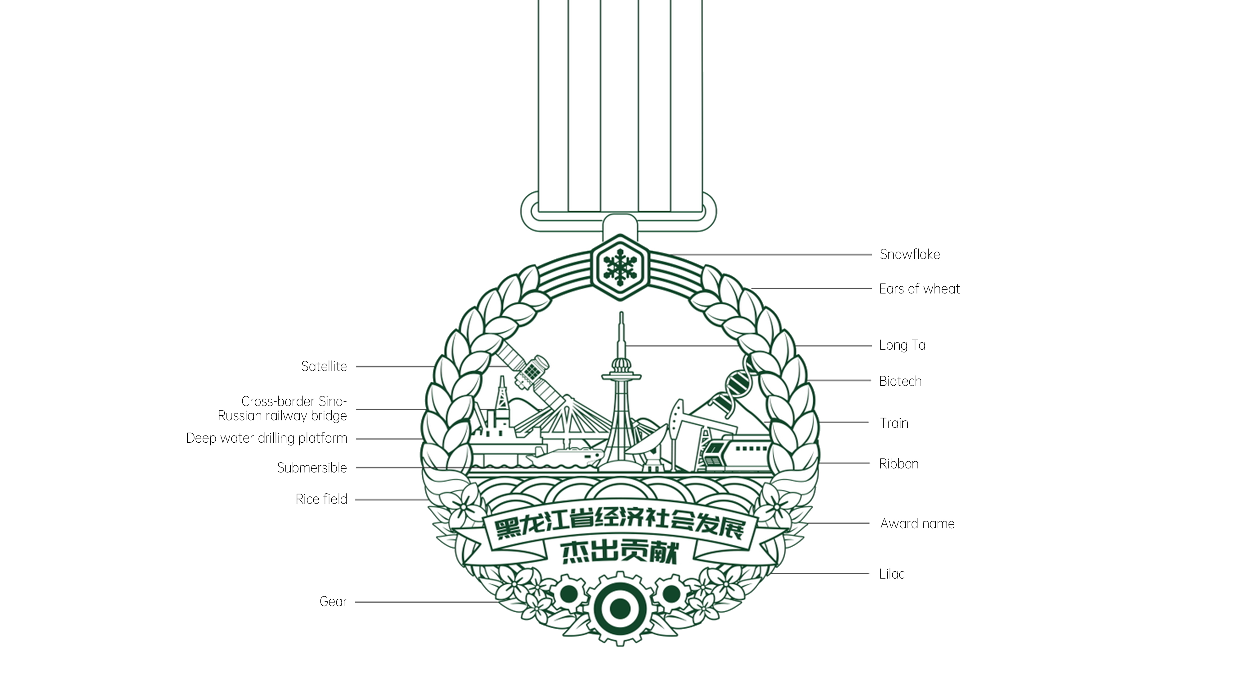 The medal design is simple and elegant, boasting strong artistic appeal and practicality. It revolves around modern scientific and technological industries and iconic landmarks of the Heilongjiang Province, complemented by lilacs and colored ribbons on both sides and rice fields afar, vividly portraying the profile of the Heilongjiang Province. The medal has undergone a gilding process for durability and prolonged preservation. The ribbons take a gold and green color palette, representing honor and achievement. These elements endow visual appeal with the medal design and pay homage to the local culture and tradition. They convey the profound connotations of receiving the honor of Outstanding Contribution to the Socio-Economic Development of Heilongjiang Province.
