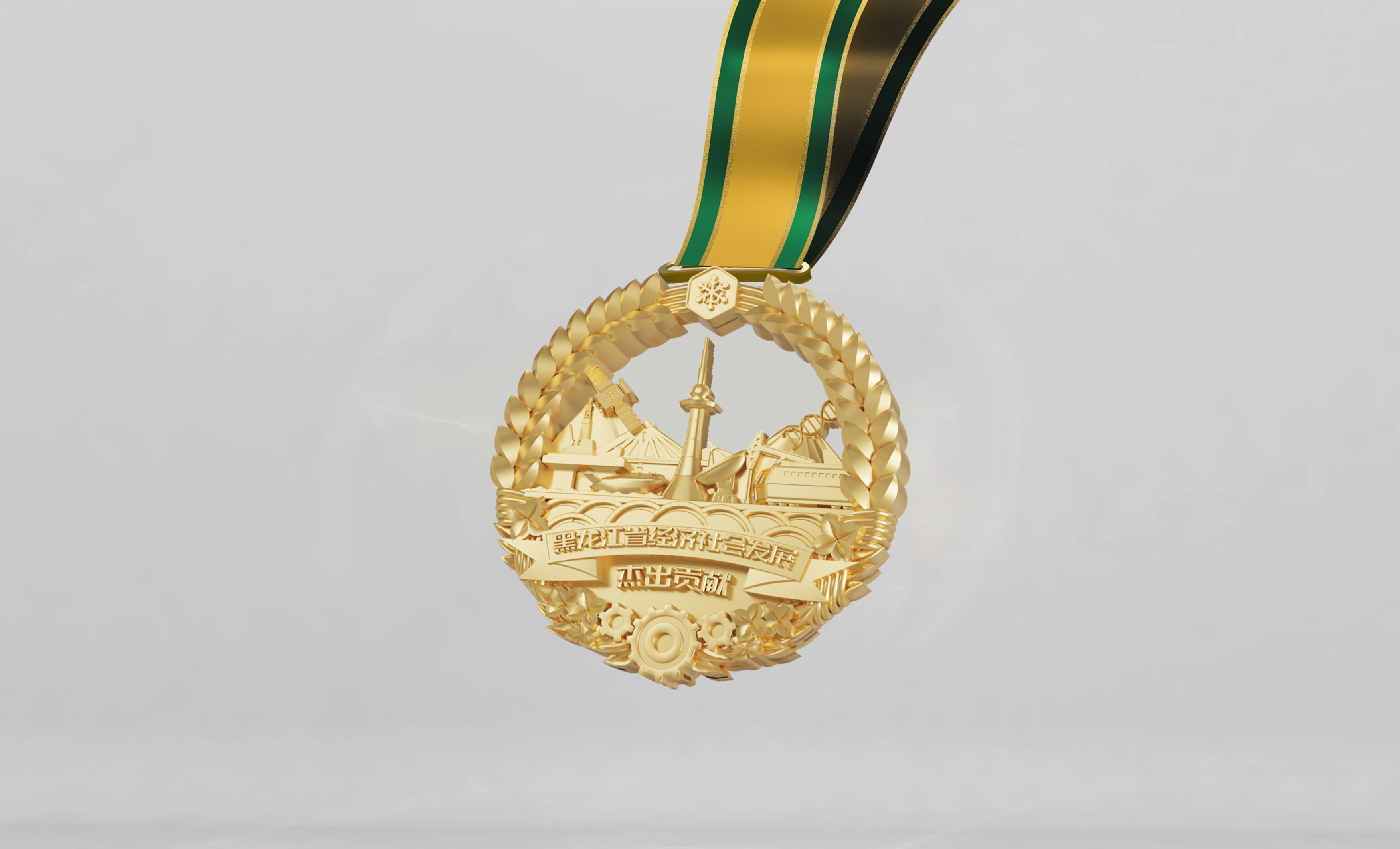 Inspired by the "Economic Log of Heilongjiang Province", the Outstanding Contribution to the Socio-Economic Development of Heilongjiang Province Medal Design is a perfect manifestation of blending the modern scientific and technological industries of the Heilongjiang Province with iconic landmarks, showing the robust modern economic industries and spectacular views of the Heilongjiang Province. The medal design uses a hollow shape and cleverly integrates multiple elements to demonstrate the unique culture and economic strength of the Heilongjiang Province.