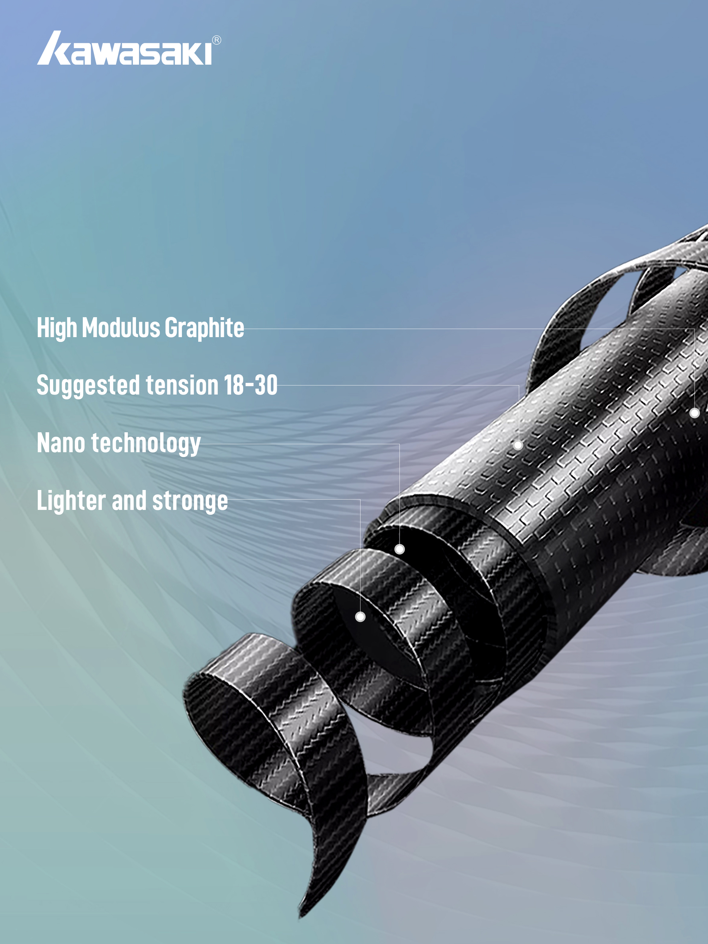 The racket frame and shaft utilize Mitsubishi high modulus graphite to secure overall rigidity and elasticity while keeping lightweight, enabling the racket to bear a maximum tension of 30 pounds without being deformed. The frame features an aerofoil-like structure, which can reduce air resistance to enhance the swing speed. The head adopts an accurate counterweight system for the even distribution of carbon fiber, thus helping improve the explosive hitting power.