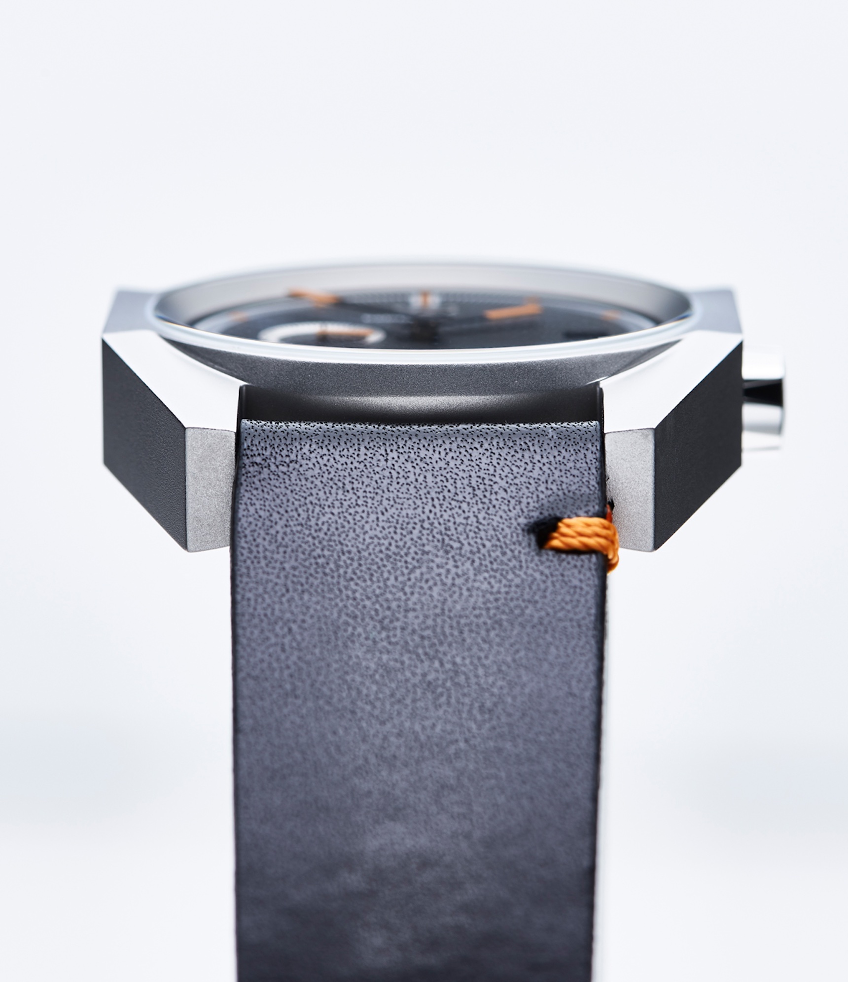 The case is based on classic watch design and is shaped using complex faceting with clear lines to create a unique character. The shapes seems to be cut from a block, curves are reduced to a minimum: the watches appear almost brutal at first glance. Thanks to playing with known basic types, the design is shedding new light on the familiar.