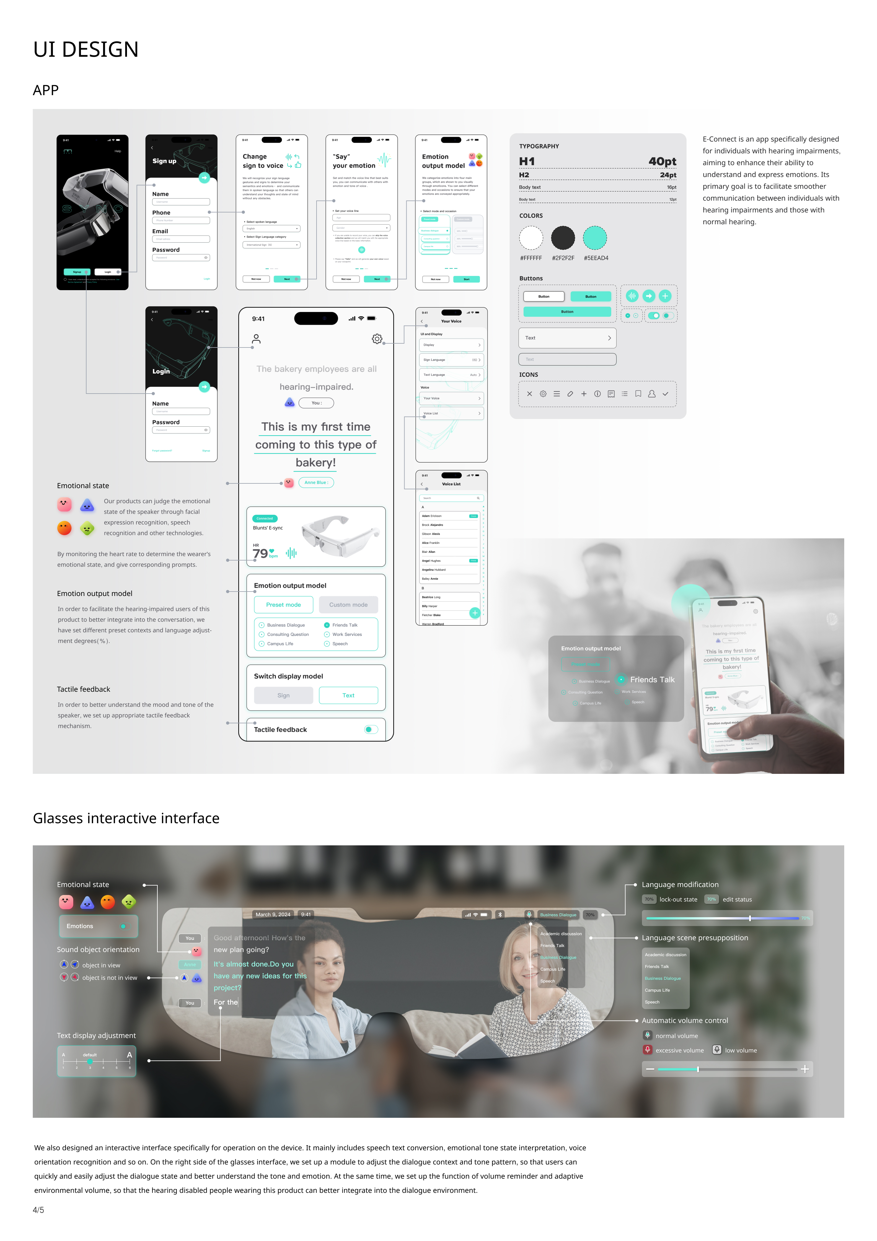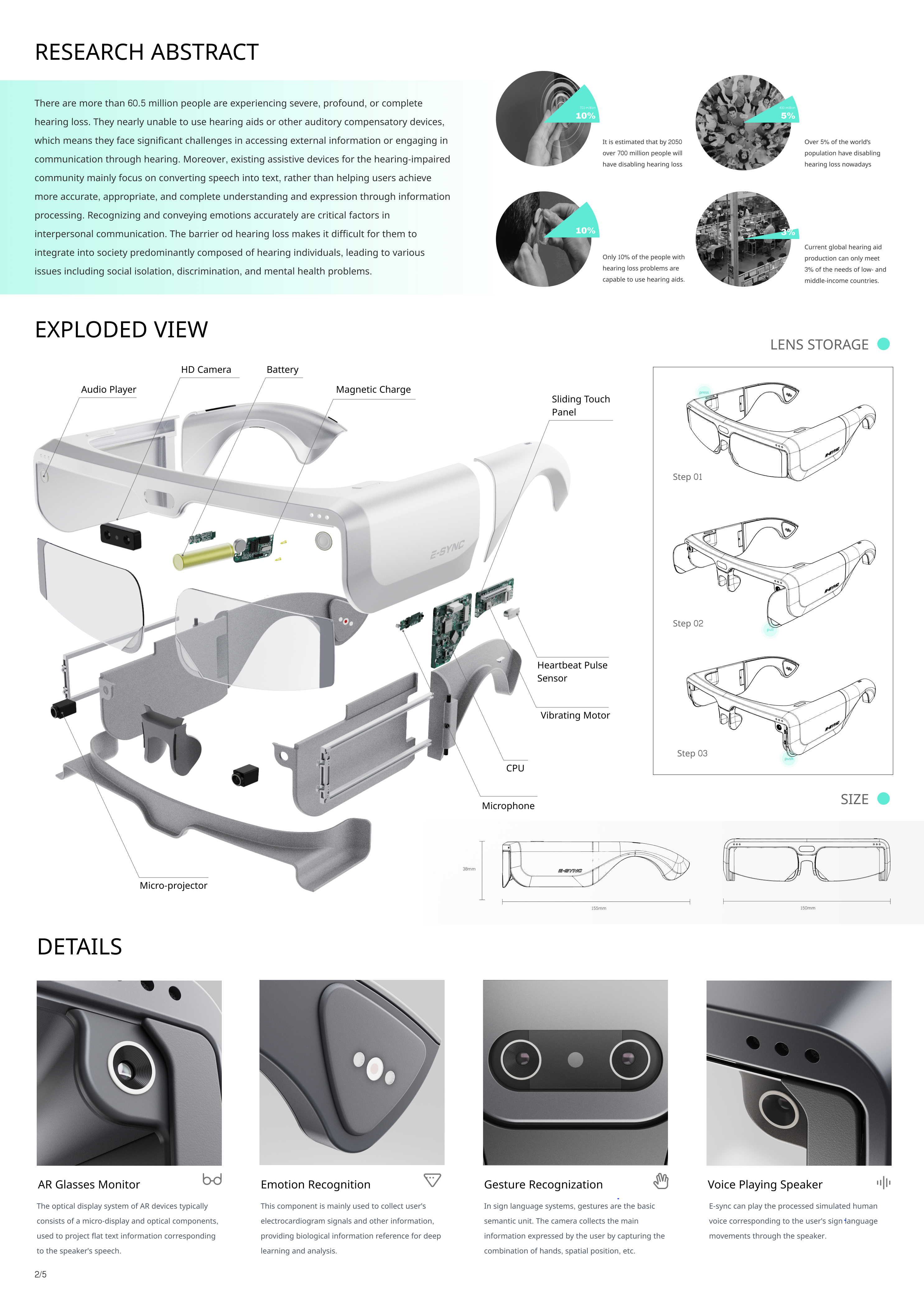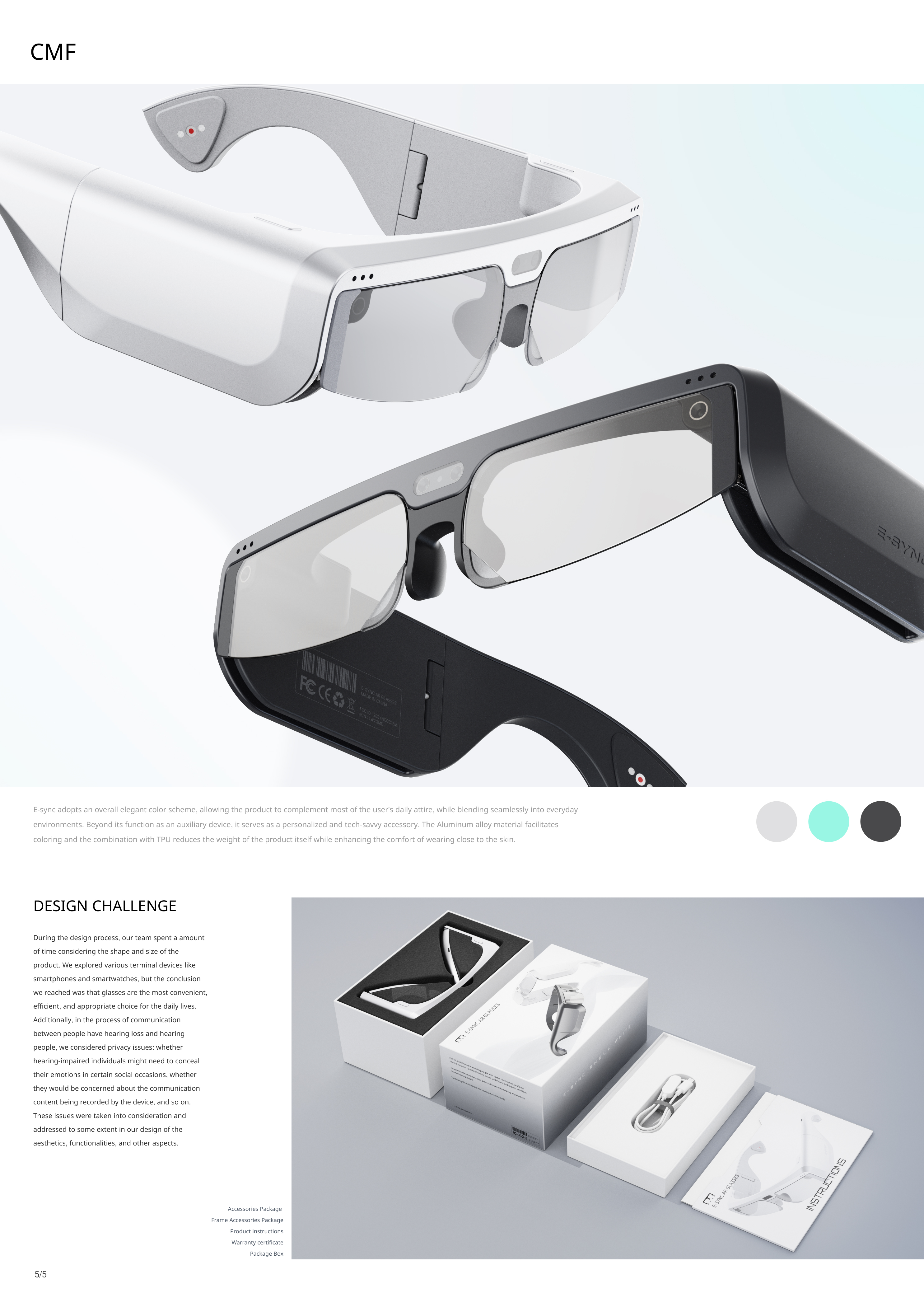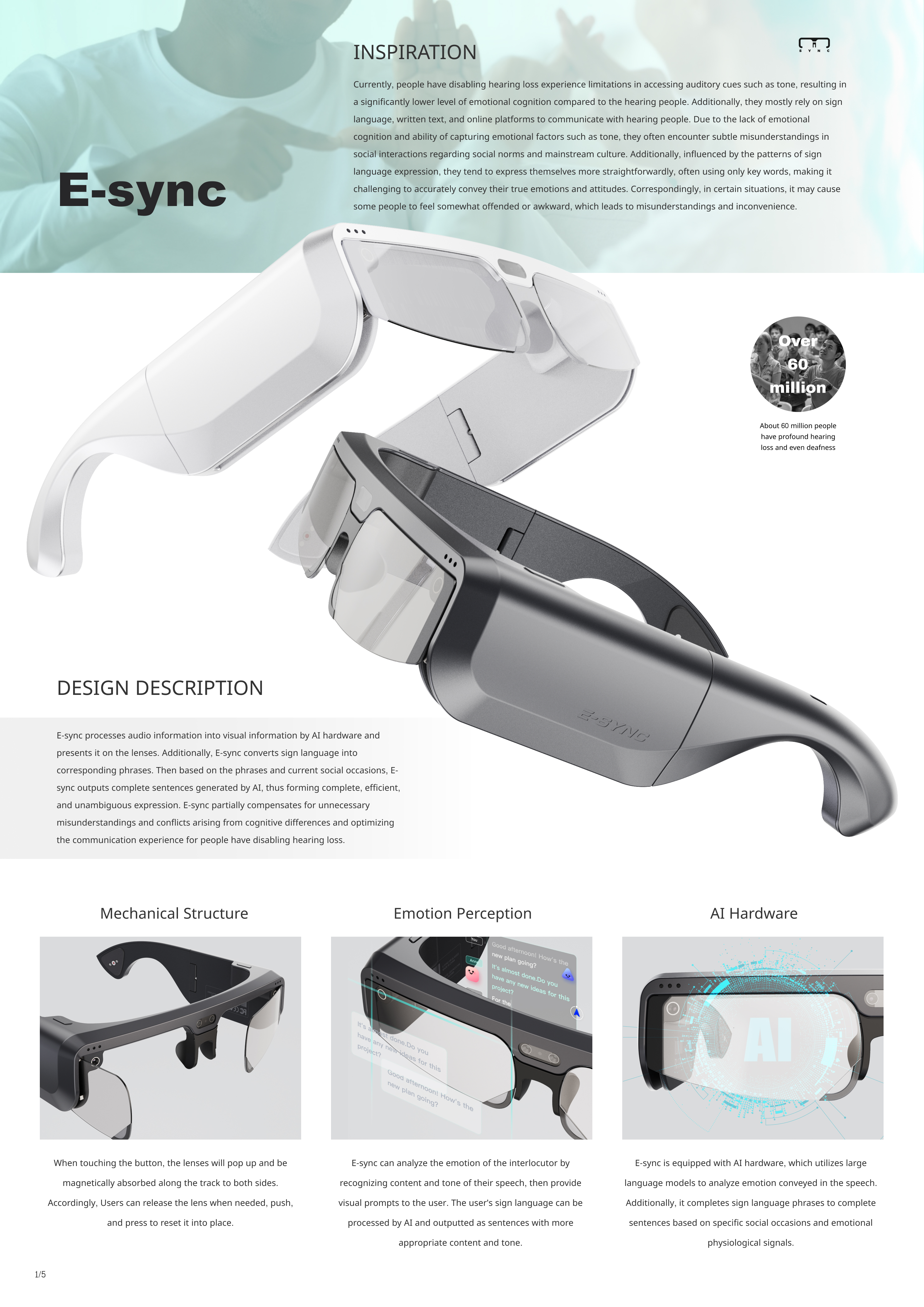 E-sync is a pair of AR smart glasses designed for people hearing impaired people, primarily aimed at improving their ability to recognize speech emotions and effectively convey their own feelings in interpersonal communication. Due to their severe hearing loss, hearing impaired people face limitations in perceiving auditory cues such as tone and thus have a significantly lower level of emotional understanding compared to hearing people. Additionally, their frequency of social interactions is much lower than that of hearing people, leading to potential misunderstandings regarding social norms and mainstream culture. In terms of expression, they primarily rely on sign language, written text, and online platforms to communicate with people, which limits the emotional expression in their communication. Furthermore, many individuals with hearing impairments are influenced by sign language expression forms, often expressing only brief and straightforward keywords, making it difficult to convey their true emotions and attitudes accurately. Consequently, it may cause some people to feel somewhat offended or awkward, resulting in misunderstandings and inconvenience in certain situations.