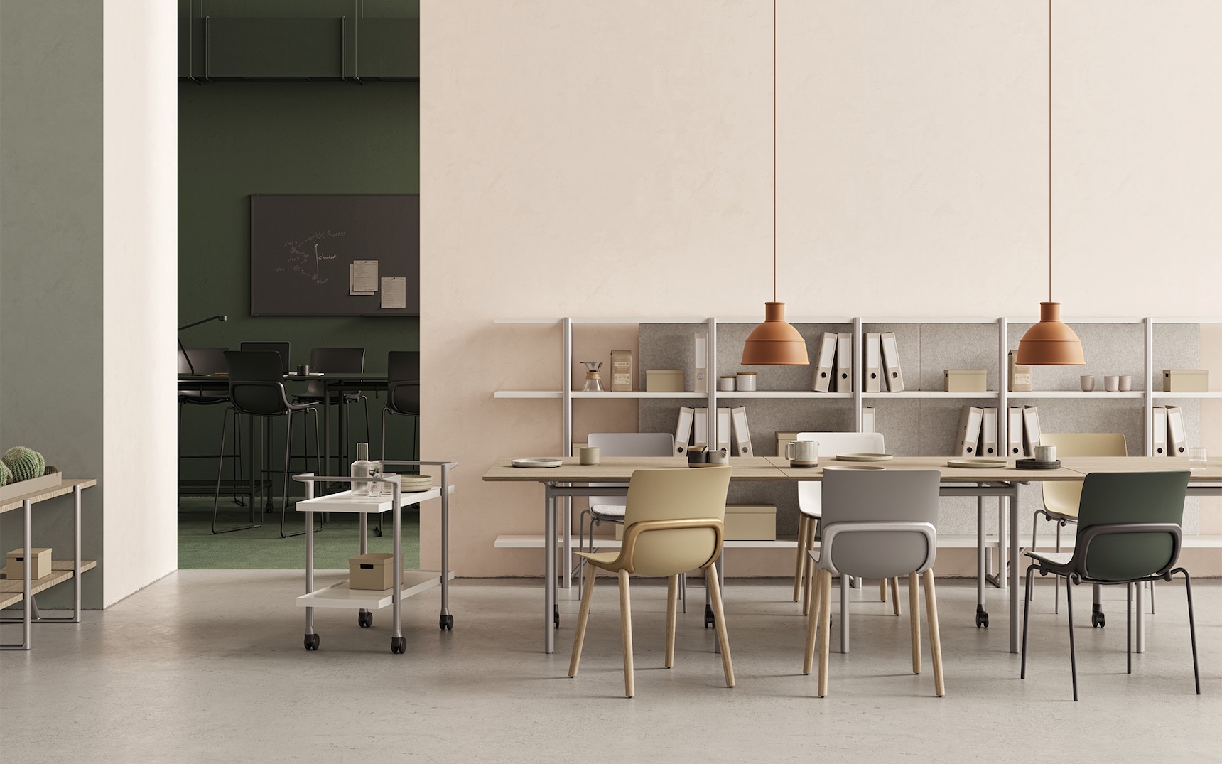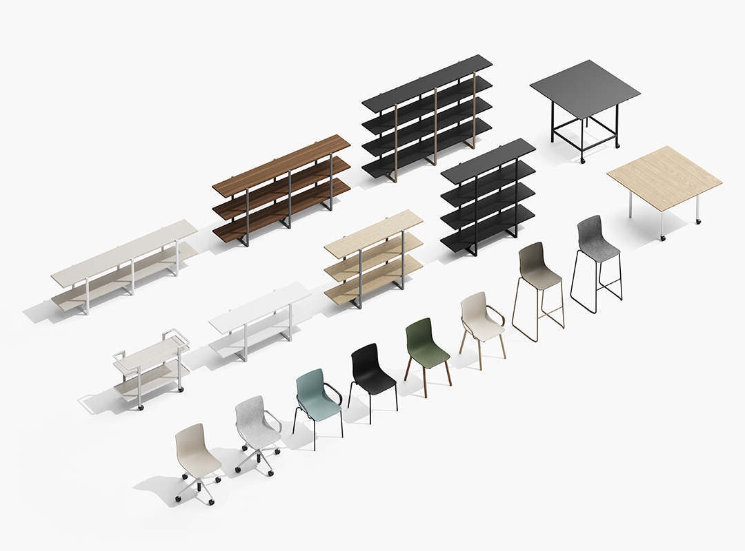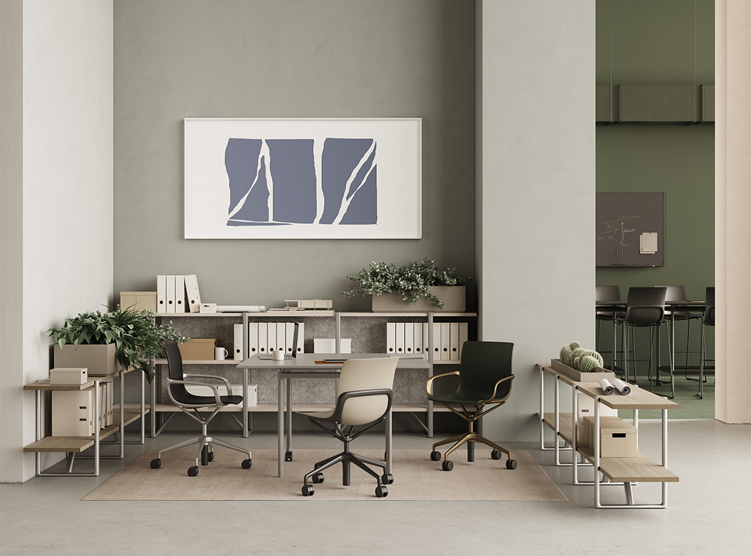 Epix's shelving provides a number of practical solutions that expands the collection’s applications. They provide a visual divide and, with the addition of knockout, movable felt panels, physical and auditory privacy as well. Understanding that employees tend to congregate around the tools they need, a mobile cart was added to the collection – allowing tools be brought in and out with ease to spaces better designed for congregation.
