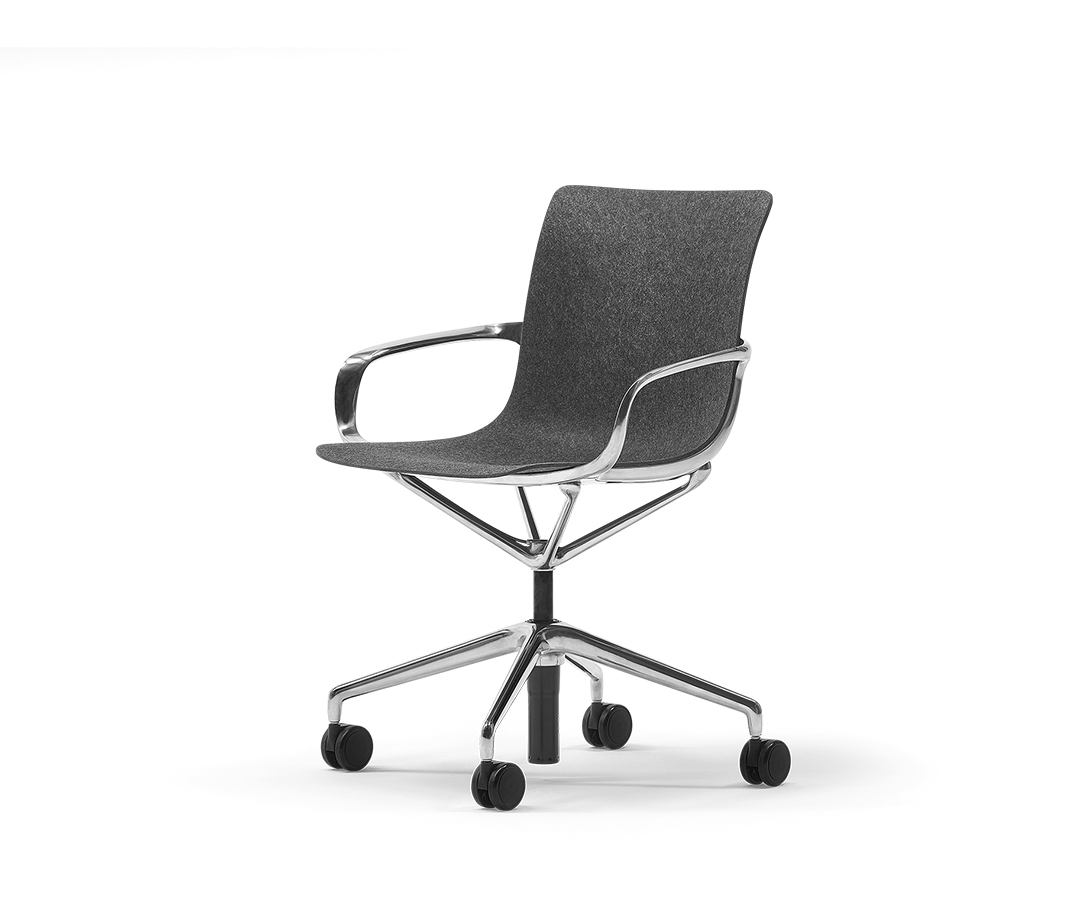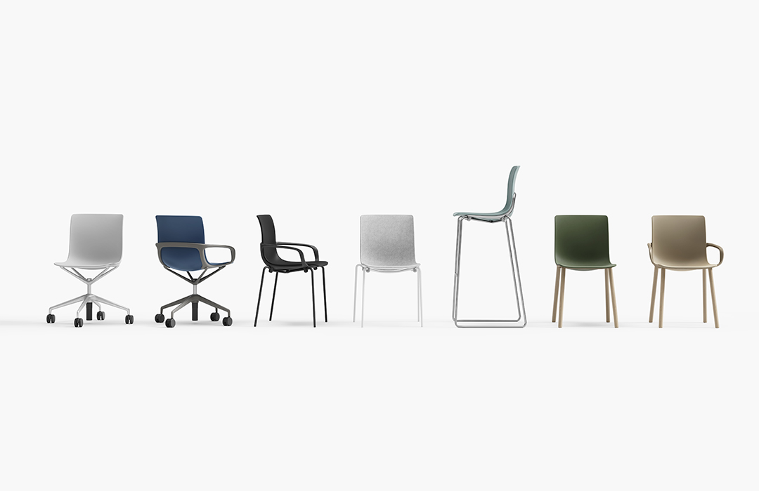 A pure aluminum frame is the base for all Epix chair options, providing strength and support to the formed seat shells. The pure aluminum skeleton holds the shape of the seat shell, which allows for the shell to be made in two pure material options: polypropylene plastic or PET felt. The usage of only pure materials in the construction of the Epix chair allows for seating that is not only comfortable, but fully recyclable. Epix chairs are available in a variety of base options and come in conference, counter, and bar heights.