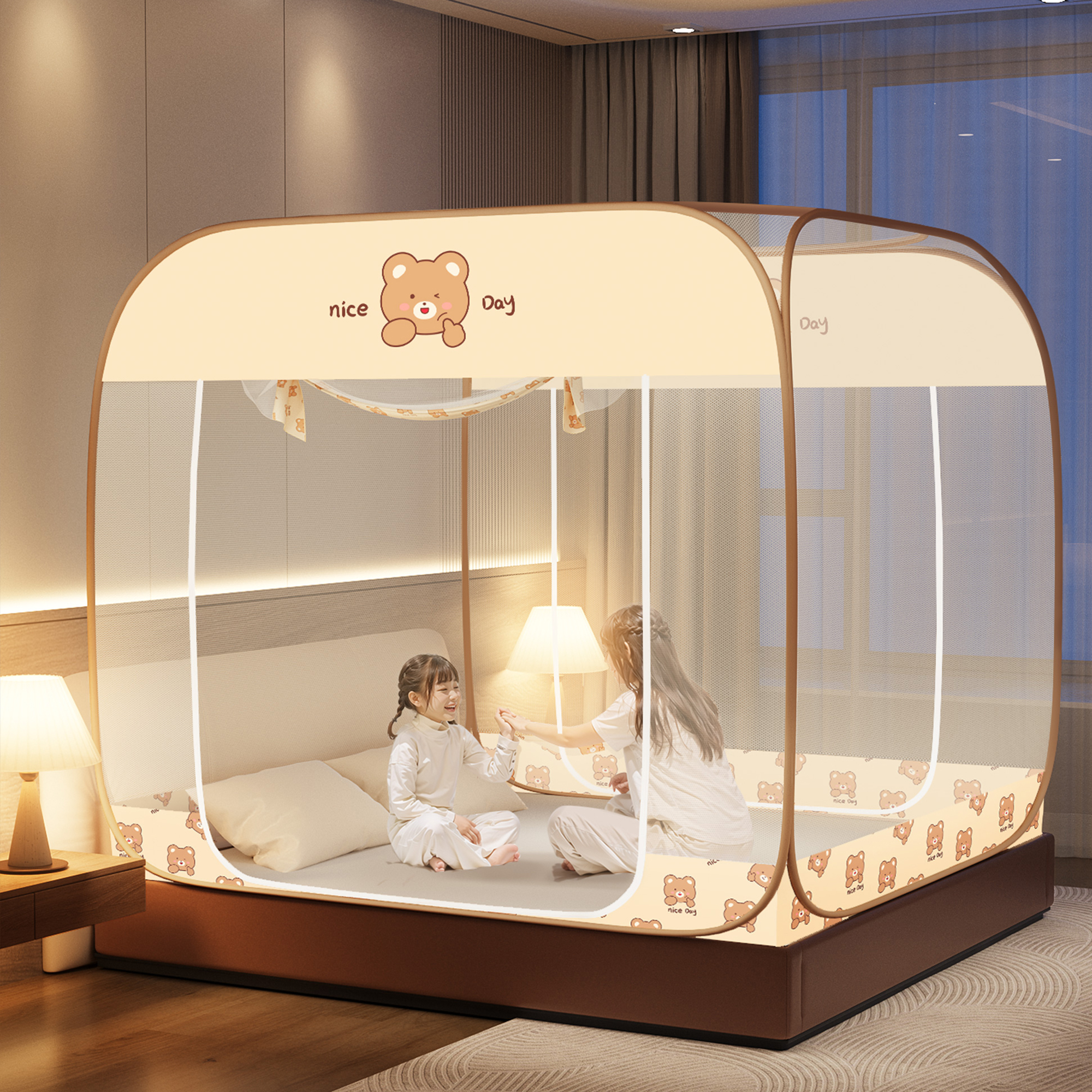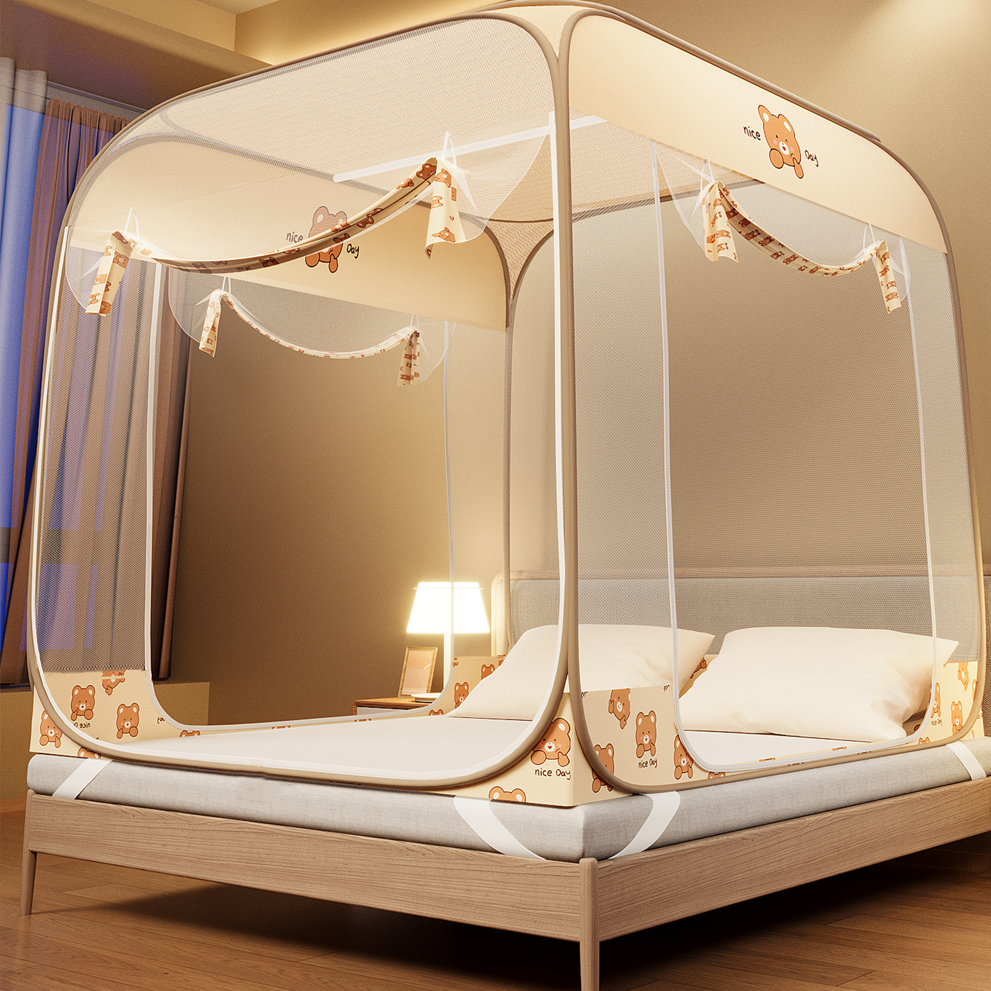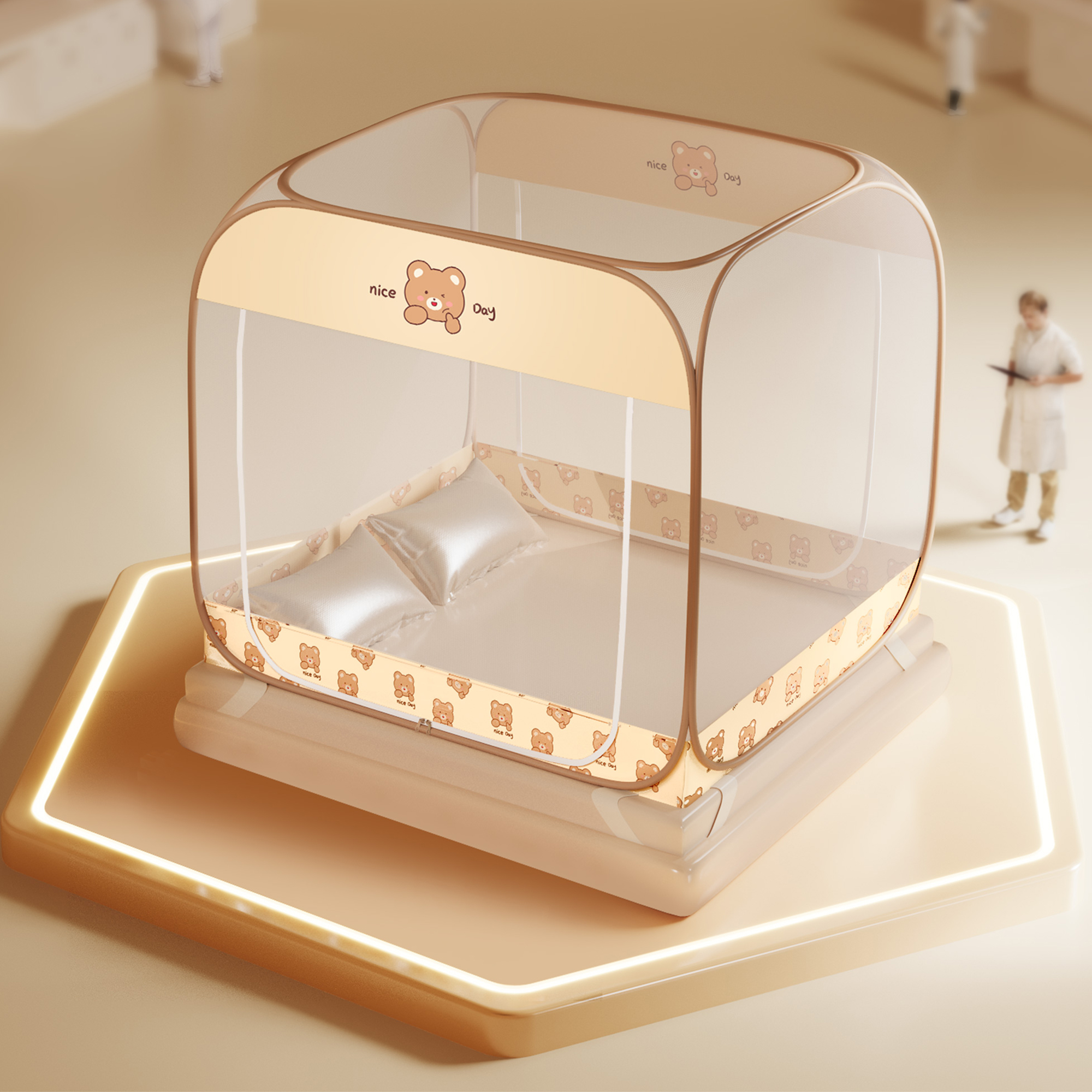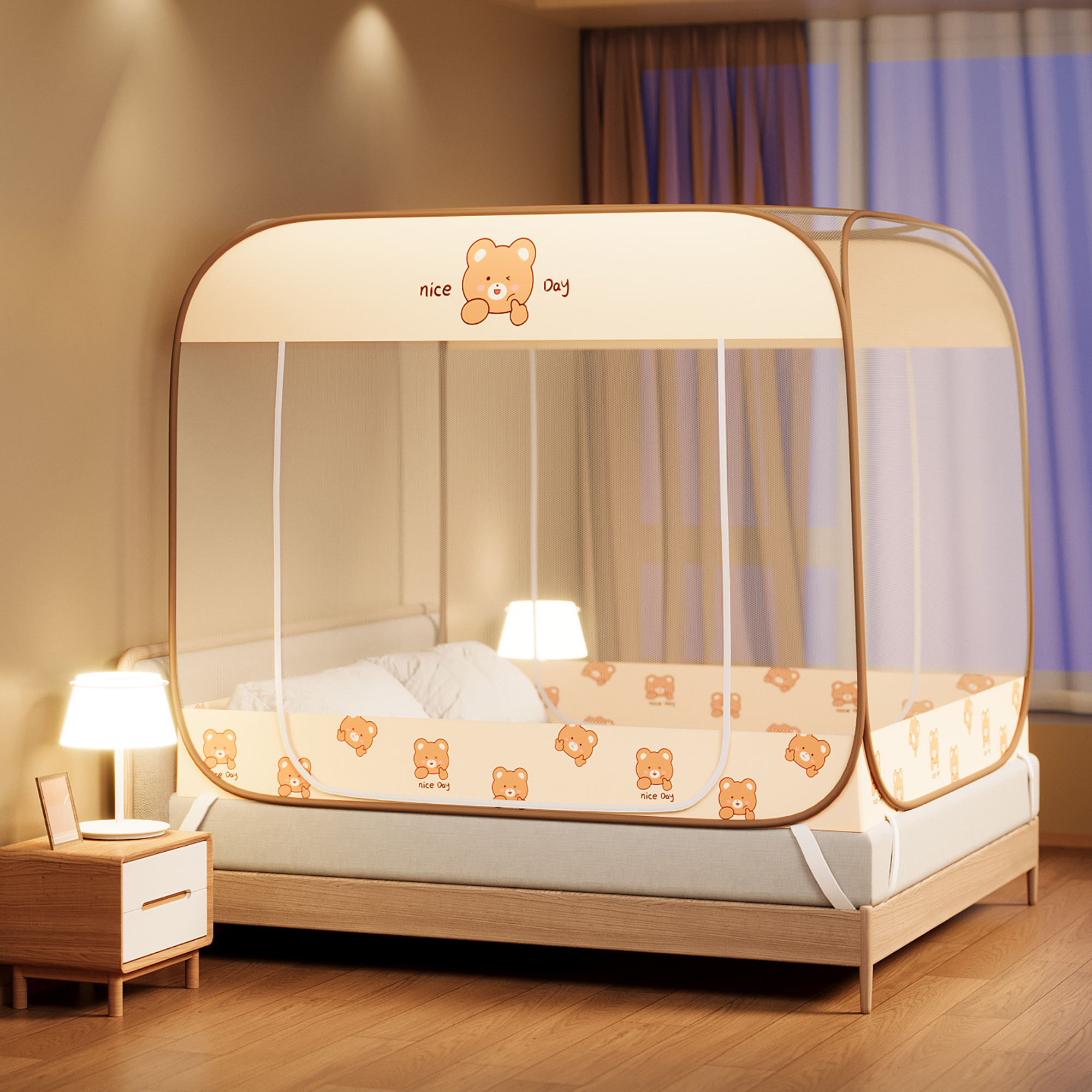 Composed of mosquito net yarn and mosquito-proof fabric, this mosquito net features a main structure supported by highly resilient steel wire, offering excellent usability as it only needs to be unfolded to take shape. This installation-free design eliminates the need for users to assemble the product and can be quickly folded for storage when not in use.