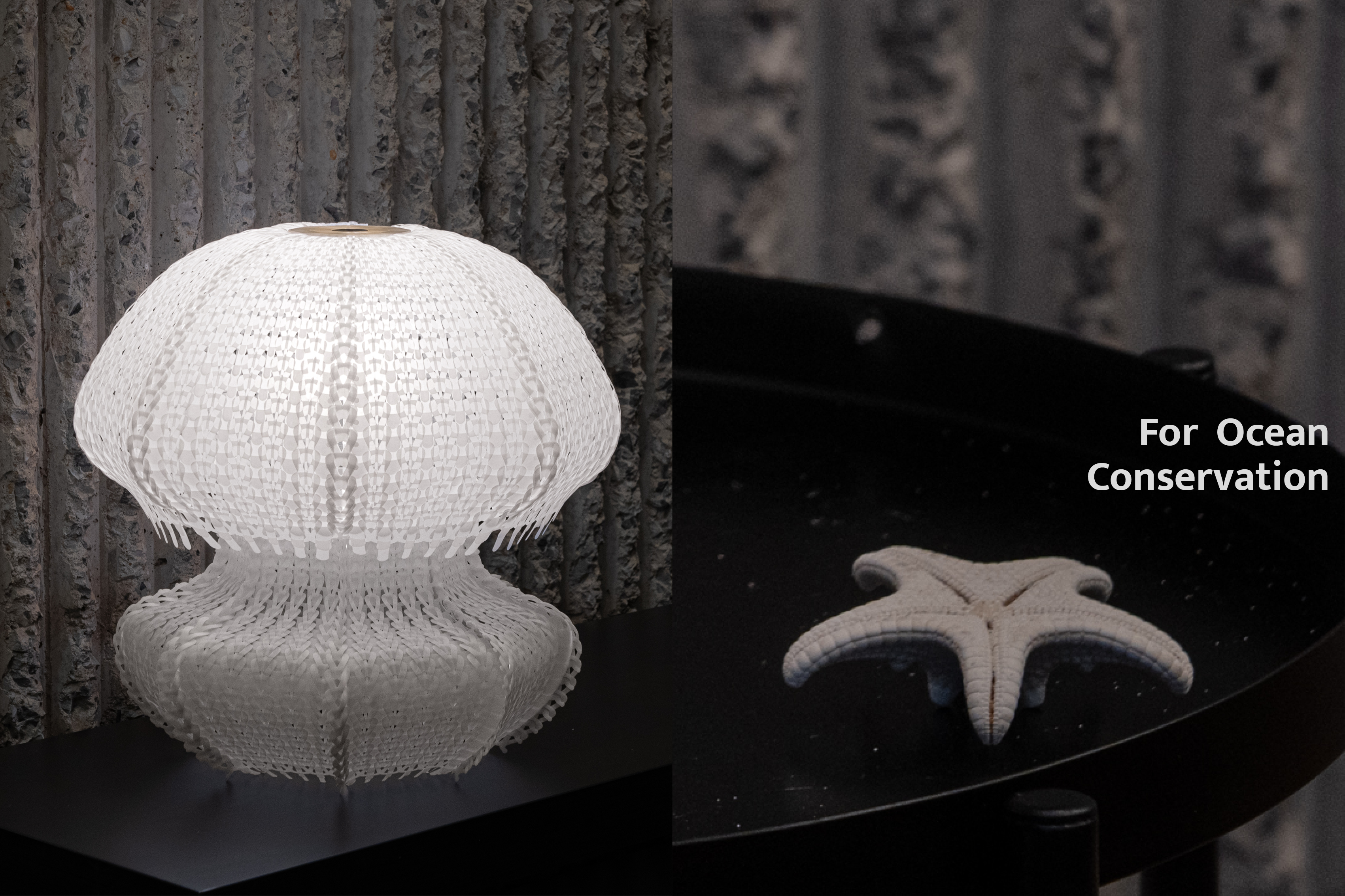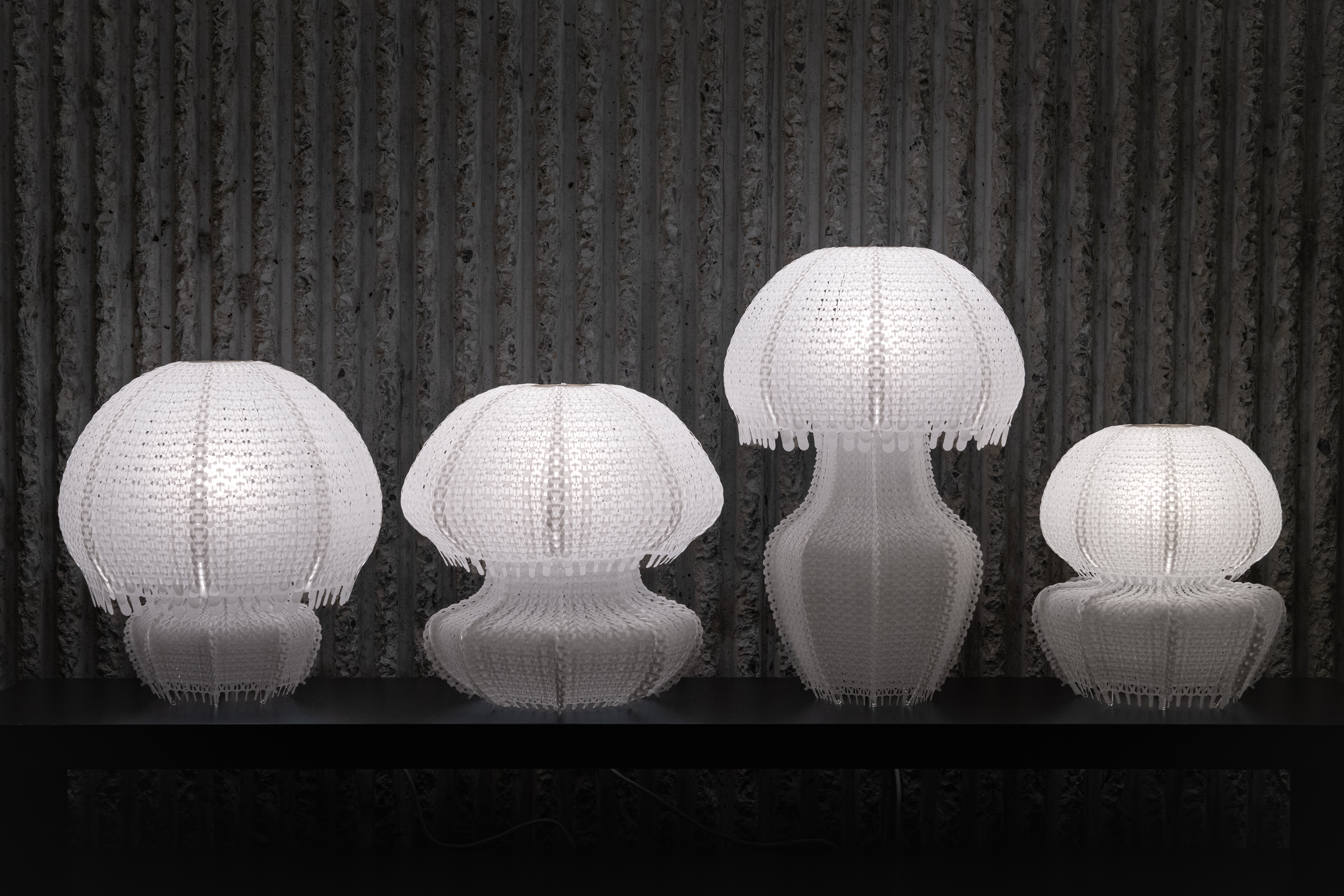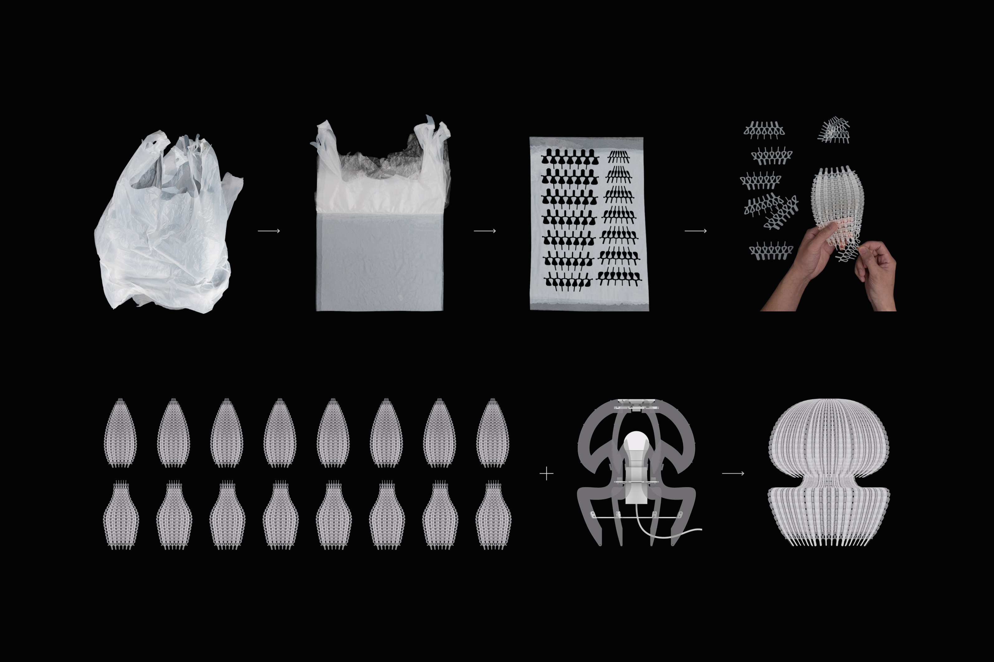 Polycycle Illumination is a collection of lamps crafted from upcycled Polyethylene (PE) plastic bags, aiming to promote a safer ocean for marine life. Annually, approximately 500 billion to 1 trillion plastic bags are used globally, with an estimated 1% to 3% of them eventually entering the ocean. Due to their translucent film texture, discarded plastic bags drifting in the ocean resemble jellyfish, deceiving sea turtles and other marine animals into ingesting them. This ingestion can result in digestive issues and death among marine animals. Polycycle Illumination addresses this threat by harnessing the flexibility, translucency, and thermoplasticity of discarded PE plastic bags. Through upcycling, layers of discarded plastic bags are fused via heat pressing into flexible, translucent plastic sheets, which are then fabricated into elegant, jellyfish-shaped table lamps. The aim is to extend the lifespan of plastic materials, reduce oceanic plastic waste, and foster a healthier marine ecological environment.