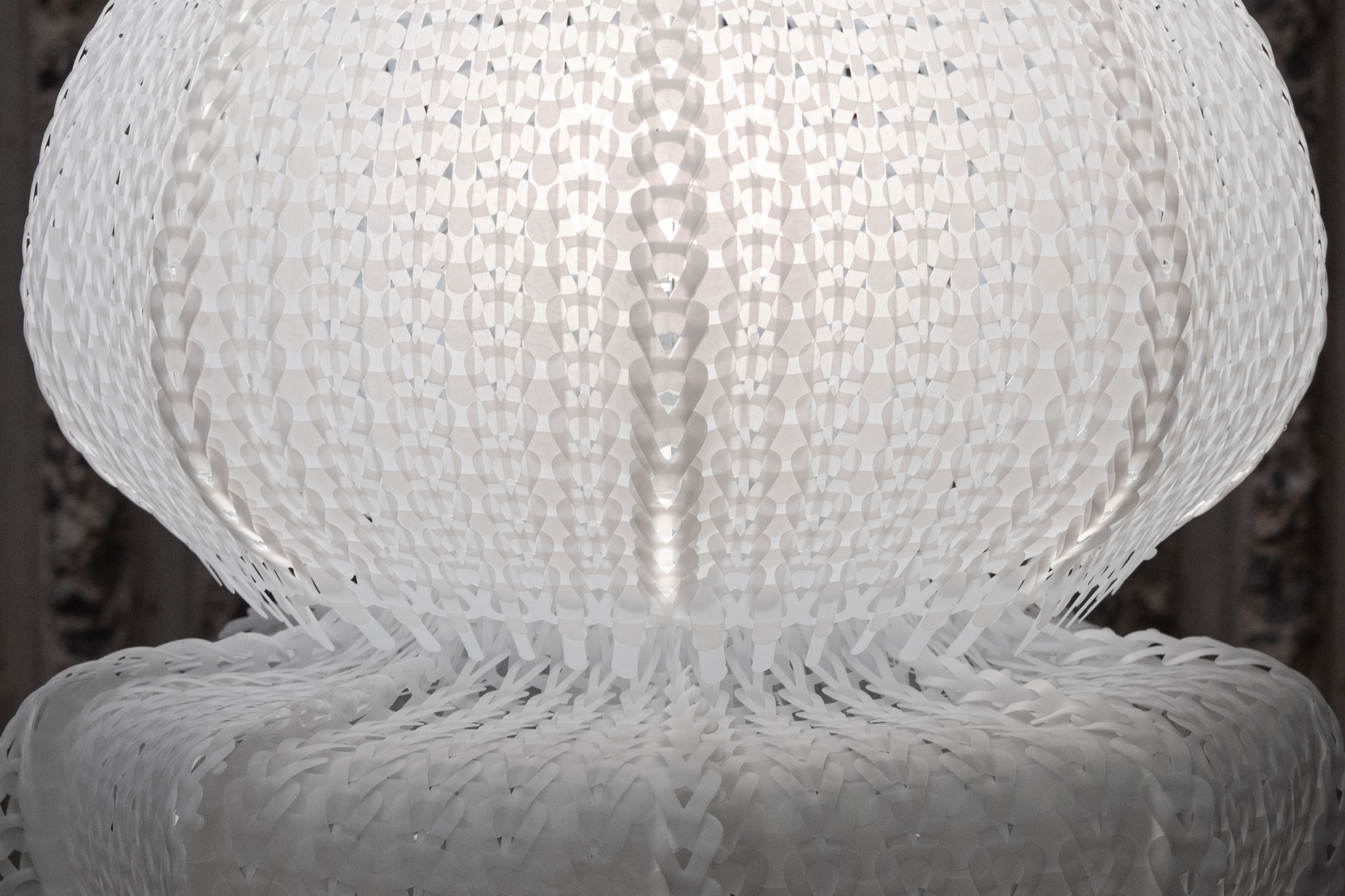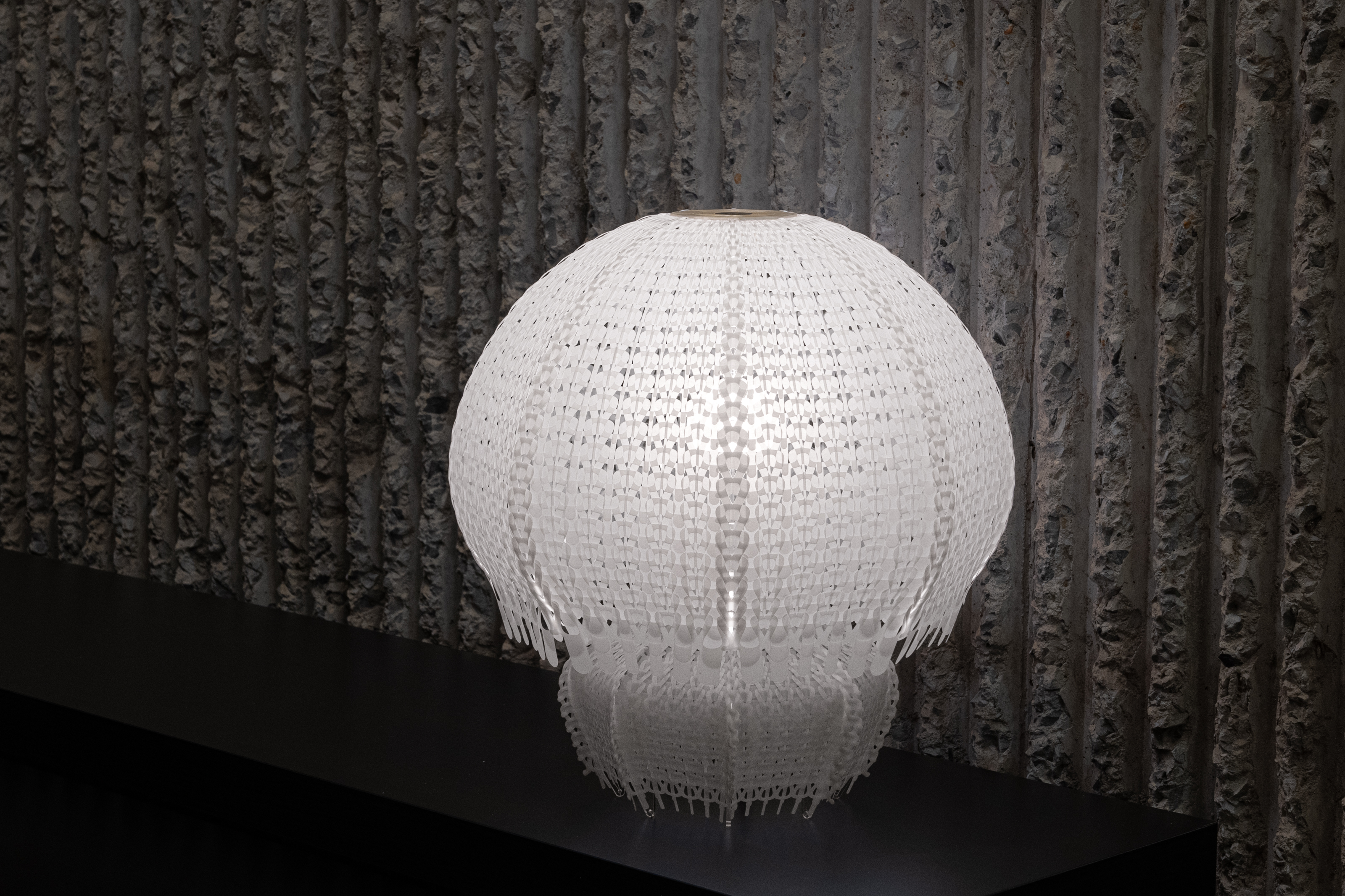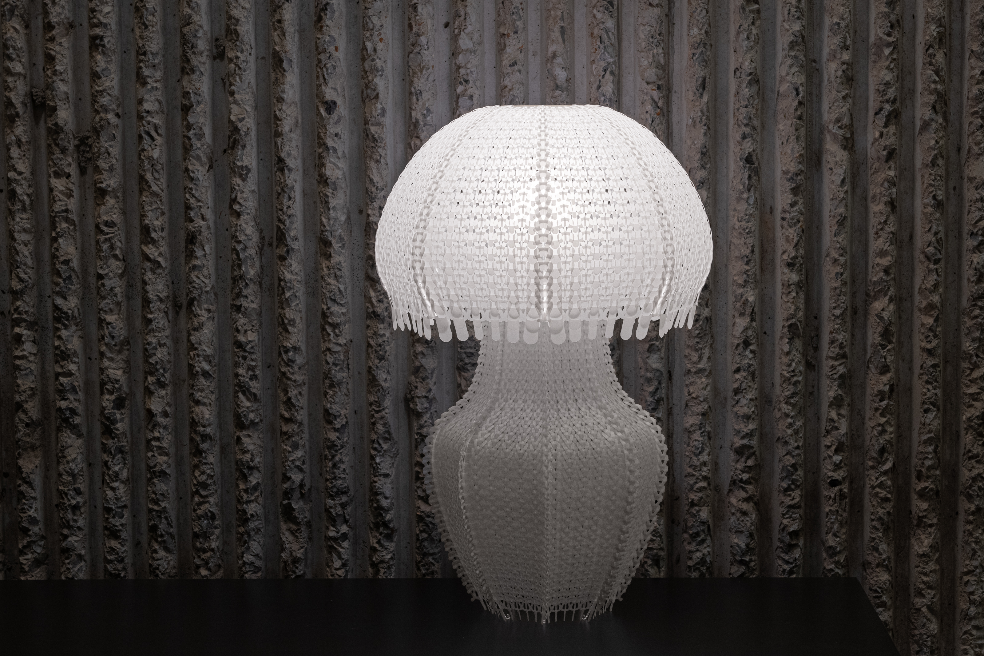 Polycycle Illumination is a collection of lamps crafted from upcycled Polyethylene (PE) plastic bags, aiming to promote a safer ocean for marine life. Annually, approximately 500 billion to 1 trillion plastic bags are used globally, with an estimated 1% to 3% of them eventually entering the ocean. Due to their translucent film texture, discarded plastic bags drifting in the ocean resemble jellyfish, deceiving sea turtles and other marine animals into ingesting them. This ingestion can result in digestive issues and death among marine animals. Polycycle Illumination addresses this threat by harnessing the flexibility, translucency, and thermoplasticity of discarded PE plastic bags. Through upcycling, layers of discarded plastic bags are fused via heat pressing into flexible, translucent plastic sheets, which are then fabricated into elegant, jellyfish-shaped table lamps. The aim is to extend the lifespan of plastic materials, reduce oceanic plastic waste, and foster a healthier marine ecological environment.